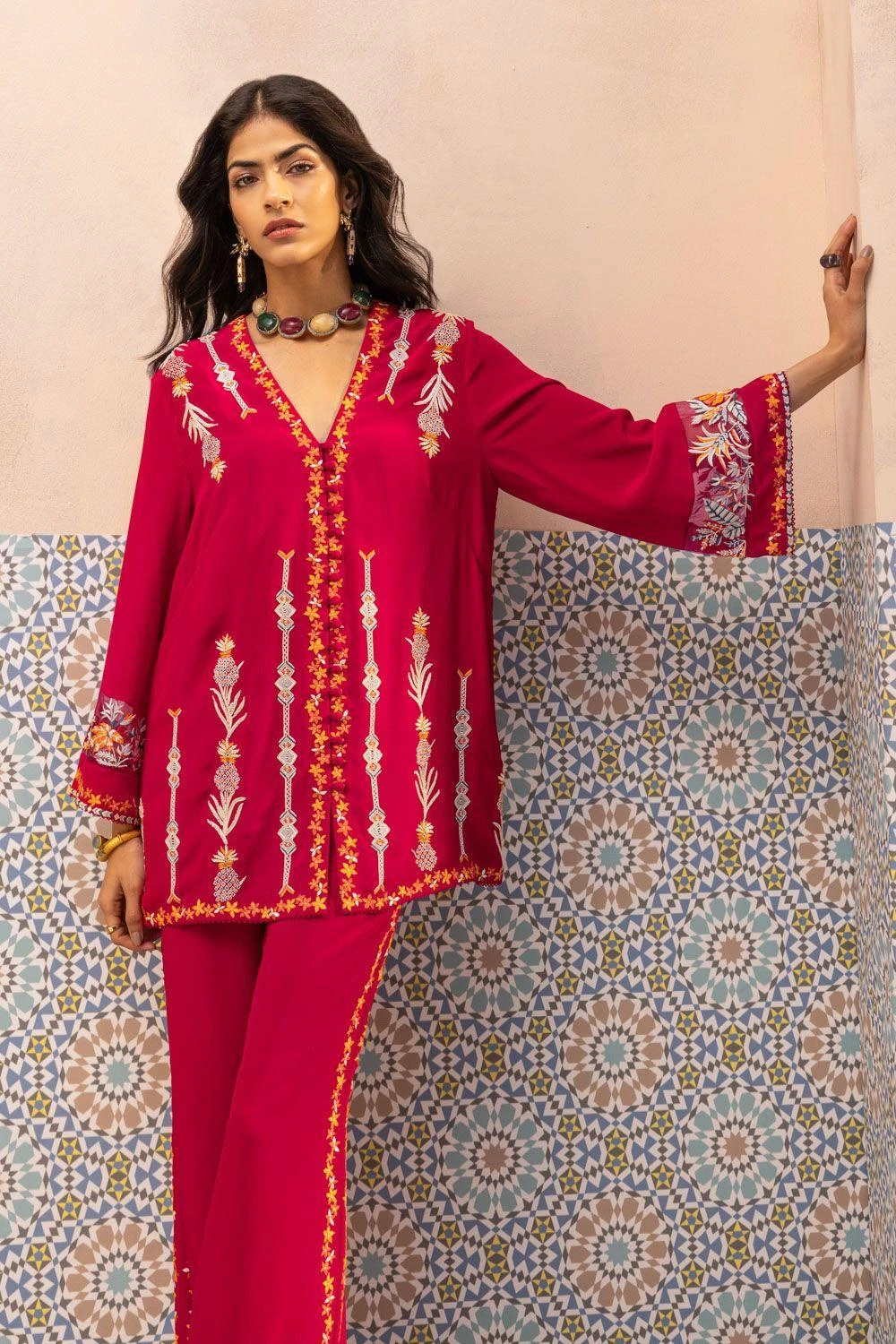 Experience the epitome of craftsmanship with this exquisite thread-embroidered creation. Adorned with ivory katdana accents, delicate techniques like French knots and bullion knots bring life to this pure silk crepe masterpiece.