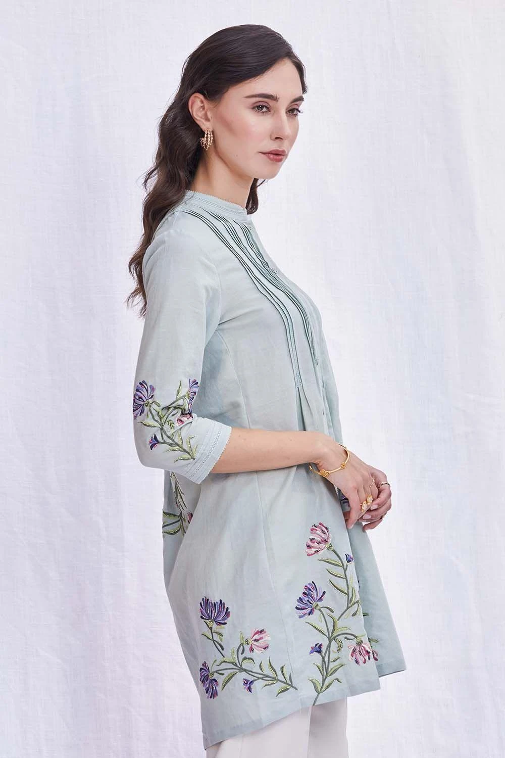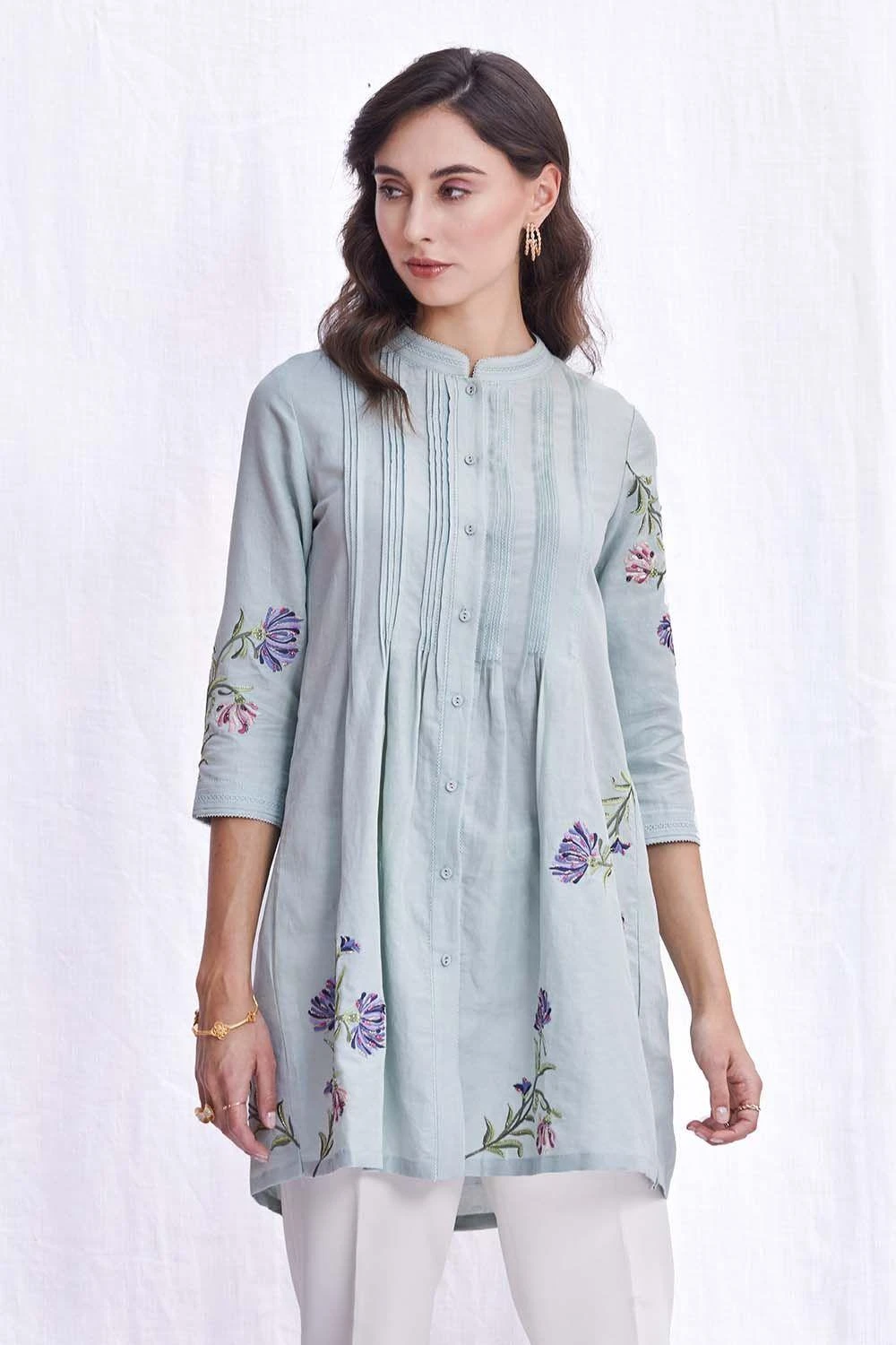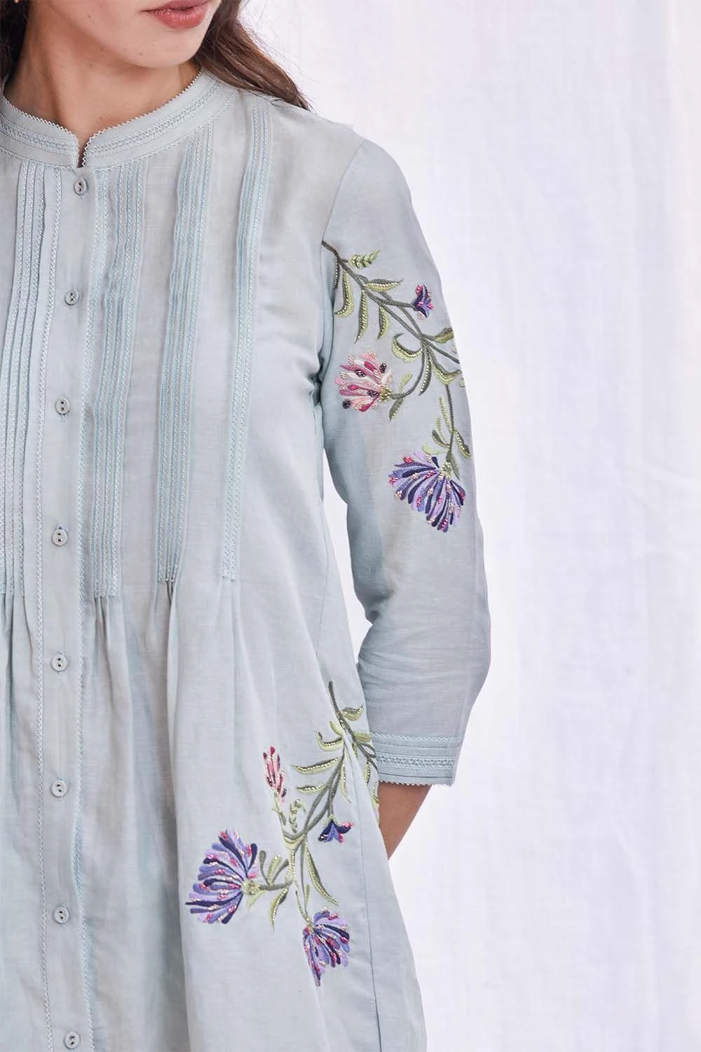 This elegant powder blue pin tuck top is set in cotton linen. With delicate floral gara embroidery this top is dreamy & sophisticated. Style it with flaired pants for a airy & elegant look. This peice is perfect for daytime events.