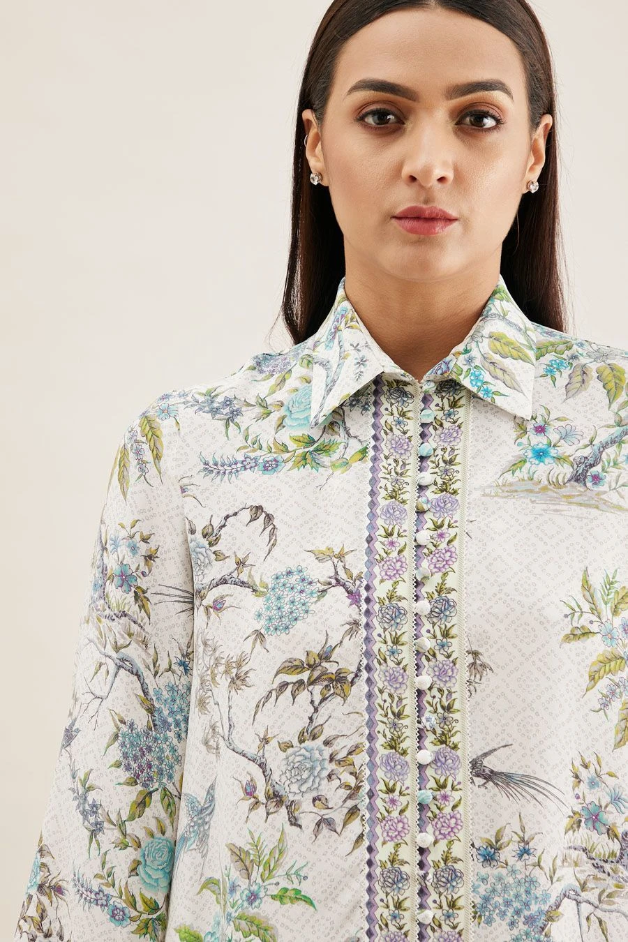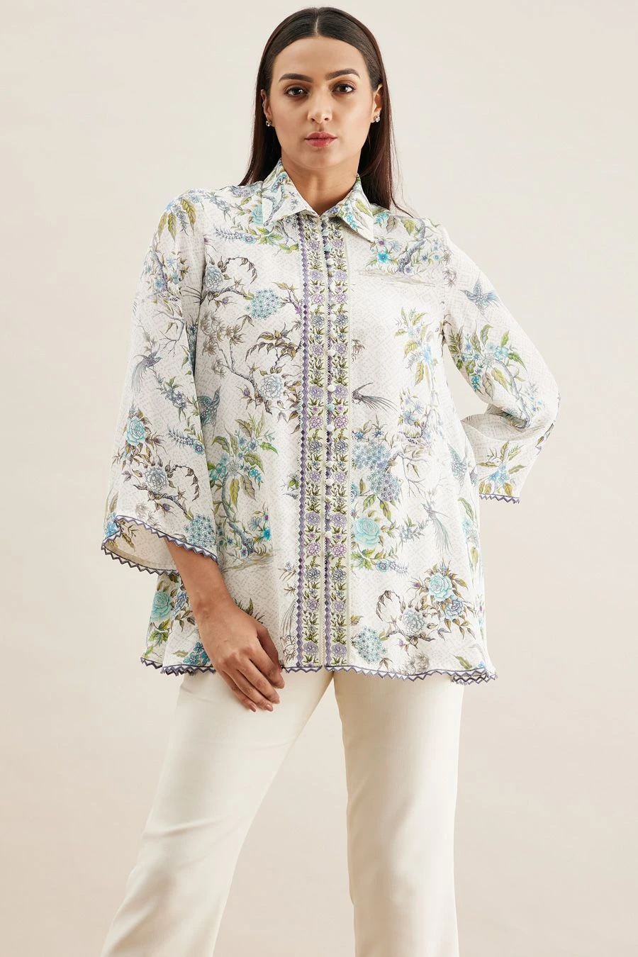 From your work desk to the brunch table & from lounging at home to catching flights, you can always count on this shirt. Crafted in crepe, this top features shikargah print & bell sleeves. Style it with white flared pants to complete the look.