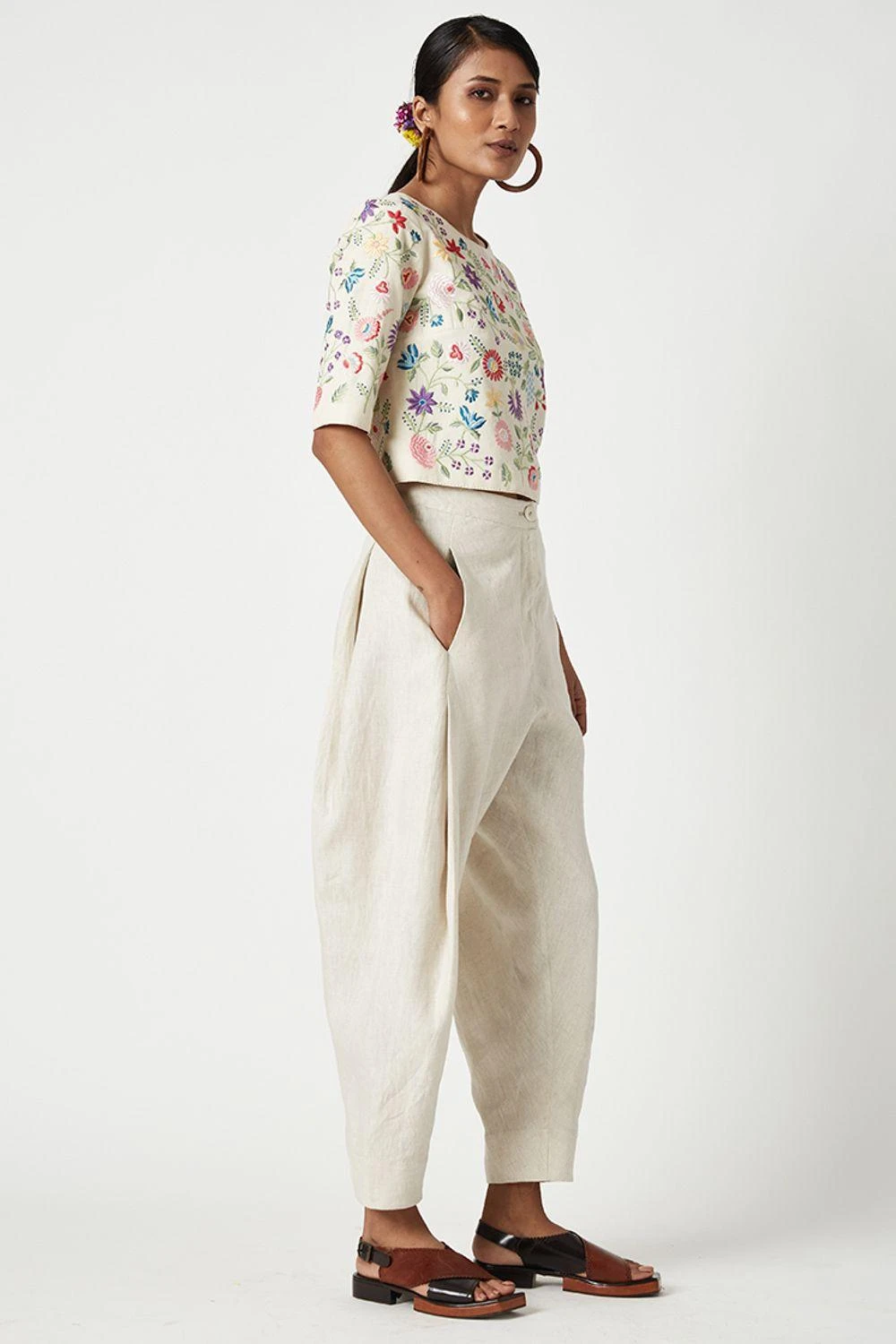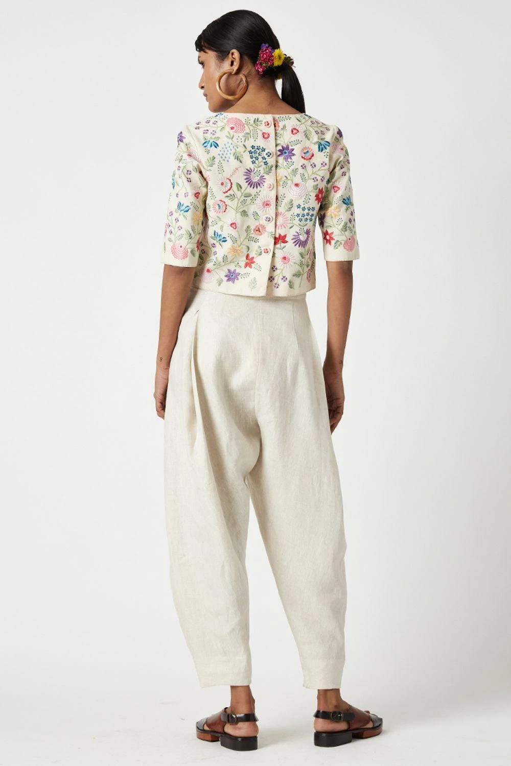 This round neck blouse with three quarter sleeves in beautifully textured Malkha cotton is resplendent with a burst of flowers embroidered in bouquet motives all over.