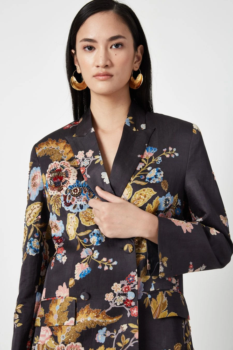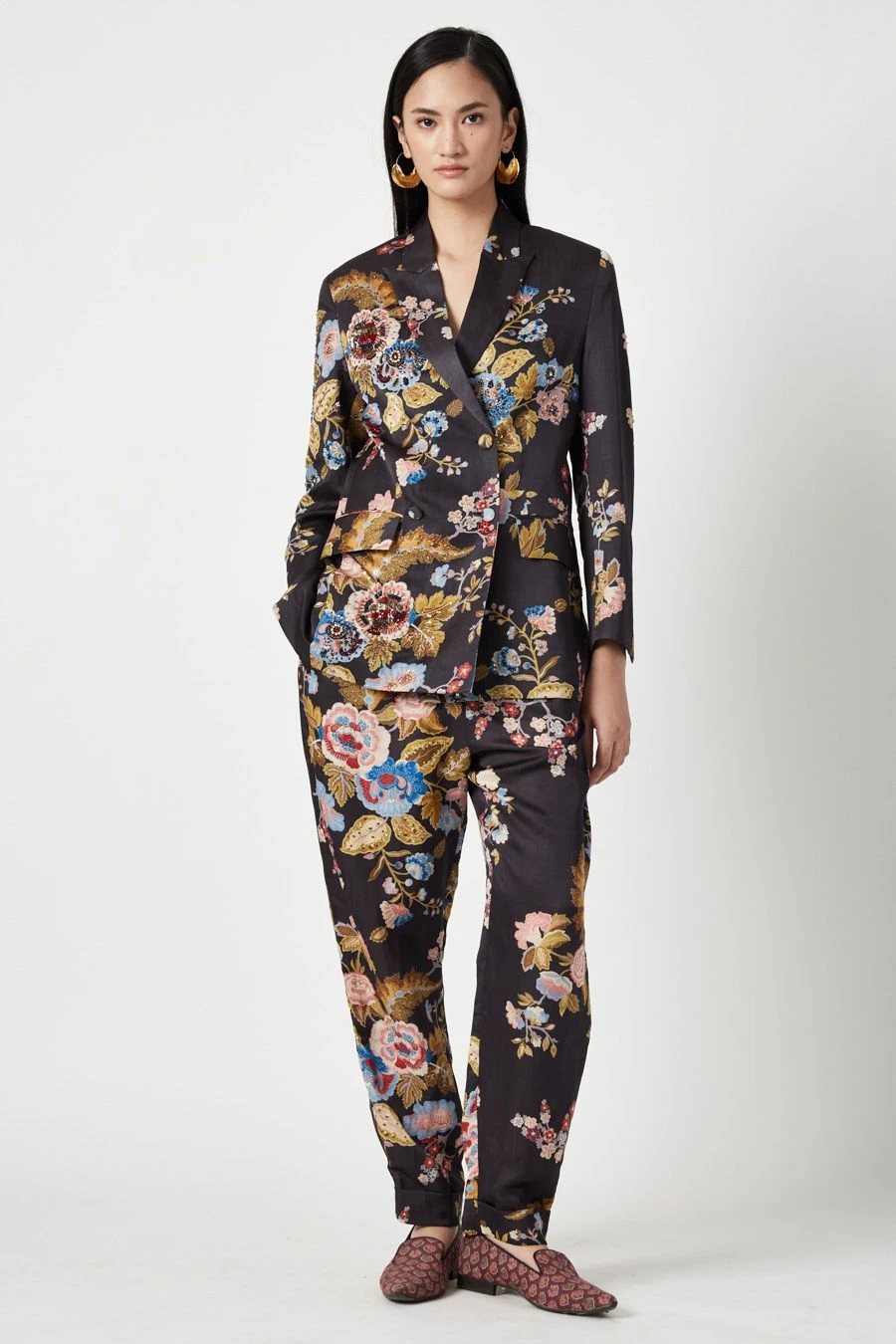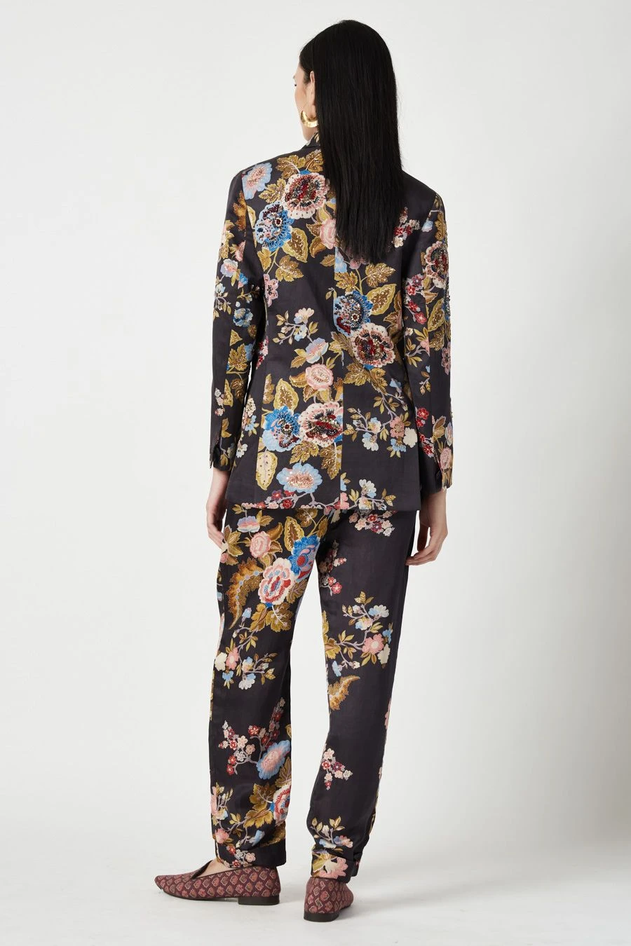 Crafted in linen satin, these straight tailored pants feature a floral print all over. Pair these pants with the Brown Diana Printed & embellished Jacket from the collection to complete the set.
