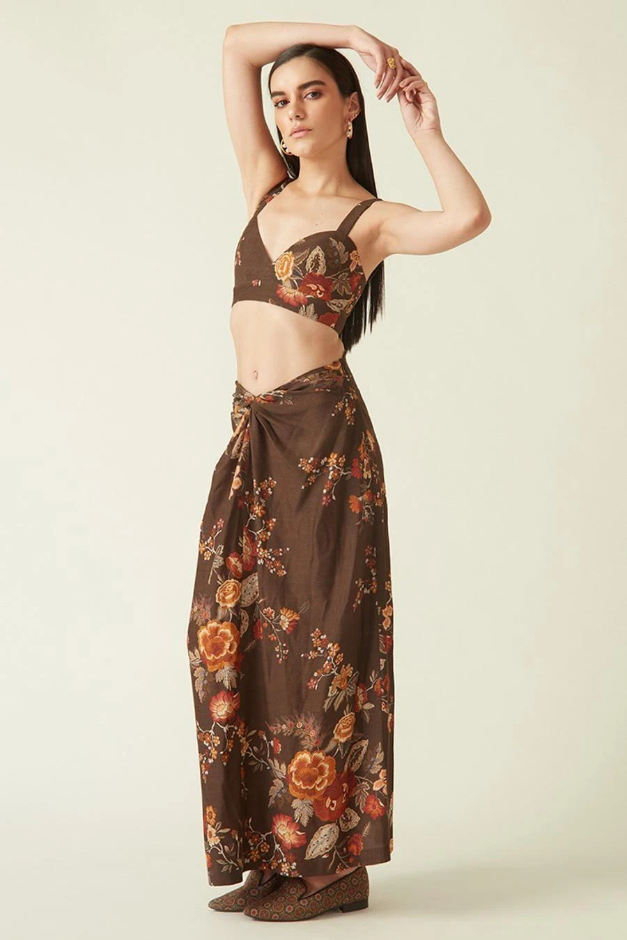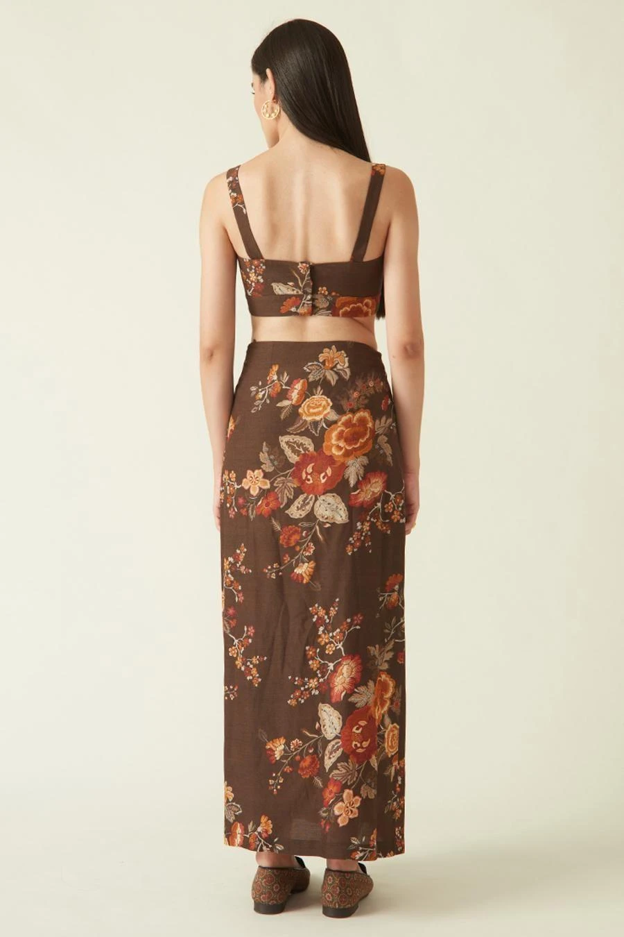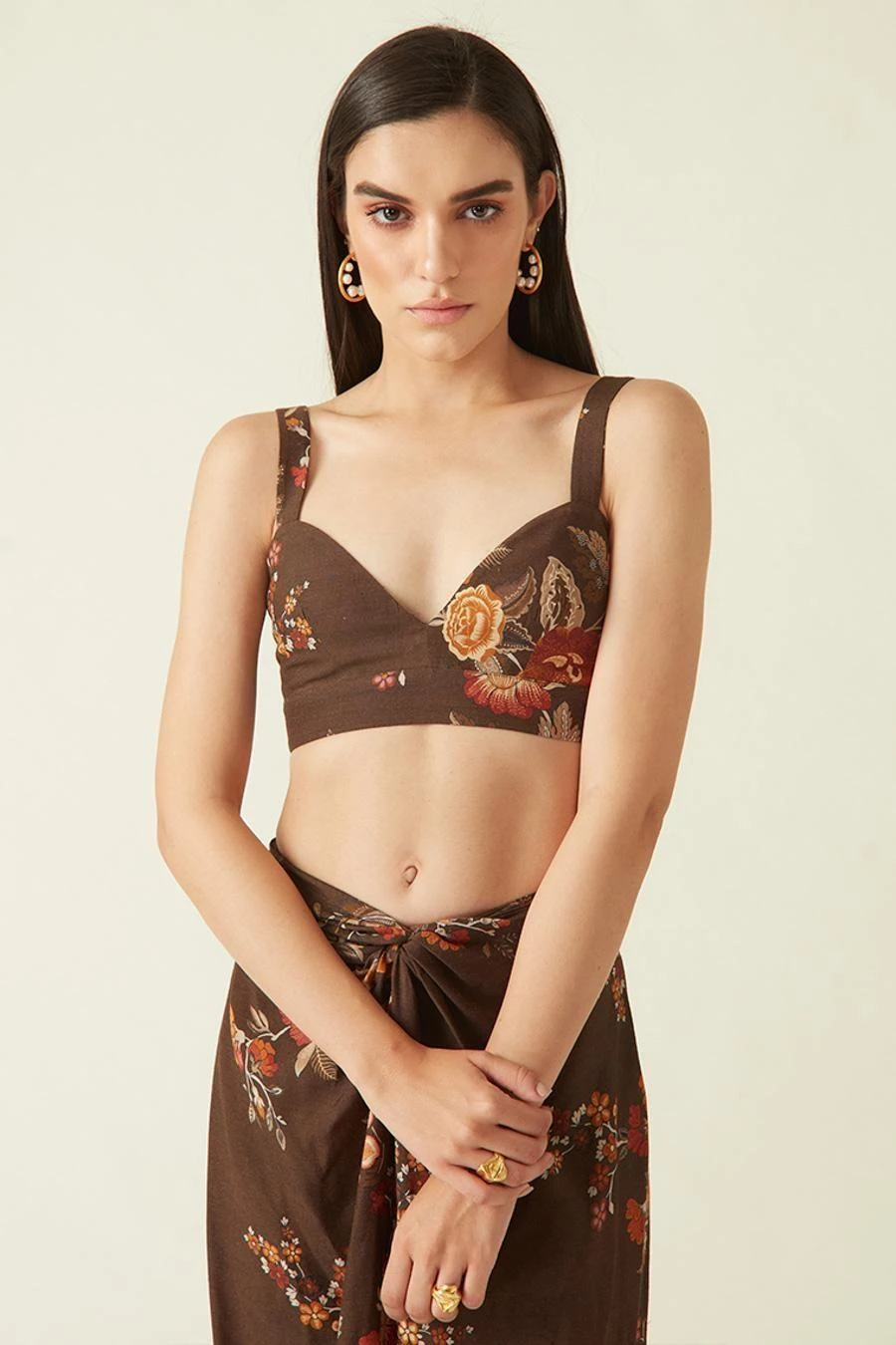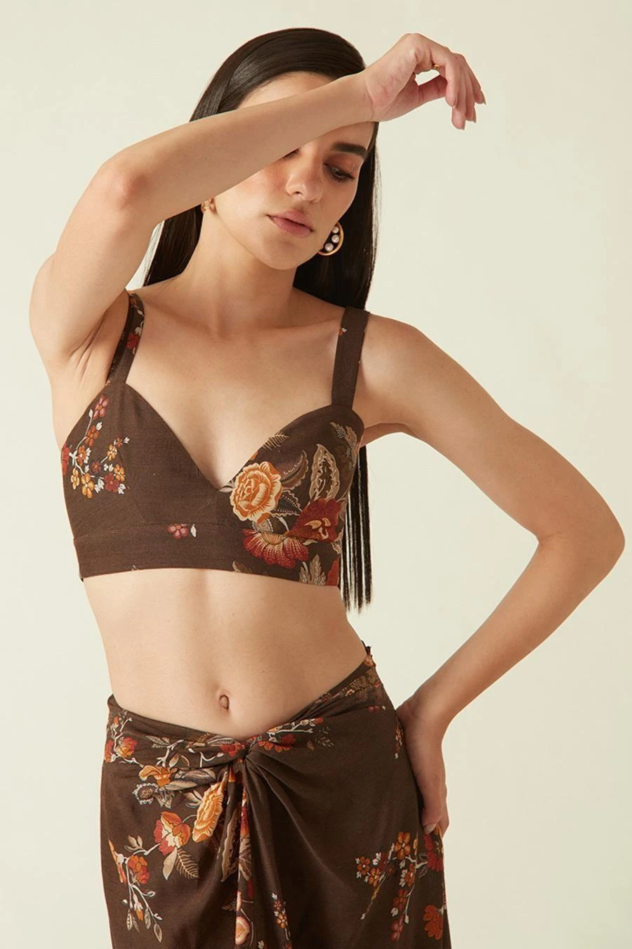 Add a layer of statement & glamour to your resort getaways with this bralette. Crafted in cupro monga silk, this floral printed bustier features hooks at the back. Pair it with the Brown Rinjani printed skirt from the collection to complete the set.