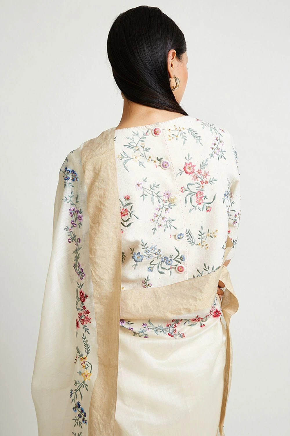 This round neck ecru blouse is set in cotton handloom fabric. It features beautifully textured malkha cotton sleeves enhanced with resplendent flower embroidery. Style it with an ecru sari from Payal Pratap.
