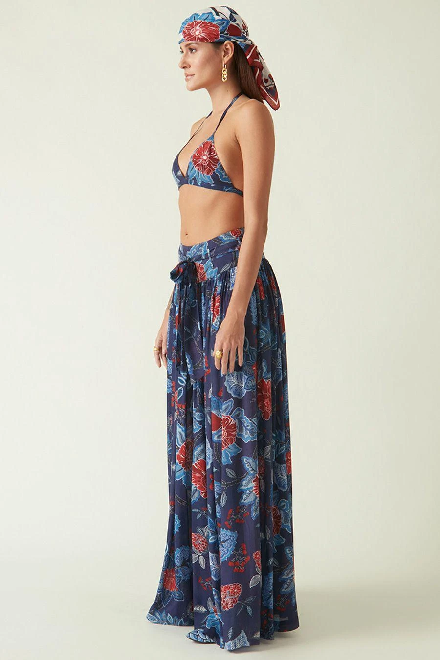 Crafted in modal muslin, these pants fall in the realm of luxe minimalism. These wide-legged flared trousers feature a gathered waist & a botanical print all over. Style them with a bralette or a crop to complete the set.