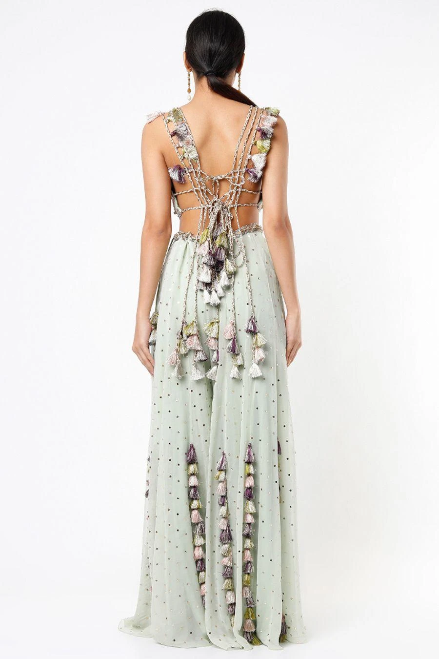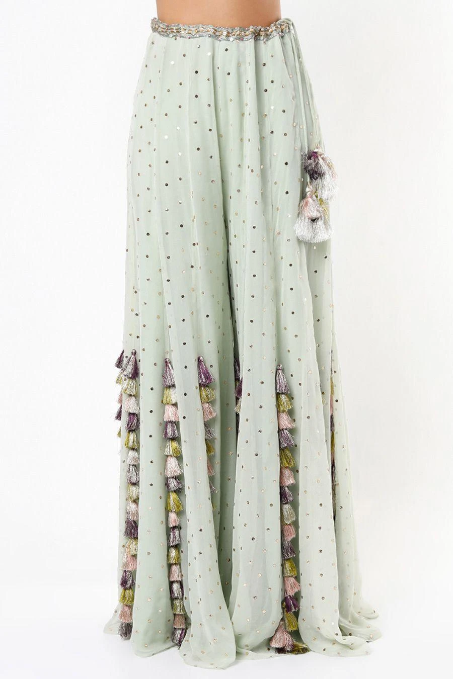 Make an exceptionally stylish bridesmaid at your sister’s or friend’s wedding in this mint sharara set. It features a Payal Singhal signature backless choli with extensive bohemian embroidery and comes along with mukaish georgette sharara.