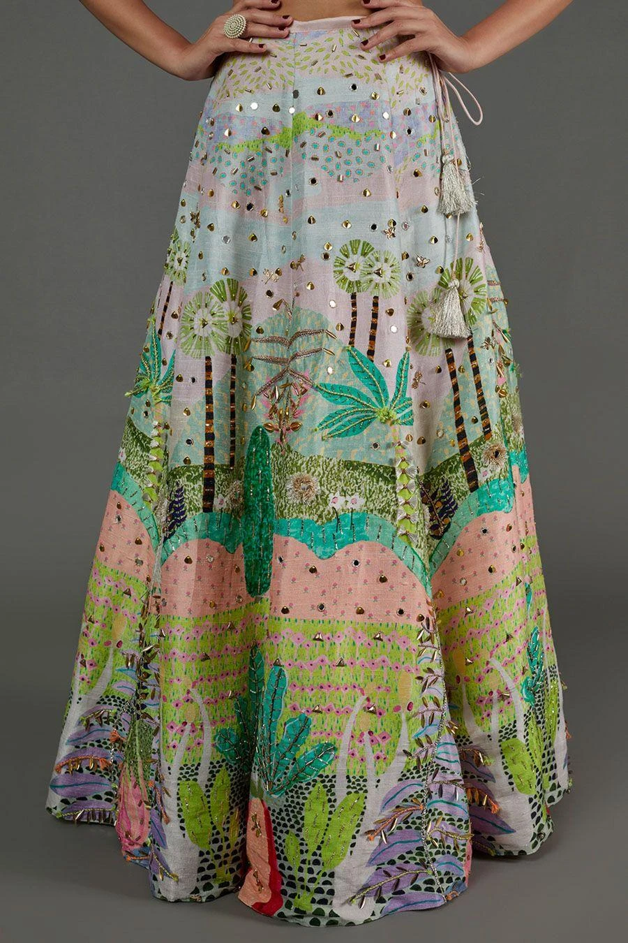 The perfect amalgamation of style & comfort, this lehenga set works across occasions. Crafted in silk & georgette, this set features a tropical printed lehenga paired with an embellished bustier & a mukhaish net dupatta.