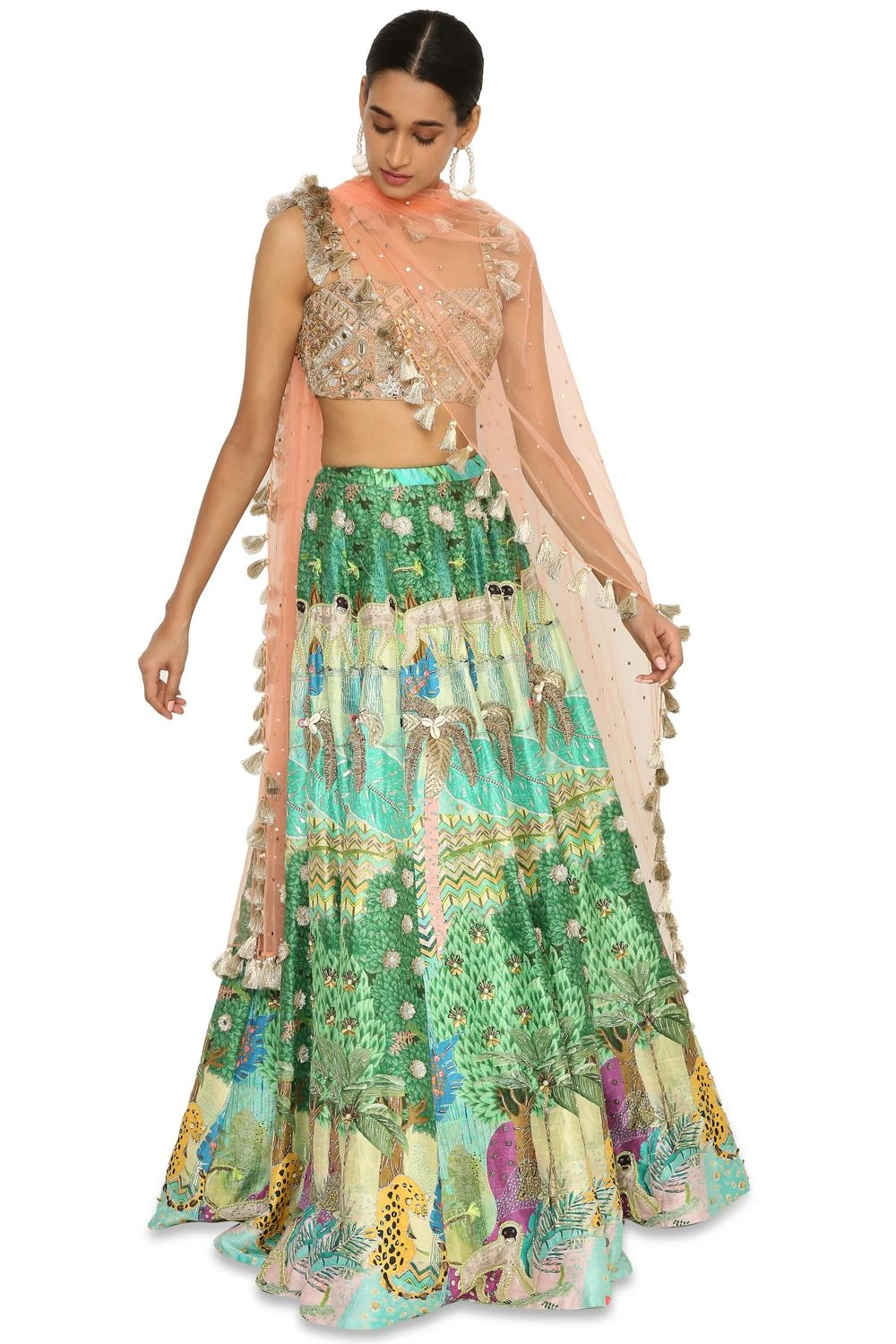 This vibrant lehenga is composed with the notes of the season, in an exuberant trail of prints & embroidery. It comes along with a hamsa embroidered bustier and a peach mukaish net dupatta with tassels.