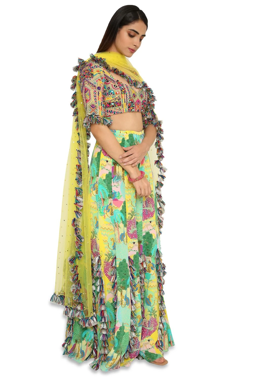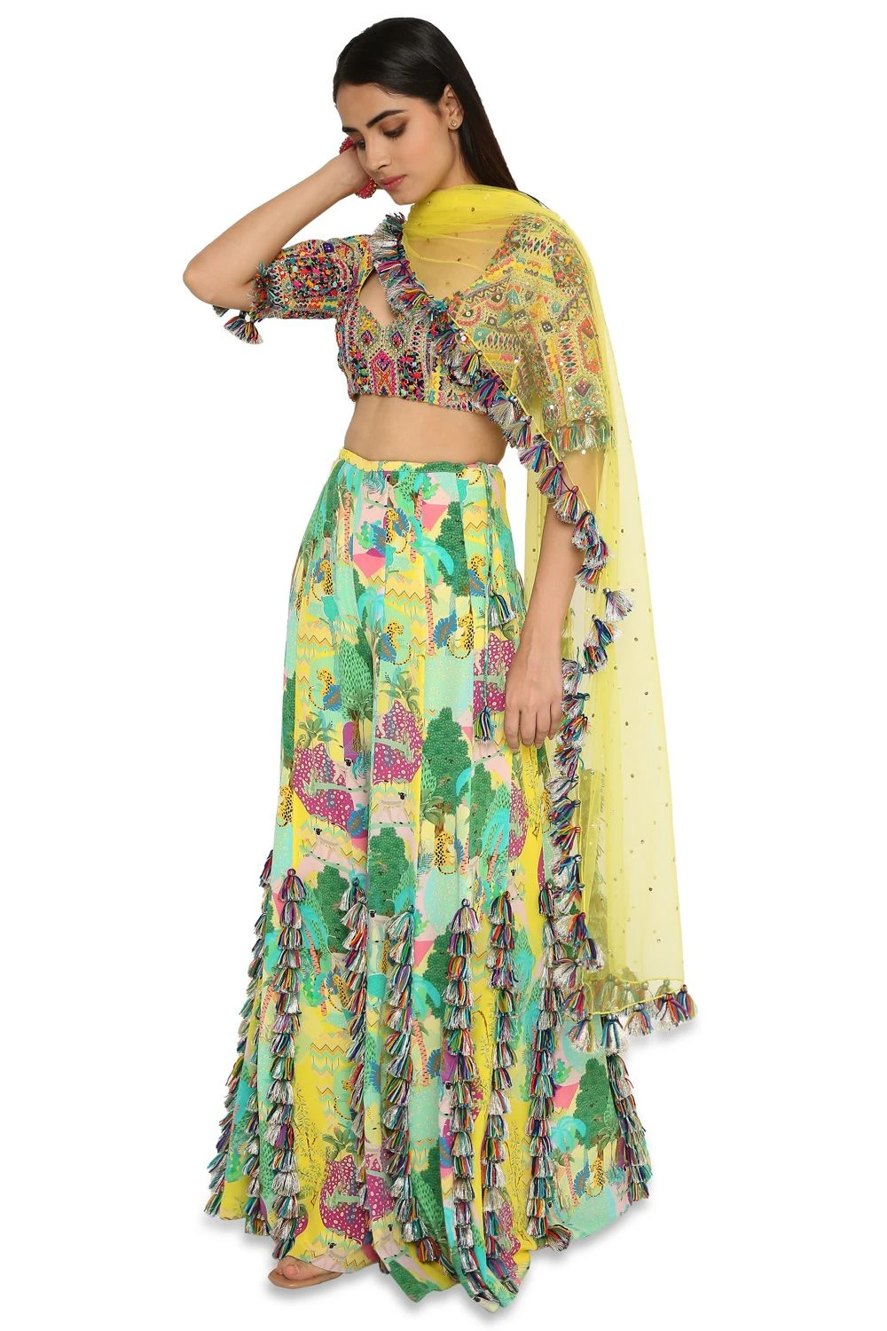 It’s a print party with Payal Singhal’s tropical outfit. It features a yellow coloured embroidered georgette choli with printed crepe sharara pants and a yellow mukaish organza dupatta with tassels.