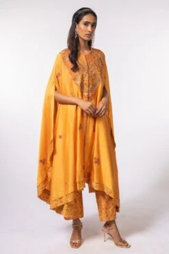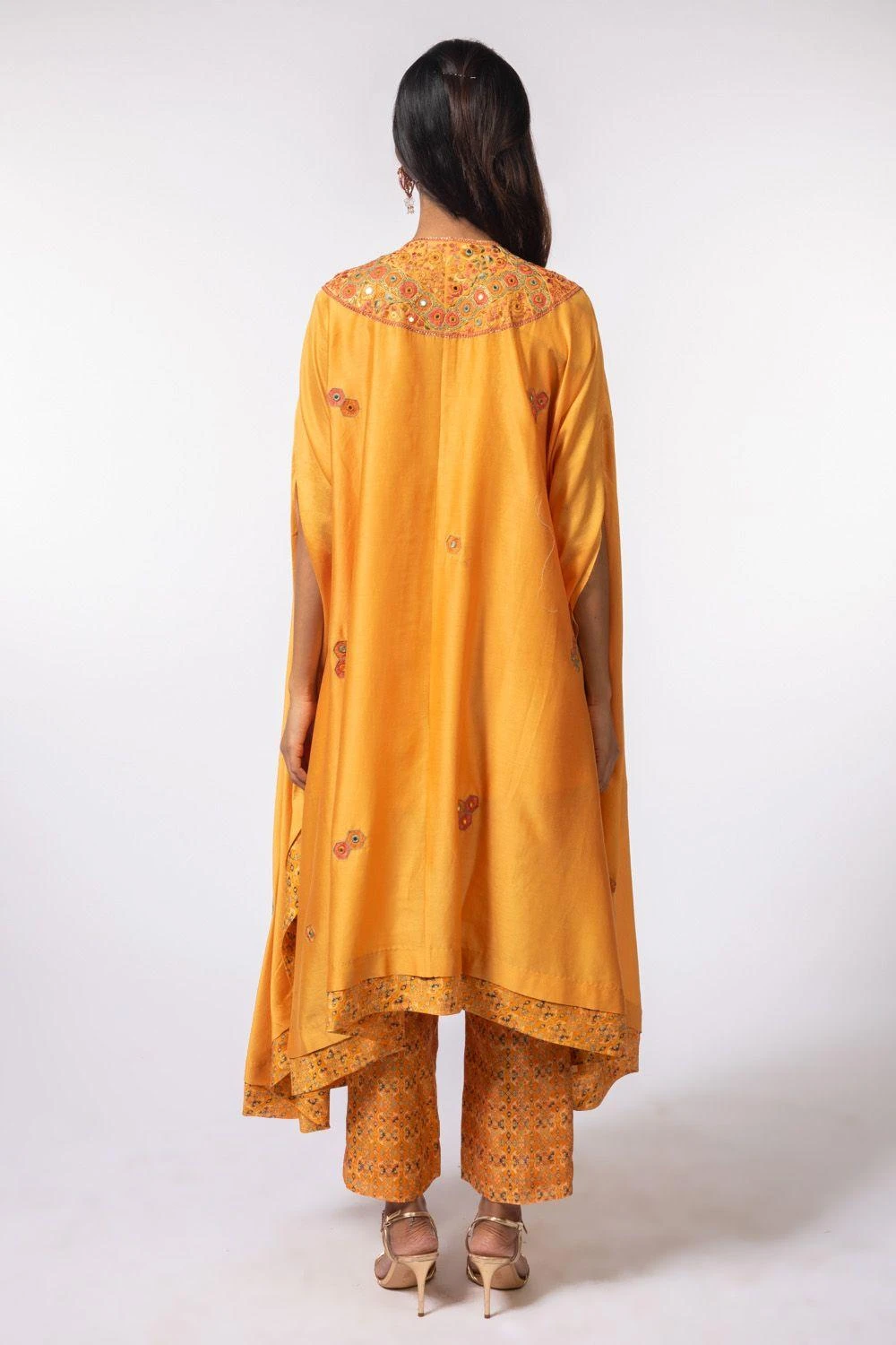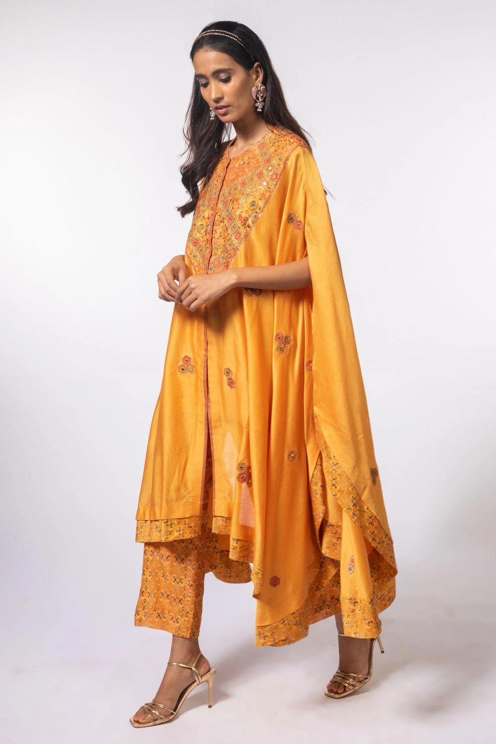 This flowy yellow cape set is adorned with thread work & mirror work details. Style this set with ornate jhumkas & a clutch for an ornate festive look.