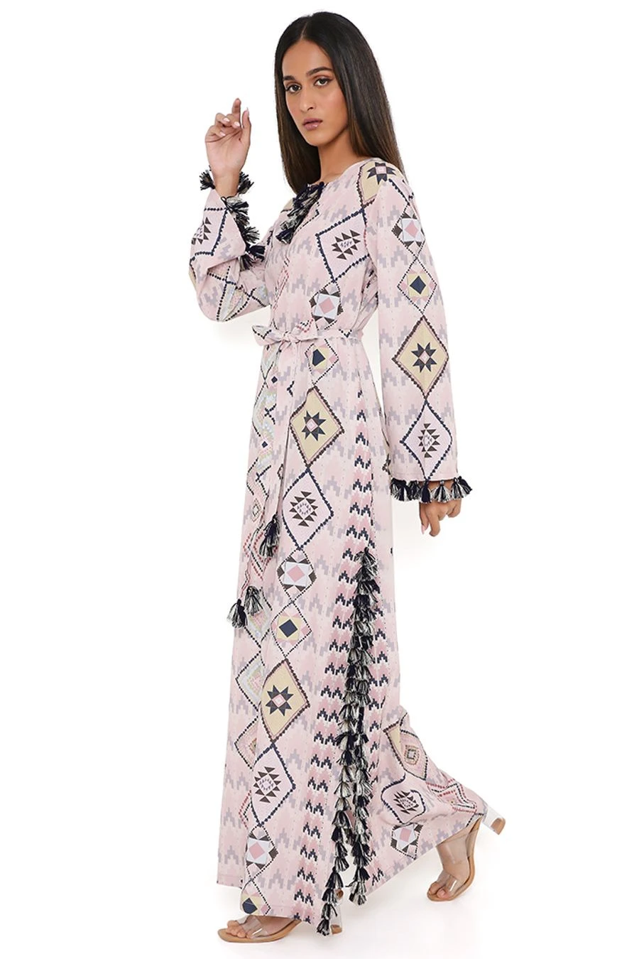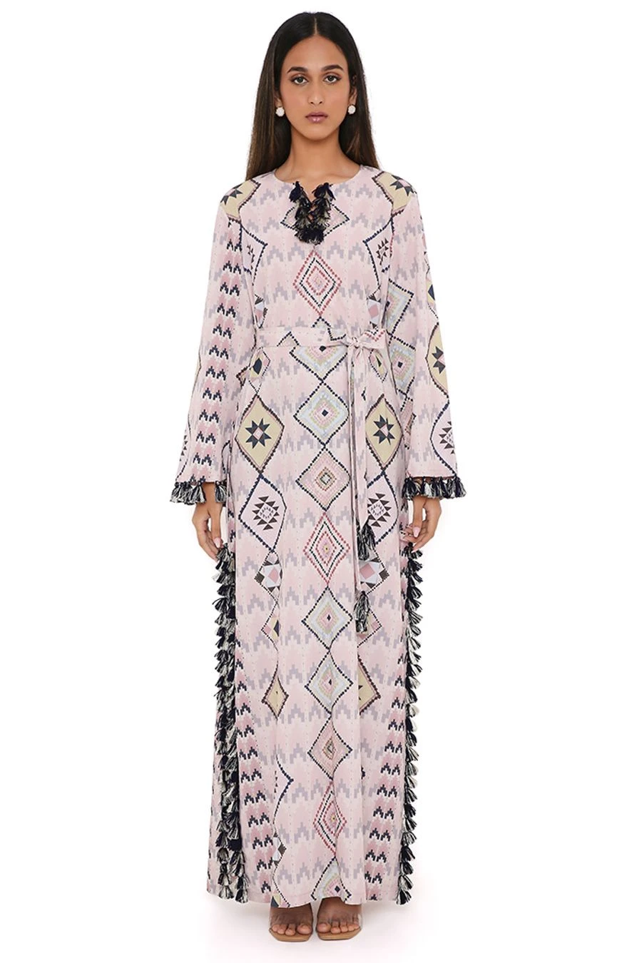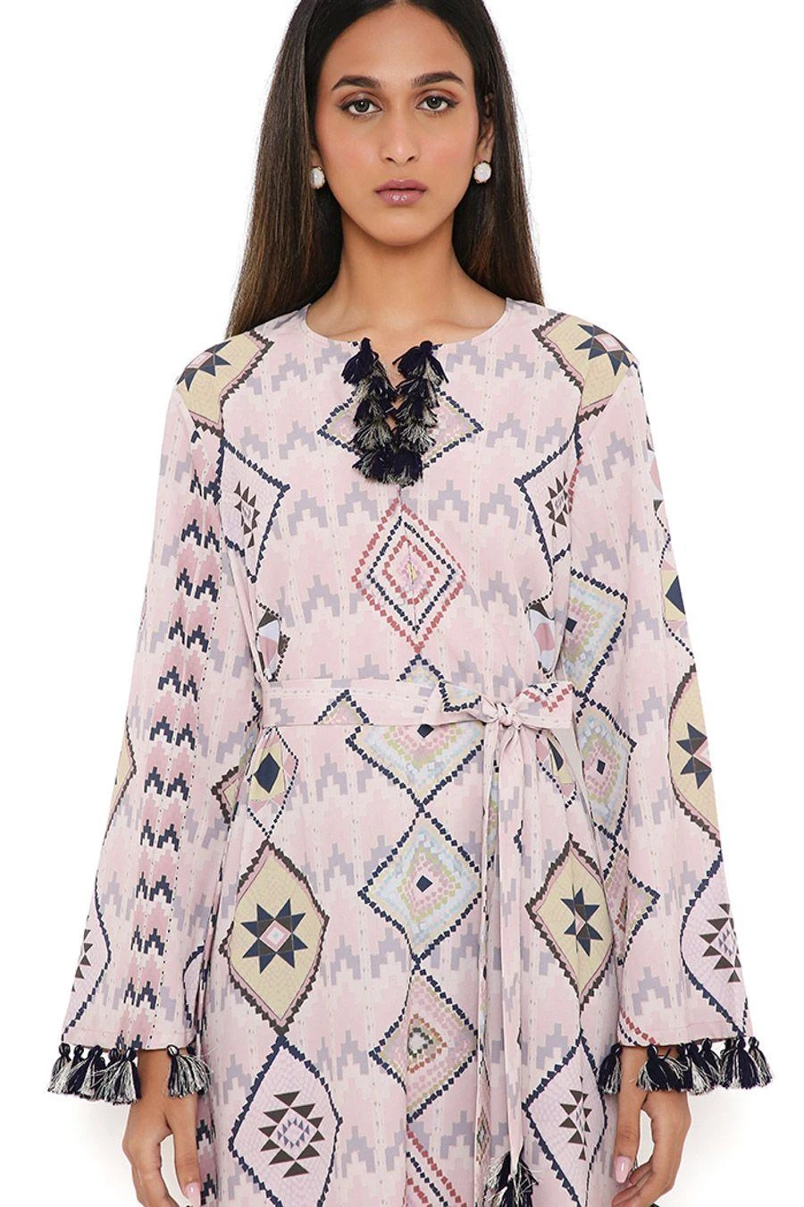 Add a layer of statement and glamour to your resort getaways with this kaftan. Crafted in crepe, this kaftan features a diamond print and tassels. Add a pair of dangler earrings to complete the look.