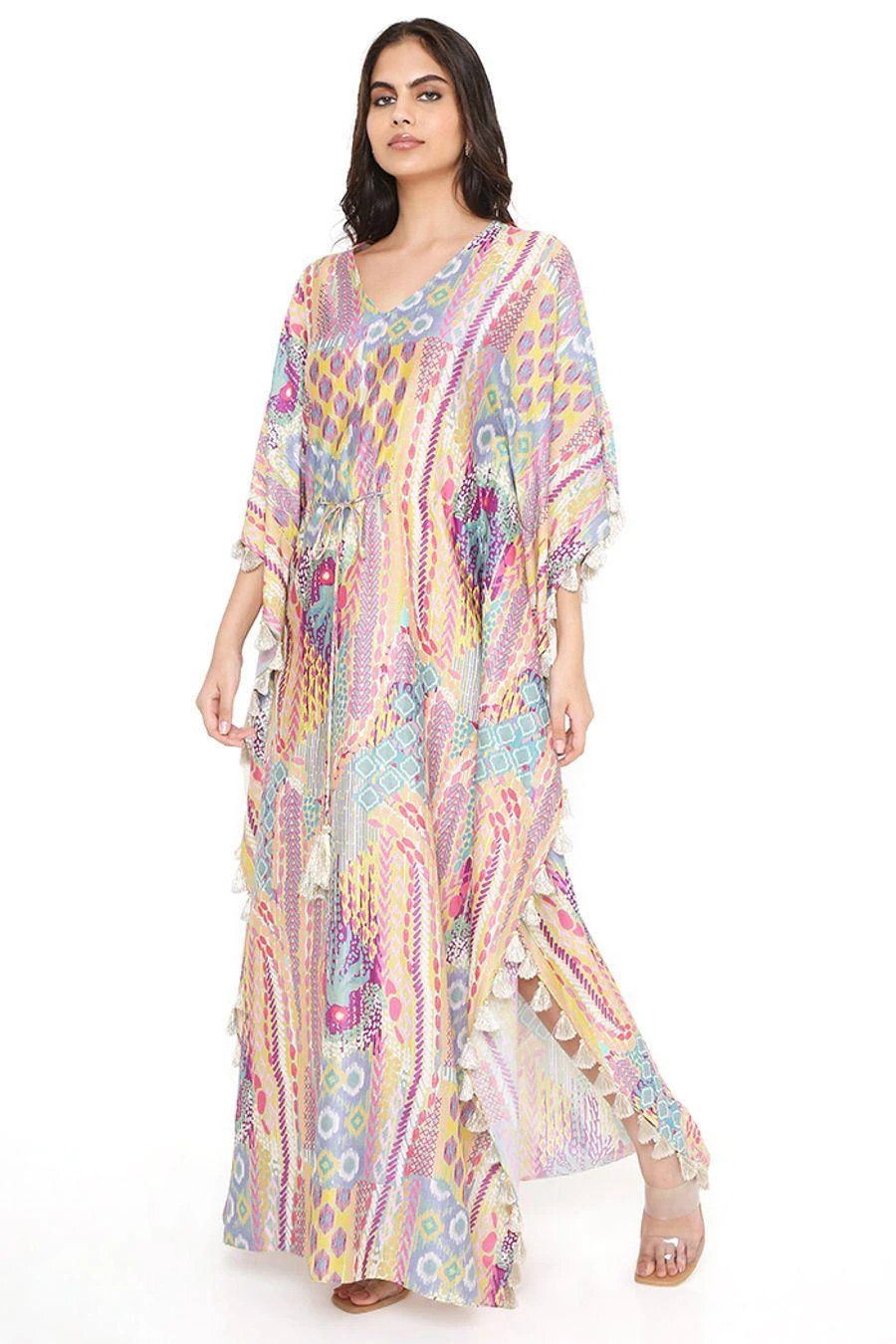 Add a layer of statement and glamour to your resort getaways with this kaftan. Crafted in silkmul, this lime green African print kaftan comes with tassels. Add a pair of dangler earrings to complete the look.