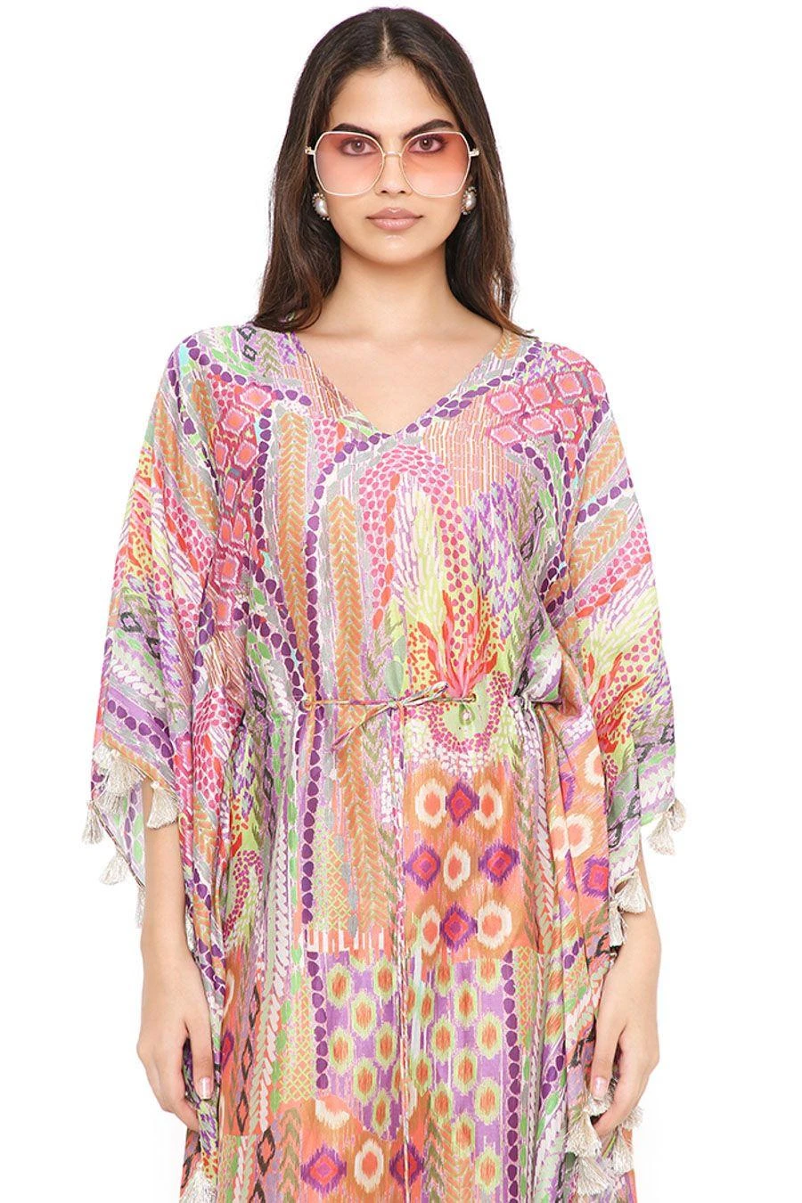 Add a layer of statement and glamour to your resort getaways with this kaftan. Crafted in silkmul, this multicoloured African print kaftan with tassels. Add a pair of dangler earrings to complete the look.