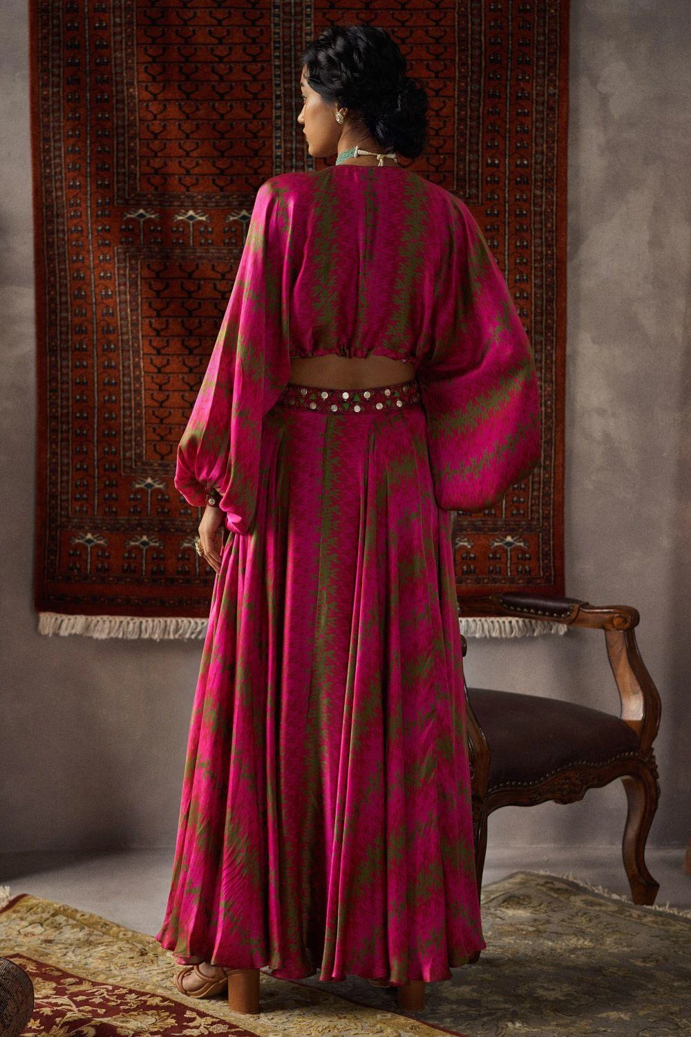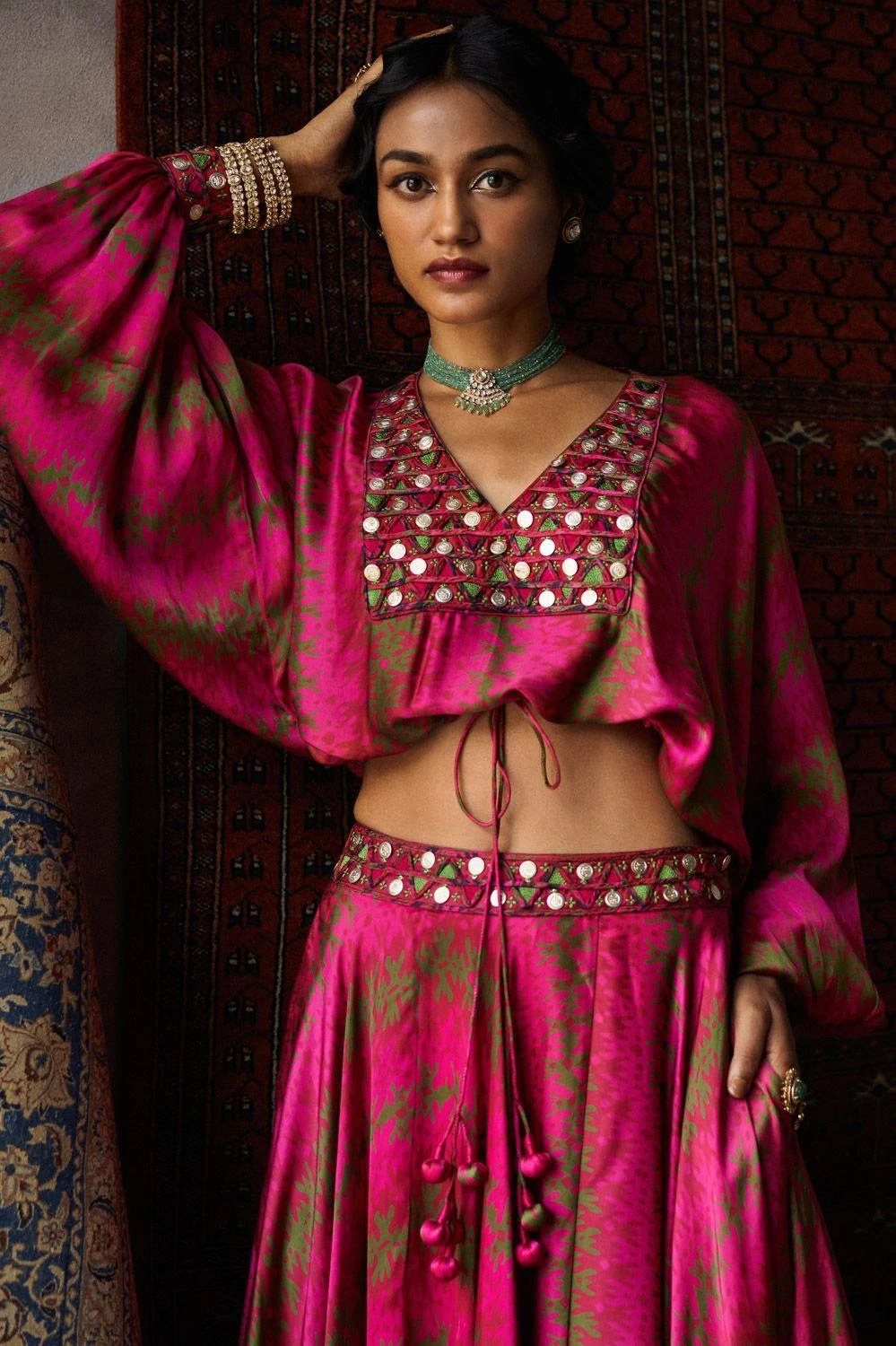 This cherry red top & skirt set is perfect to attend light intimate festivities. It features a satin silk ornate top with voluminous sleeves, paired with a coordinating printed skirt. Style it with a chic choker to elevate your look.