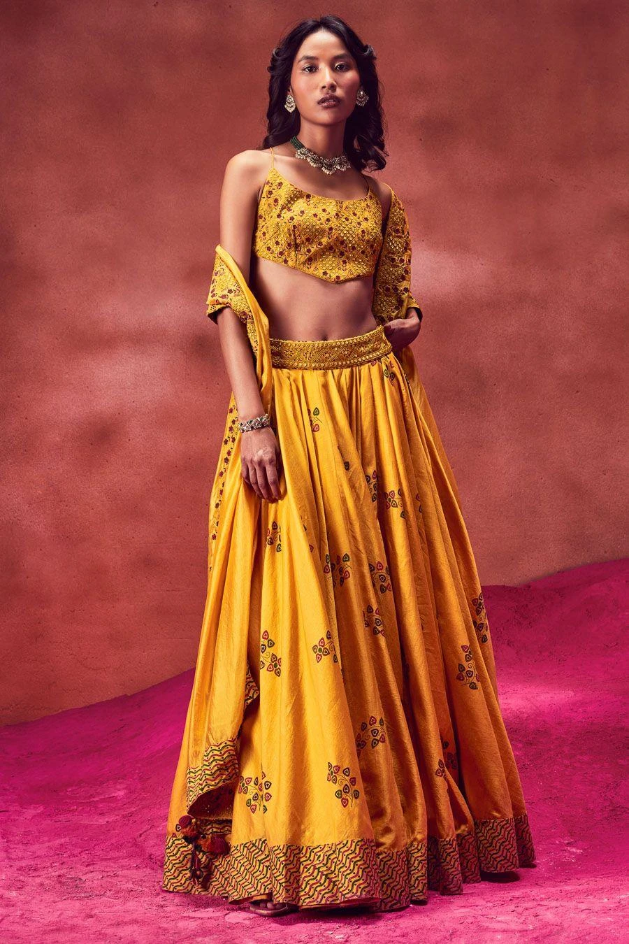 Look effortlessly stylish in this yellow lehenga set. Crafted in chanderi silk, this set features a hand block printed lehenga with a resham work waistline paired with an equally versatile blouse & dupatta.