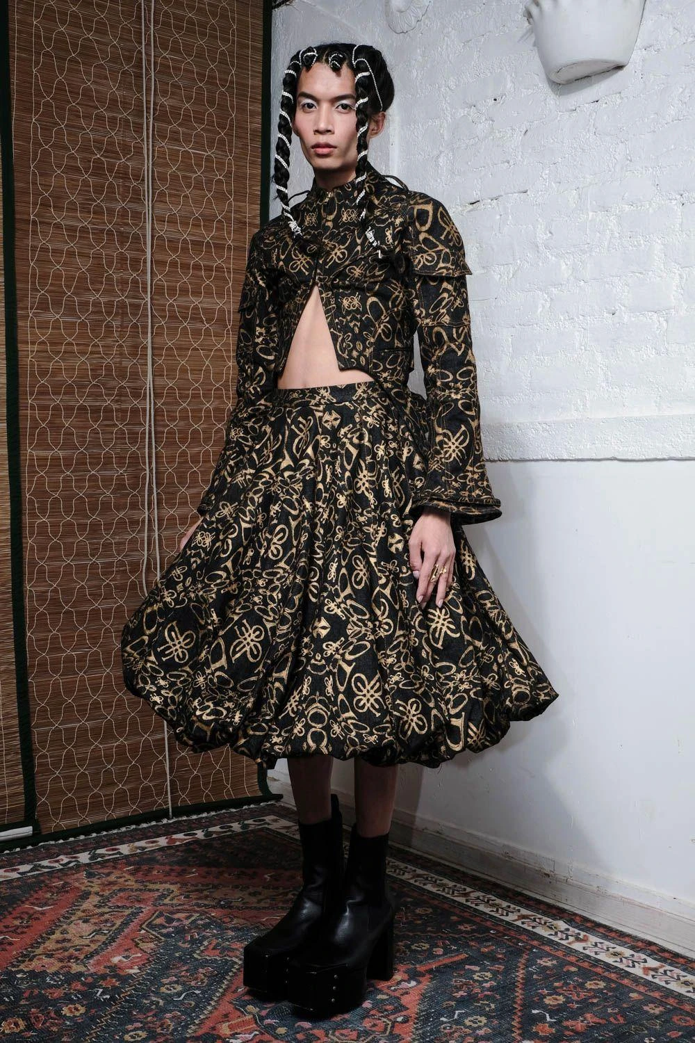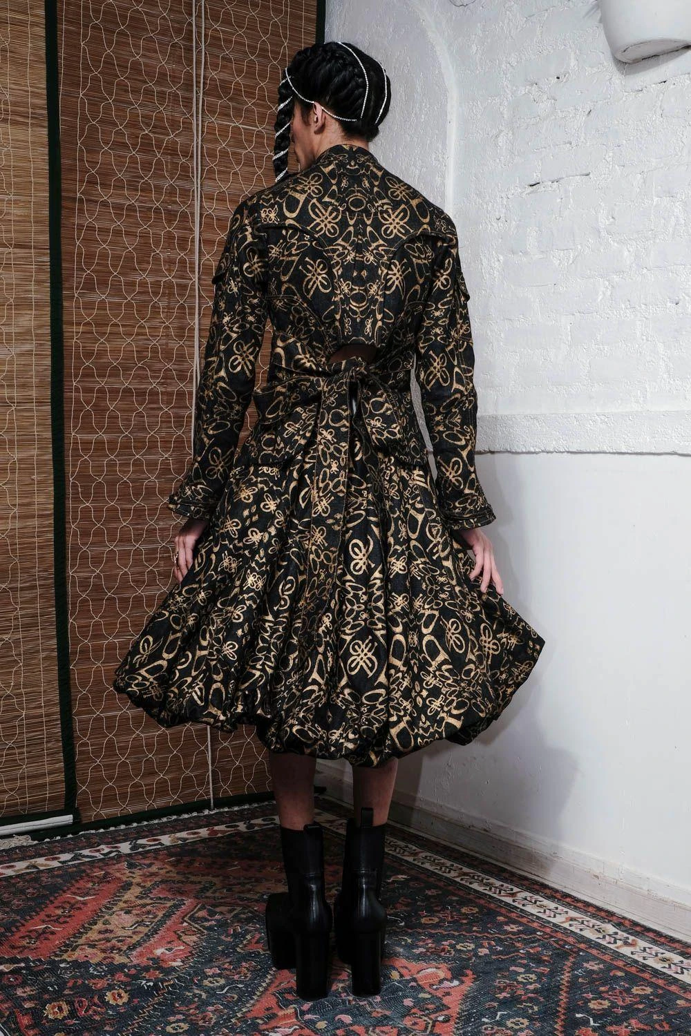 Step into luxe fashion with QUOD’s black denim skirt. The gold metallic monogram print & bubble silhouette create a fusion of edgy & chic. Versatile for evenings out or elevating everyday style, this skirt adds a bold and trendy statement.
