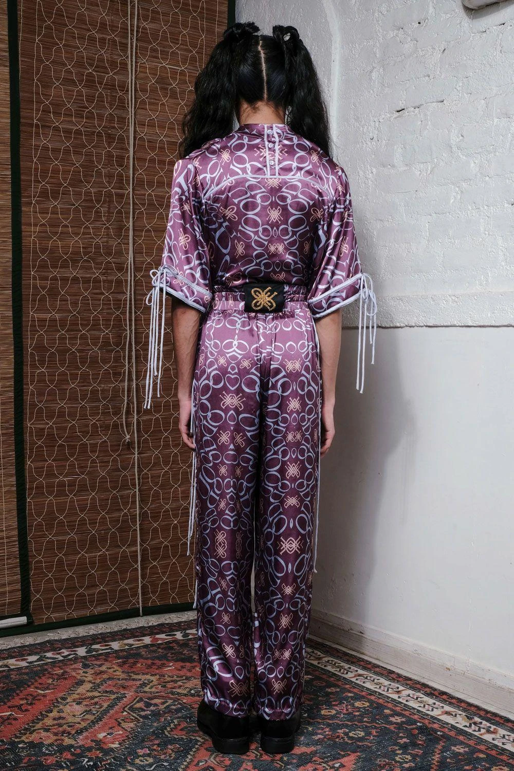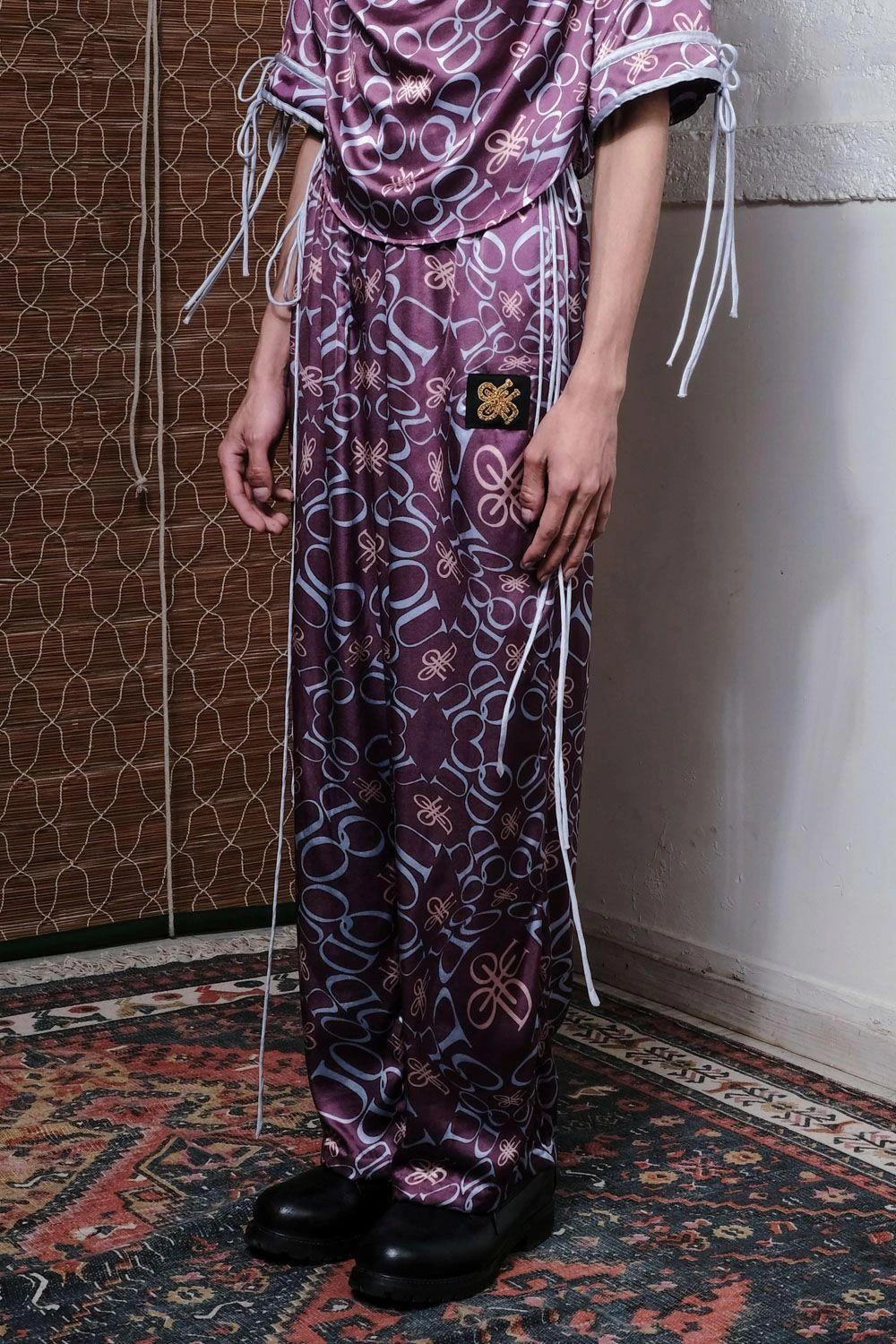 Embrace luxury in this satin all-over QUOD monogram print pants, adorned with hand-embroidered wreath motifs. The wide elasticated waistband & detailed craftsmanship exude elegance. Perfect for upscale occasions or adding opulence to casual outings.