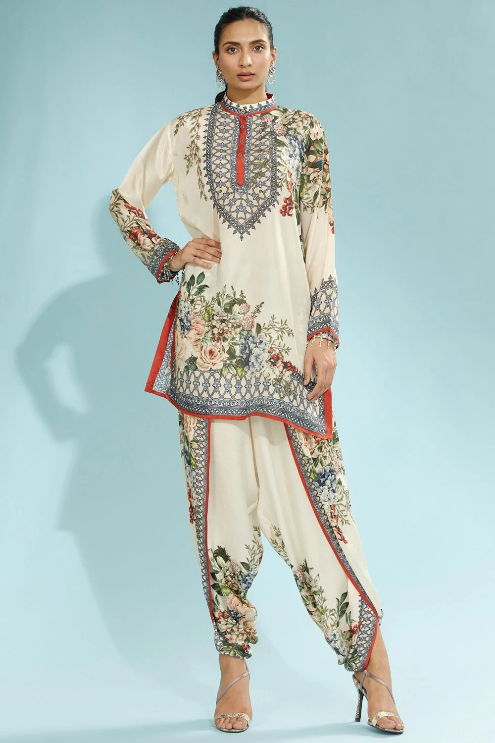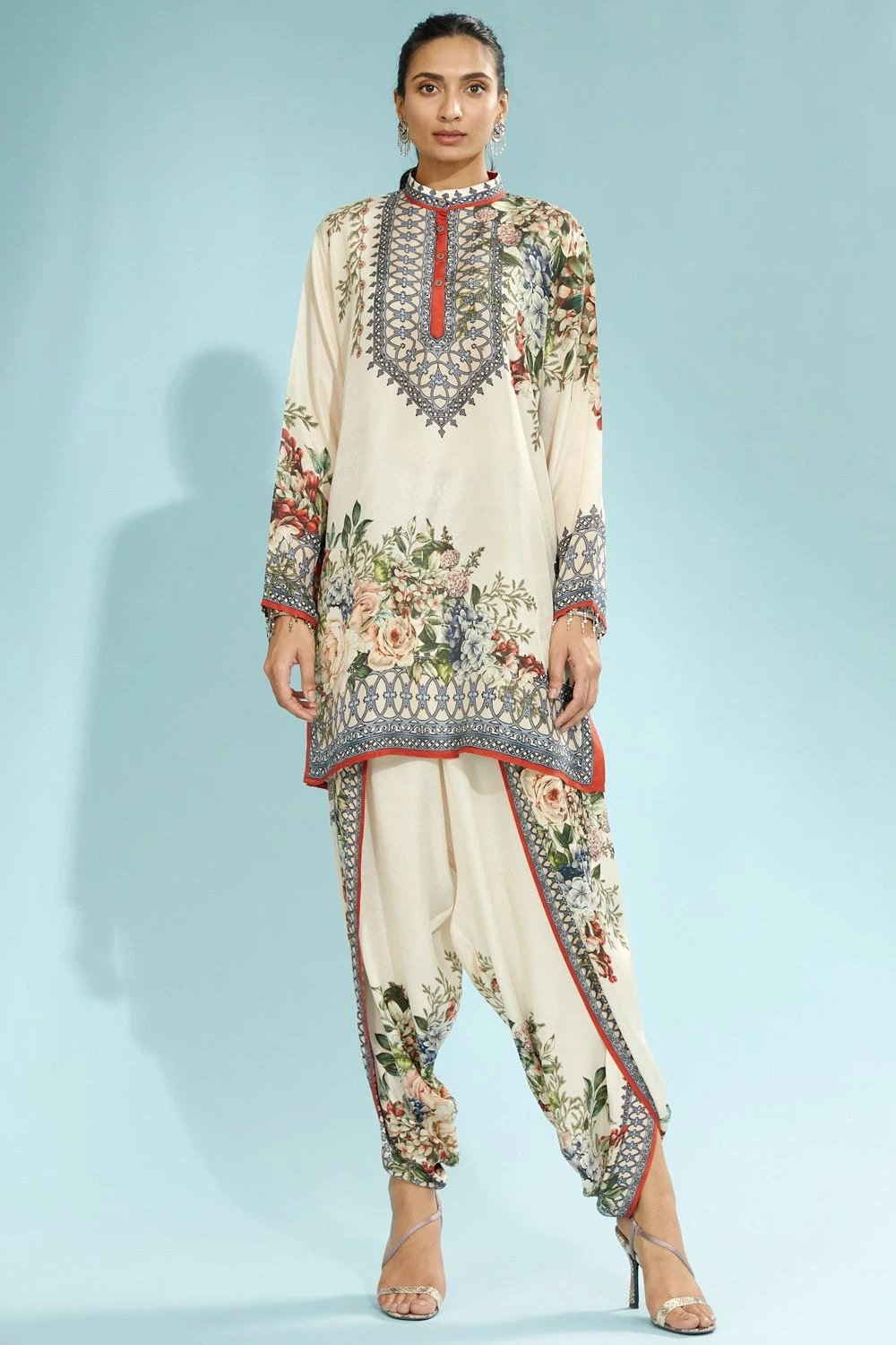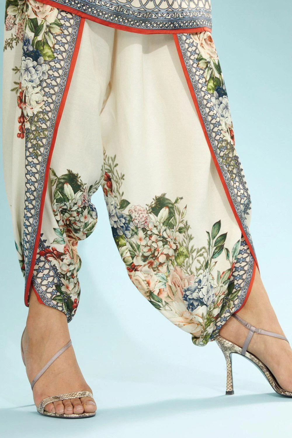 Playful silhouettes & vibrant tones are in perfect style this season, & this dhoti fits the bill perfectly. It features a drape detail along with floral prints. Style these pants with a powder blue floral printed kurta to complete the look.
