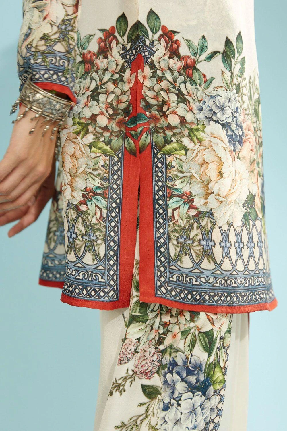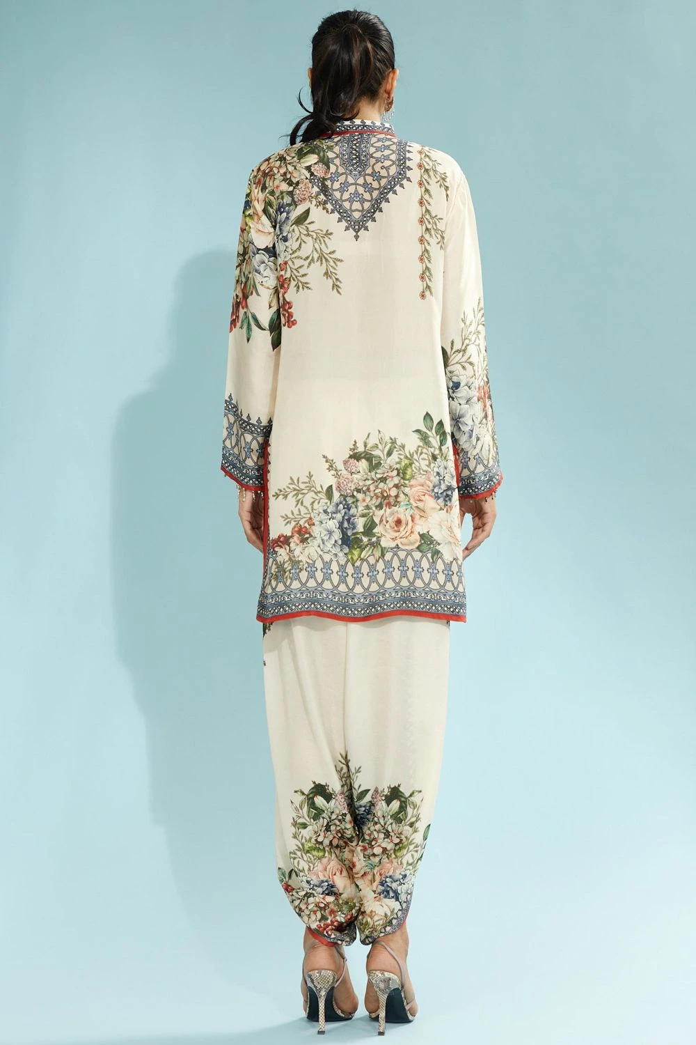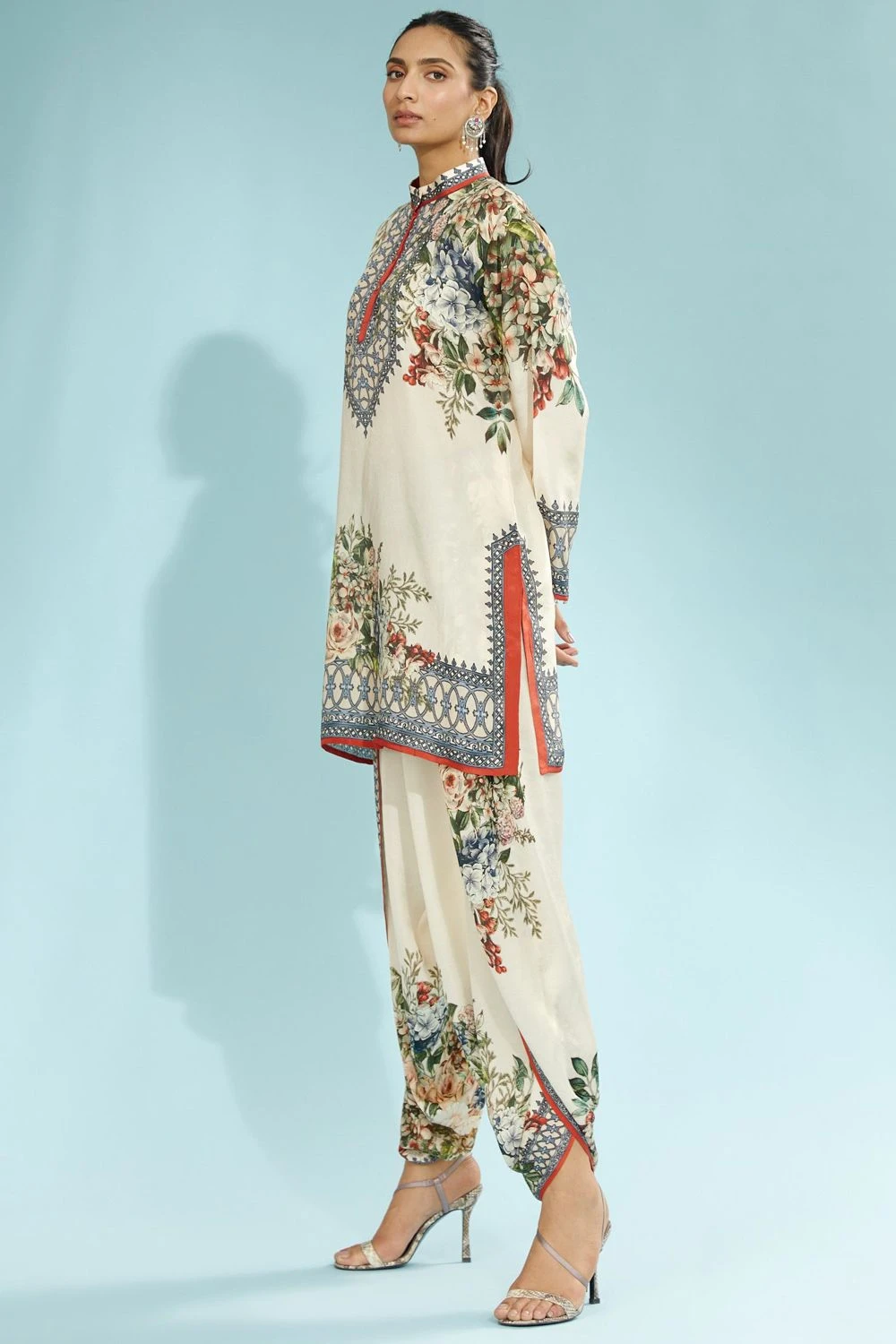 Playful silhouettes & vibrant tones are in perfect style this season, & this dhoti fits the bill perfectly. It features a drape detail along with floral prints. Style these pants with a powder blue floral printed kurta to complete the look.