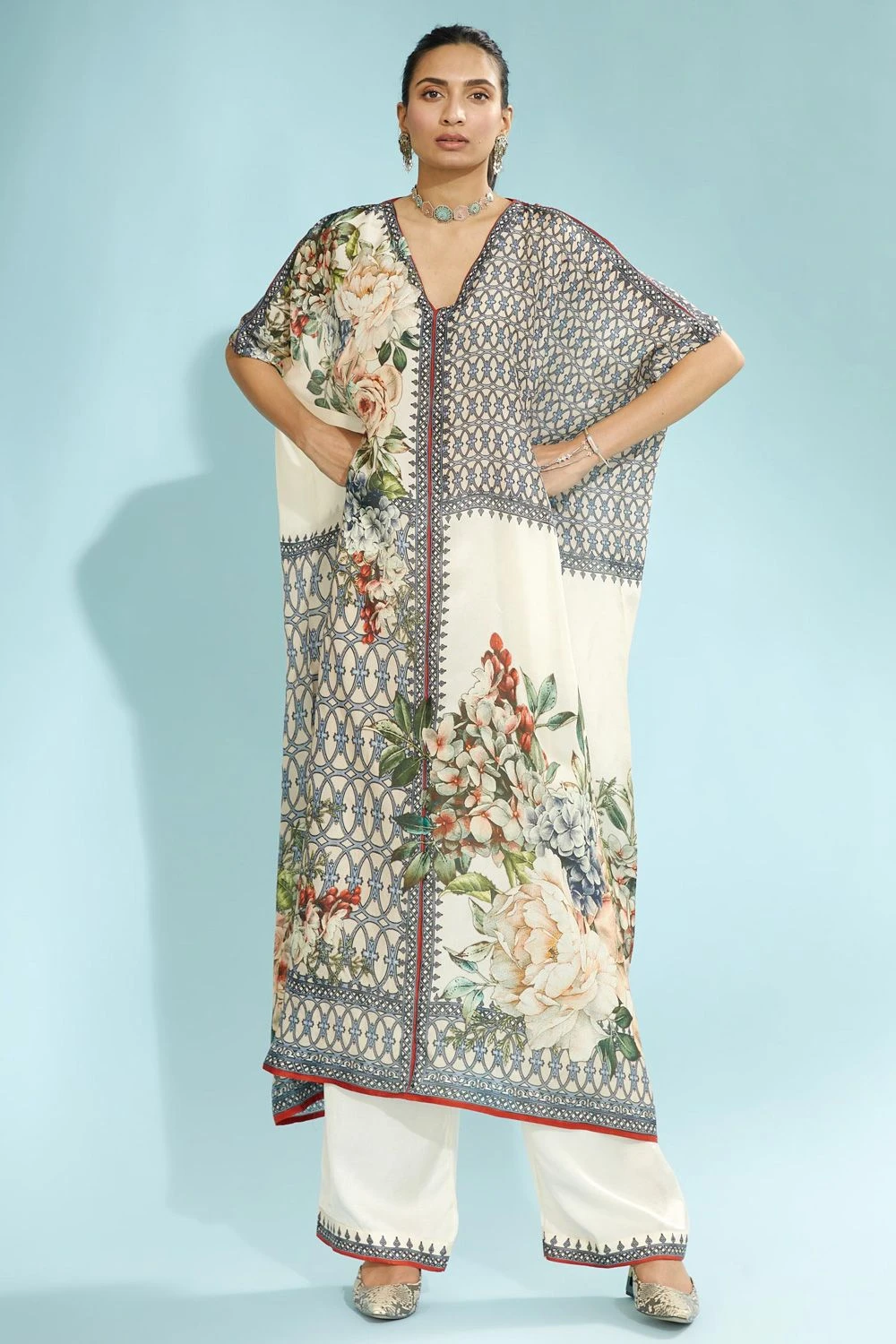 Playful silhouettes & vibrant tones are in perfect style this season, & this kaftan fits the bill perfectly. It features a V neckline with a floral print. Style it with a pair of blue palazzos to complete the look.