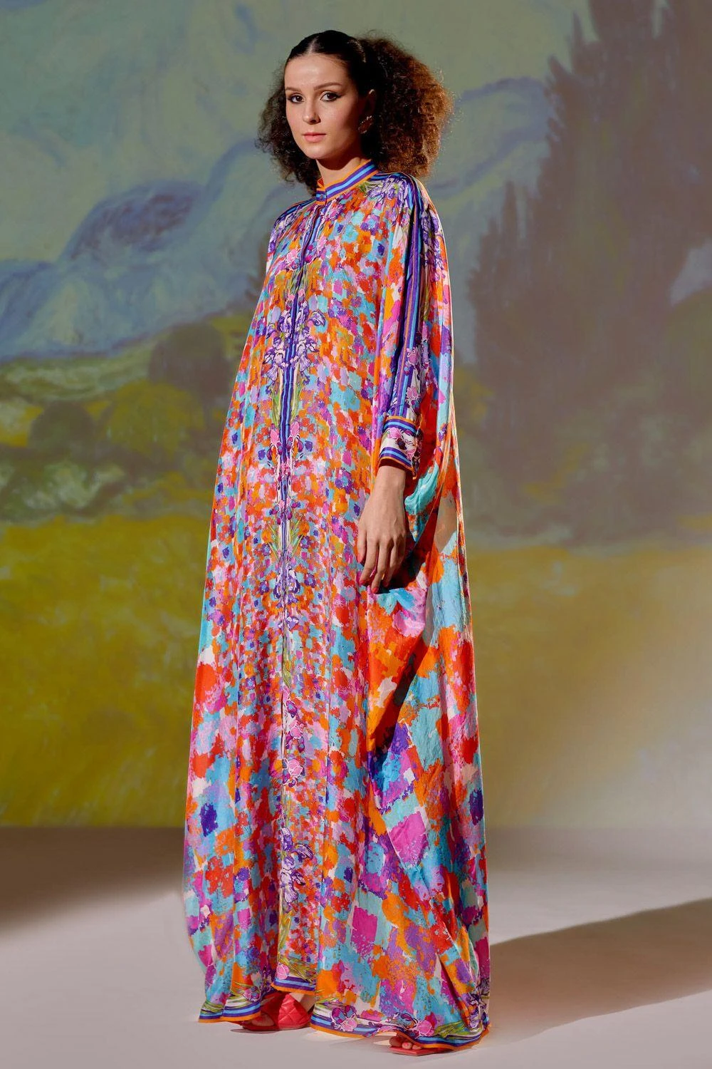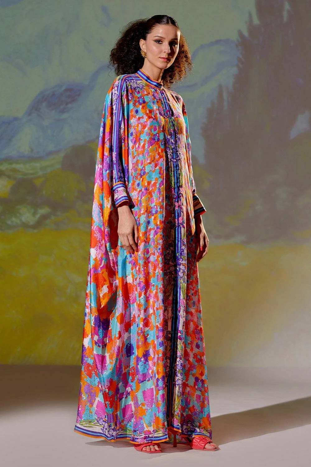 Elevate your wardrobe with this multi-color silk kaftan. Featuring a front button placket & cuffs, it’s perfect for casual outings & resort evenings. Style with sandals for a beachy look or heels for a night out. Effortless elegance for any occasion!