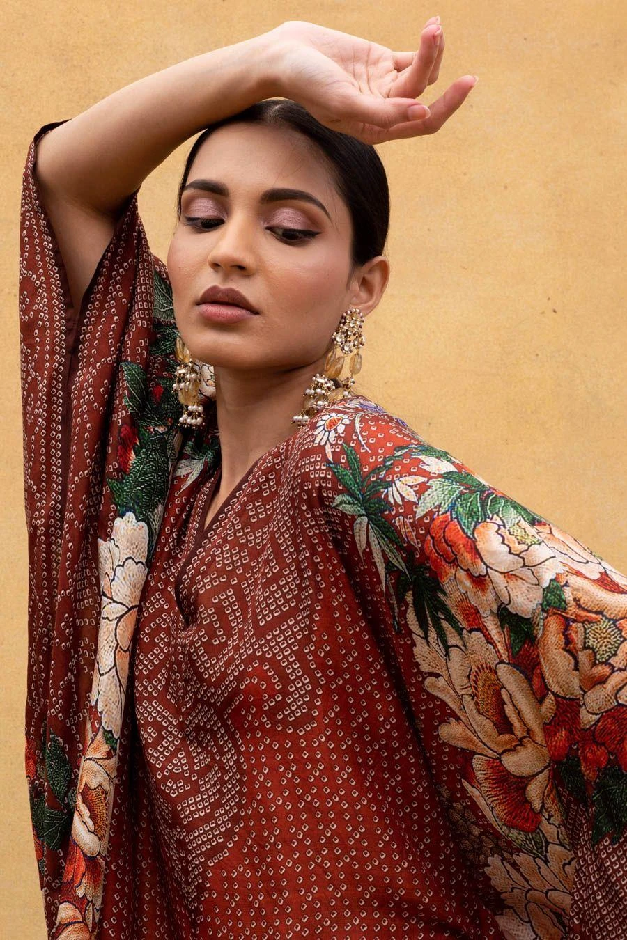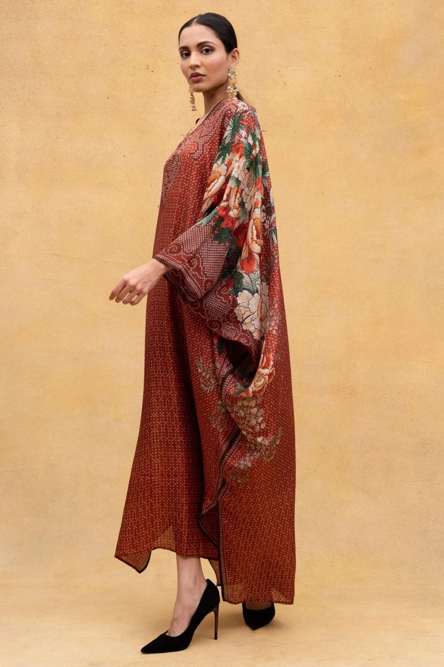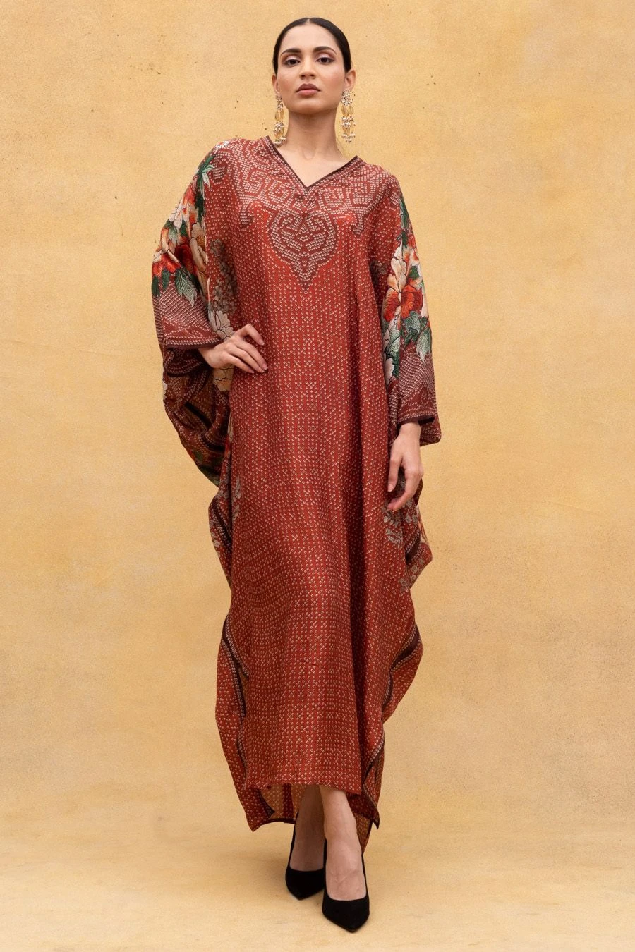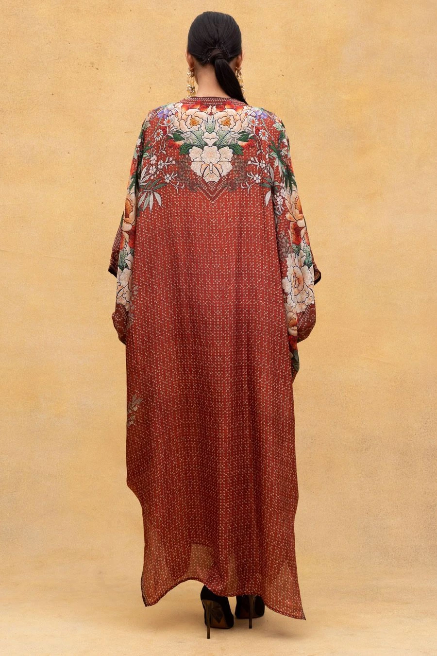 The perfect amalgamation of style and comfort, this kaftan works across occasions. This floral printed silk kaftan with a V-neckline and a narrow bottom hem comes with low side slits.