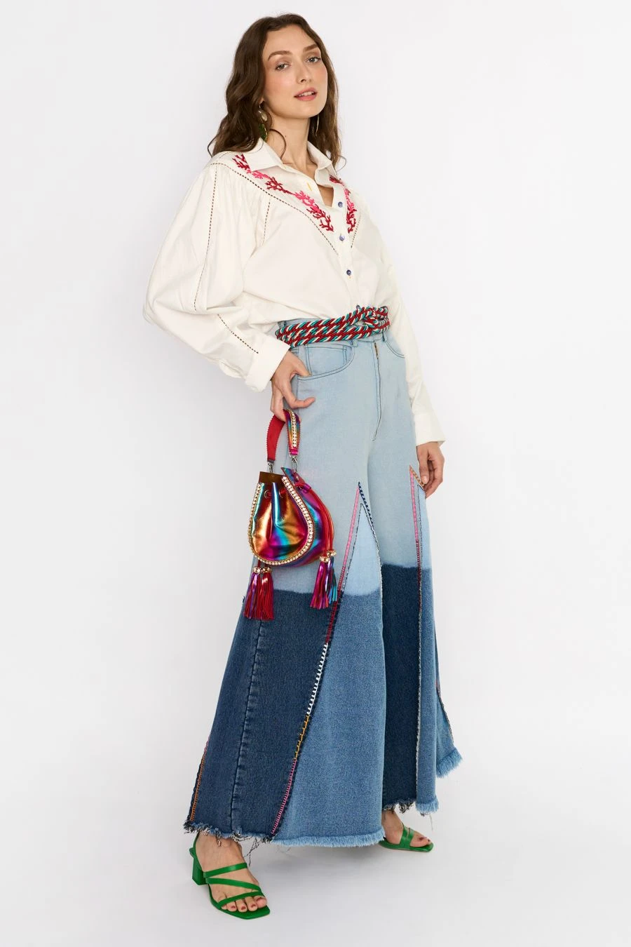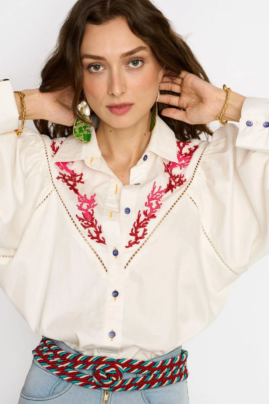 Elevate your nautical-themed wardrobe this summer with this white shirt. Stylish & timeless, this shirt features hand done embellishments around the yoke with lace details. Pair it with blue denim pants from the collection to complete the set.