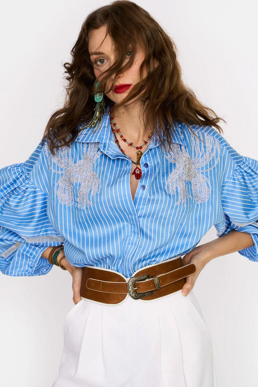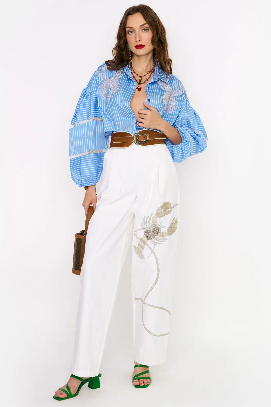 Crafted in twill cotton, these pleated pants feature hand embellished lobster and rope motifs. Pair it with a classic white shirt from the collection to complete the set.