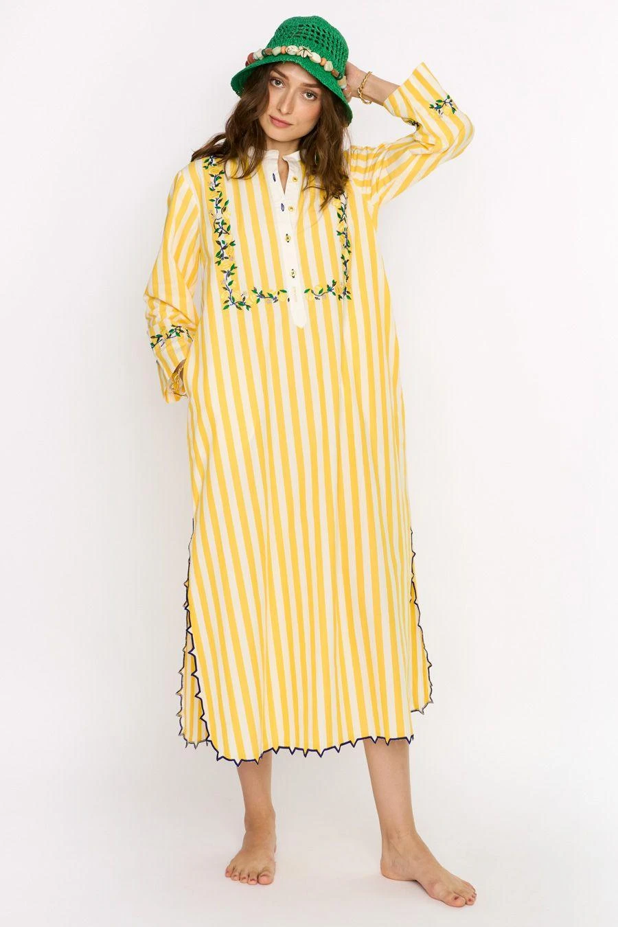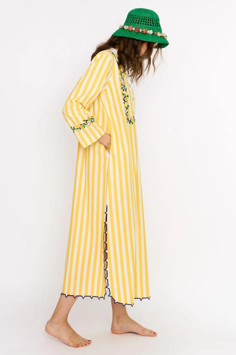 Elevate your nautical style wardrobe this summer with this one of a kind blue & white dress. Crafted in cotton, this hand embroidered striped & scalloped dress features lemon motifs.