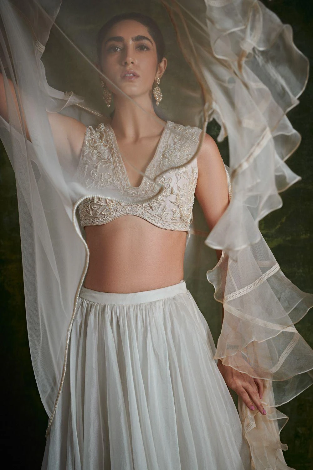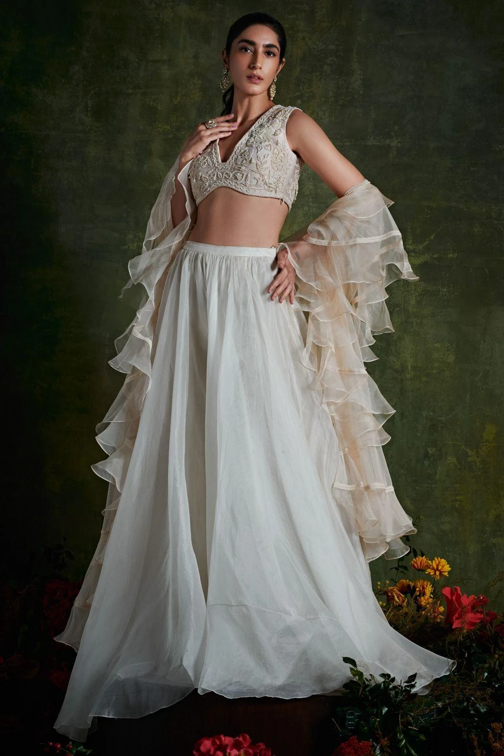 Attend your next destination wedding in this whimsical ivory ensemble. The organza lehenga is paired with a sultry neck embroidered blouse and a ruffled net dupatta. You can adorn emerald jewellery with this look.