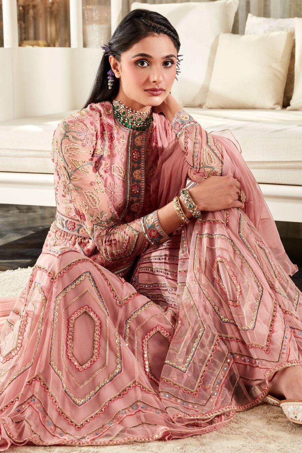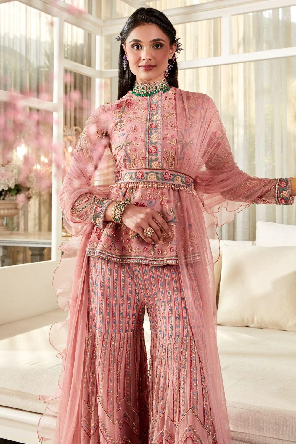 This stylish peplum & gharara set is perfect for daytime festivities. This modern take on the traditional style is highlighted with floral embroidery details. It comes with a matching dupatta & belt.