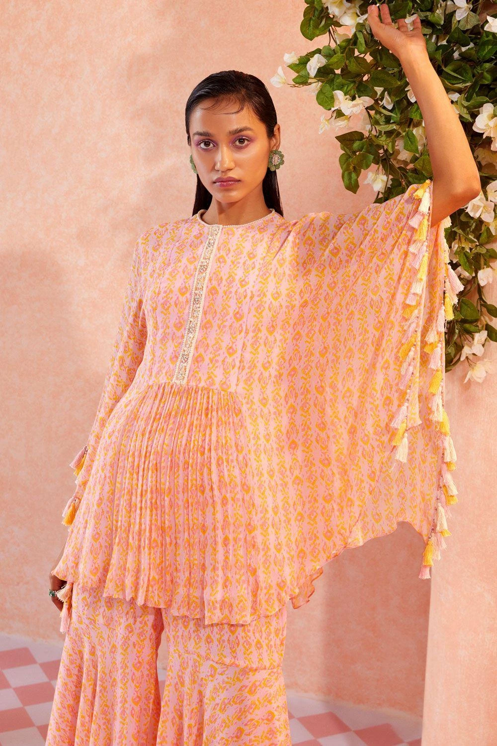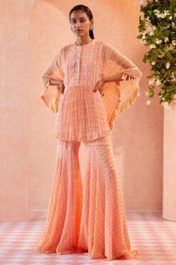 Radiate vibrance at your celebrations in this orchid pink sharara set. It features an ikat printed kaftan style kurta with an embellished neckline. It comes with matching printed sharara pants. Adorn a pair of statement earrings with this look.