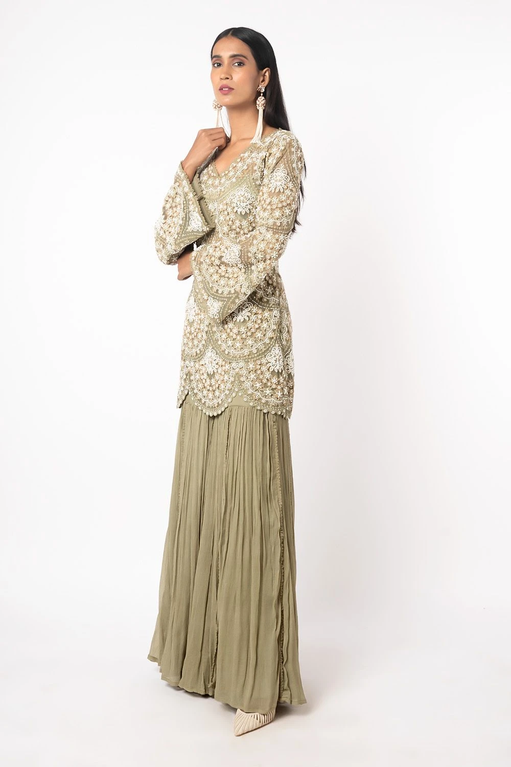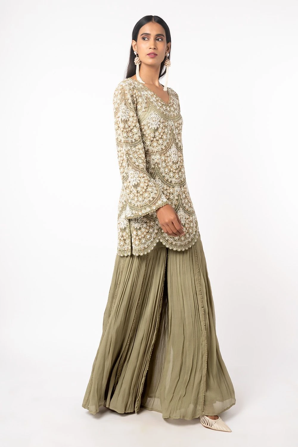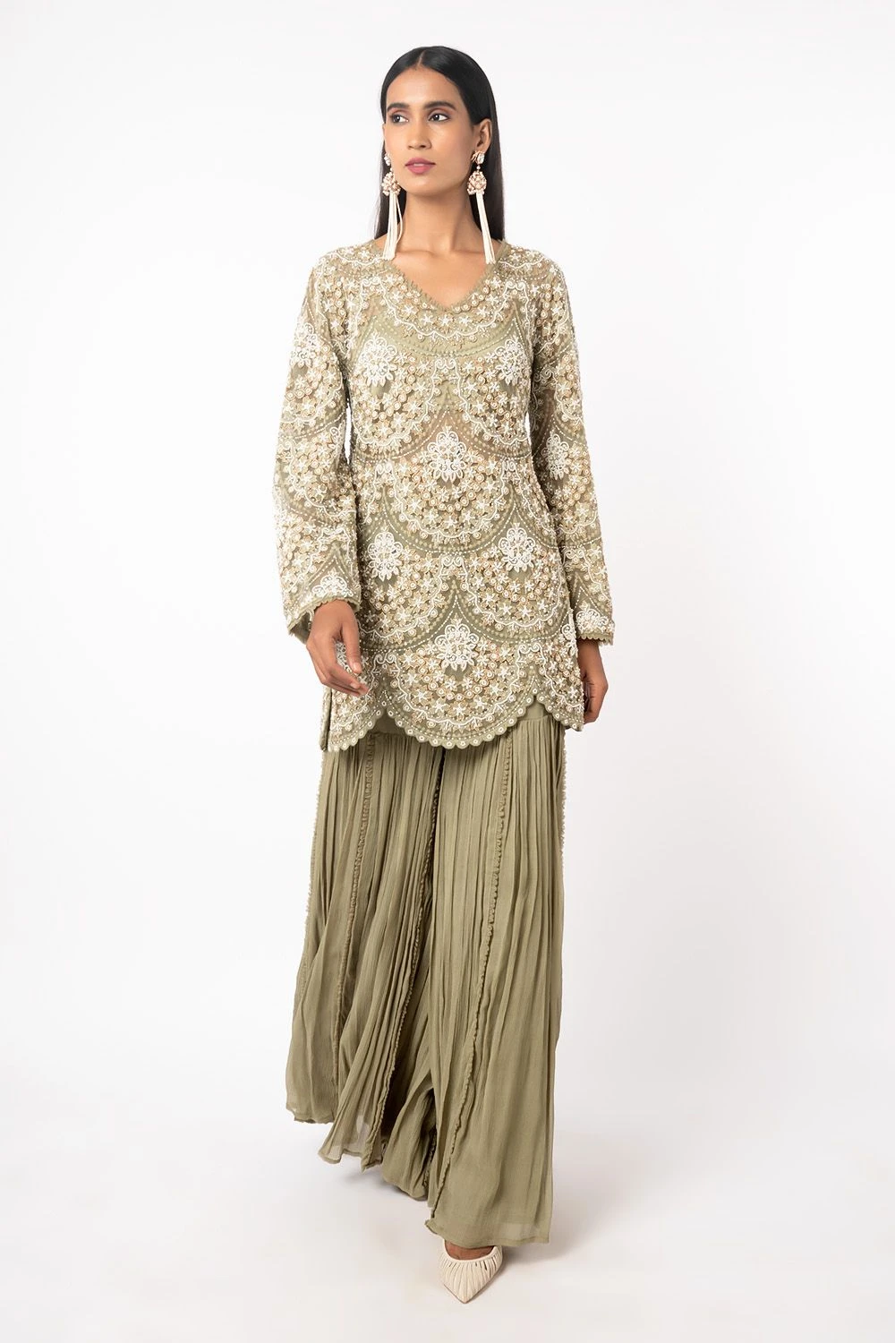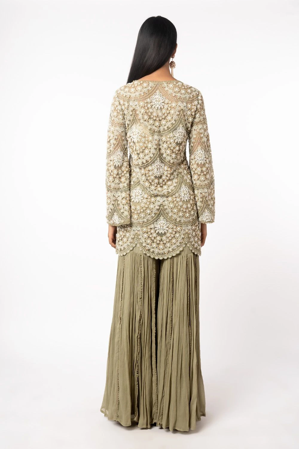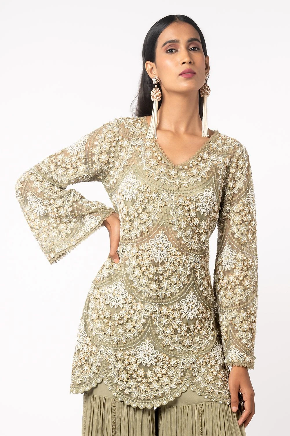 The green short kurta does a lot with its simple and classic silhouette. It is adorned with pearl embroidery in a scallop pattern. It is paired with organza sharara with drop pearl embroidered hem. Pair it with a pearl choker to complete the look.