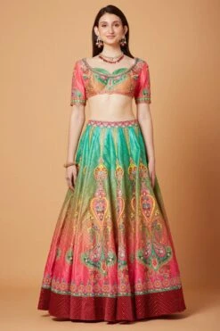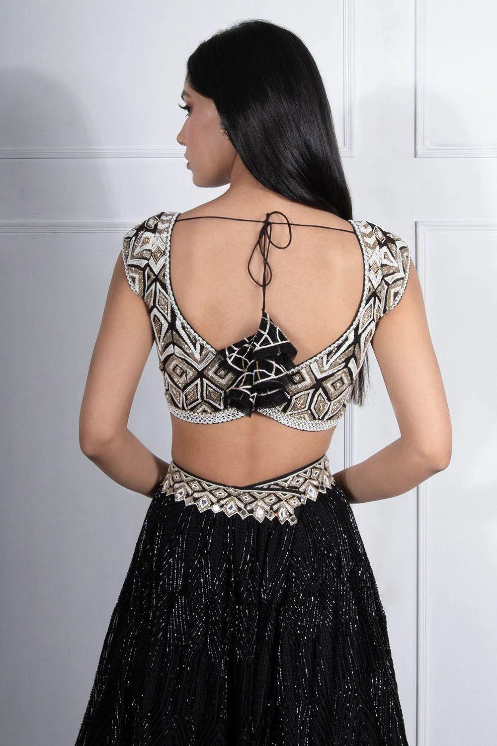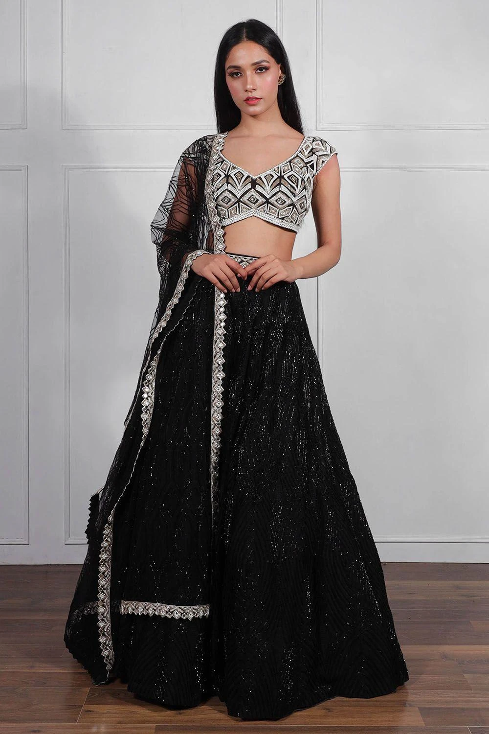 Make flair at your sangeet in this stunning black chevron lehenga paired with a scintillating blouse and a net dupatta. Style it with statement danglers and a stone maang tikka.