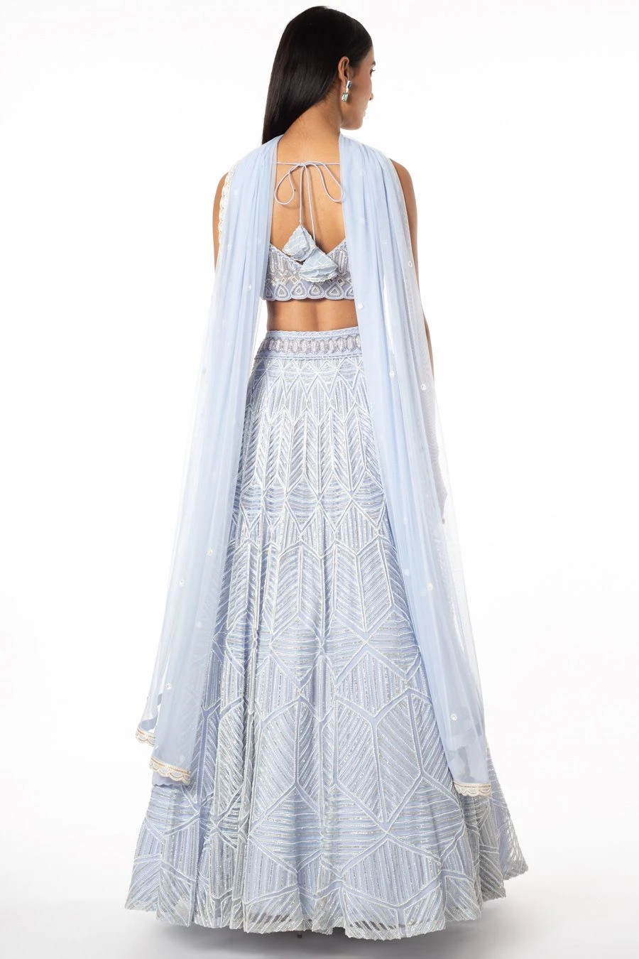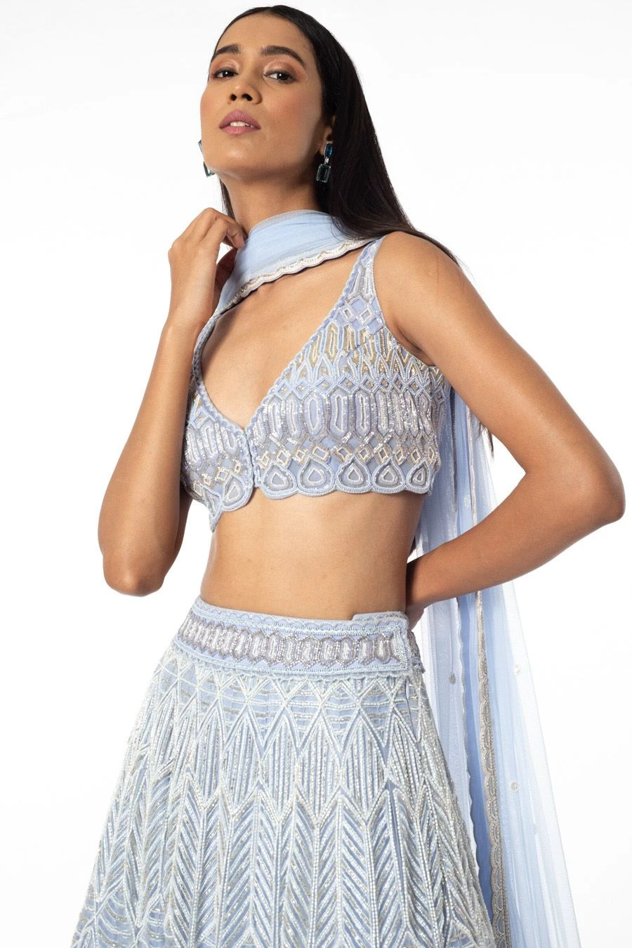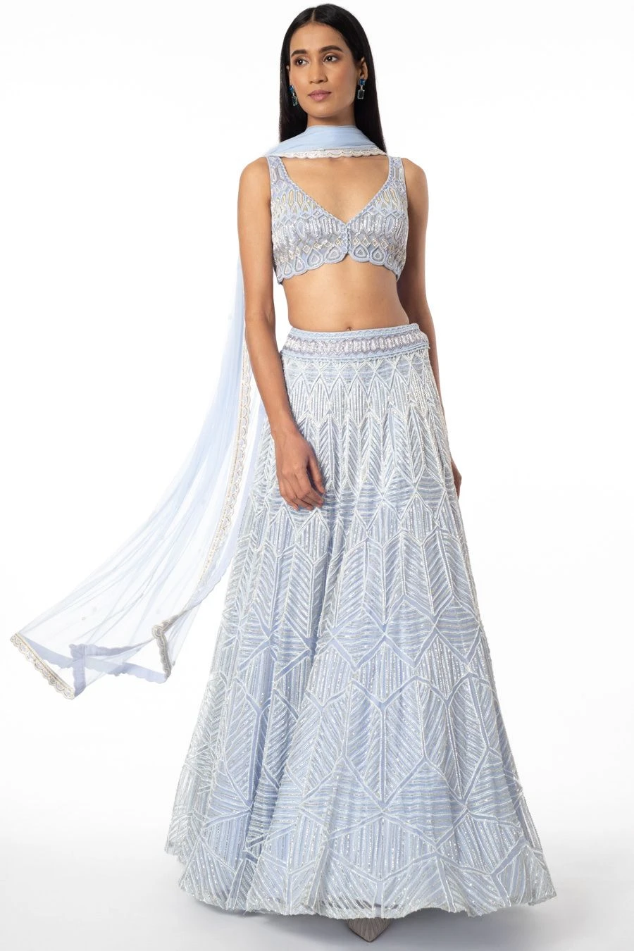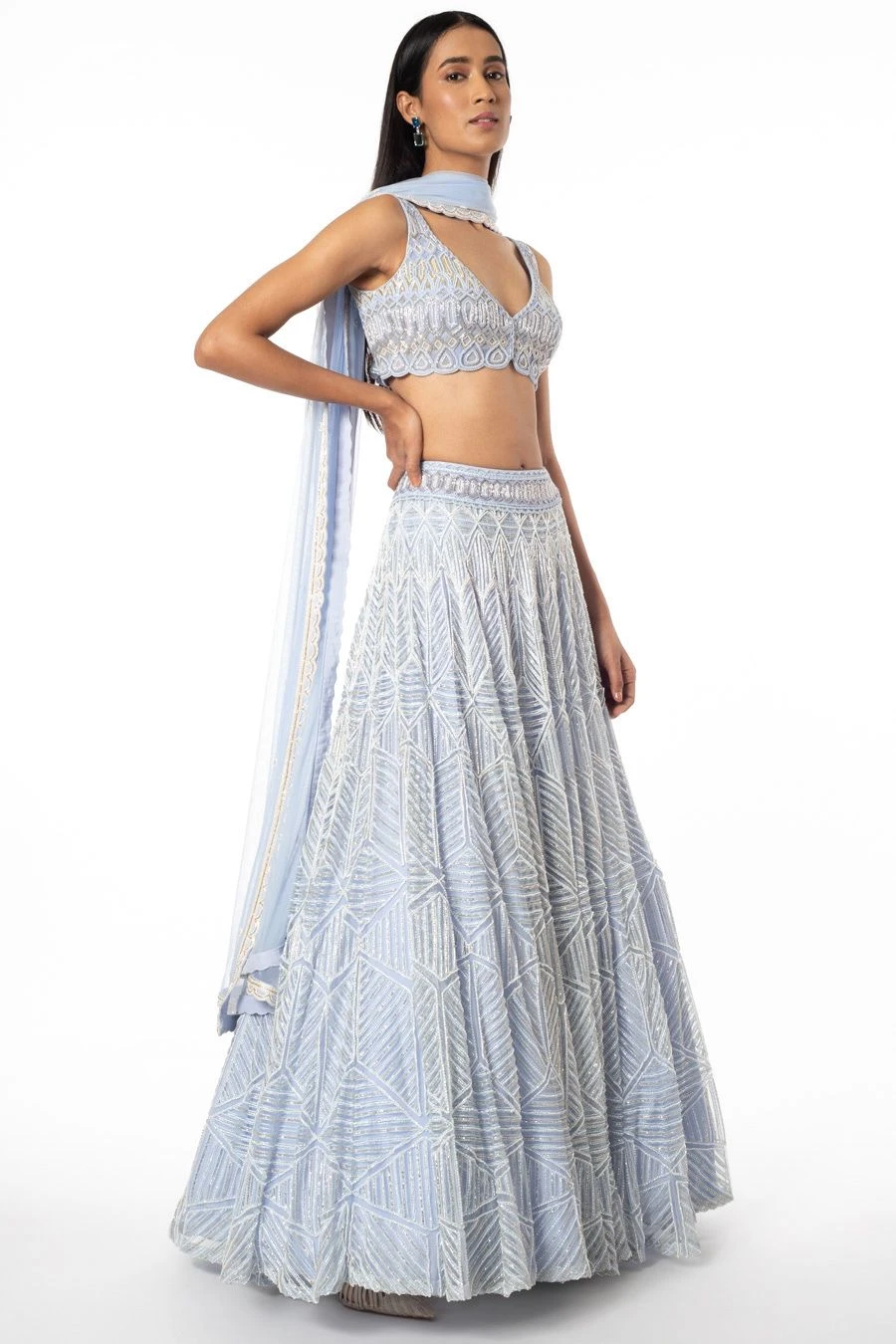 With its contemporary design sensibilities and timeless hues, this lavender embellished lehenga makes a stunning choice for a new-age bride. It is paired with a matching sleeveless blouse and a dupatta.