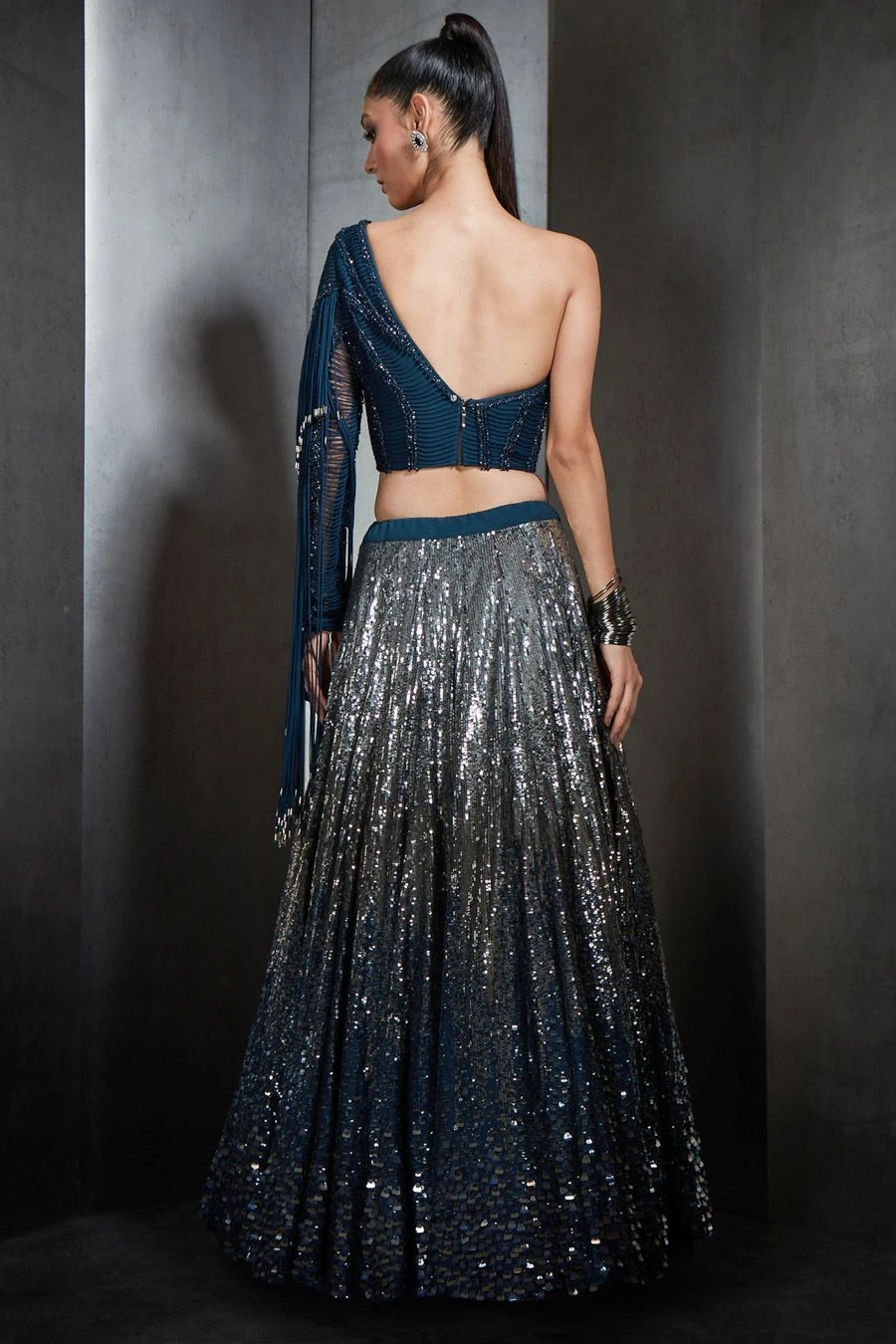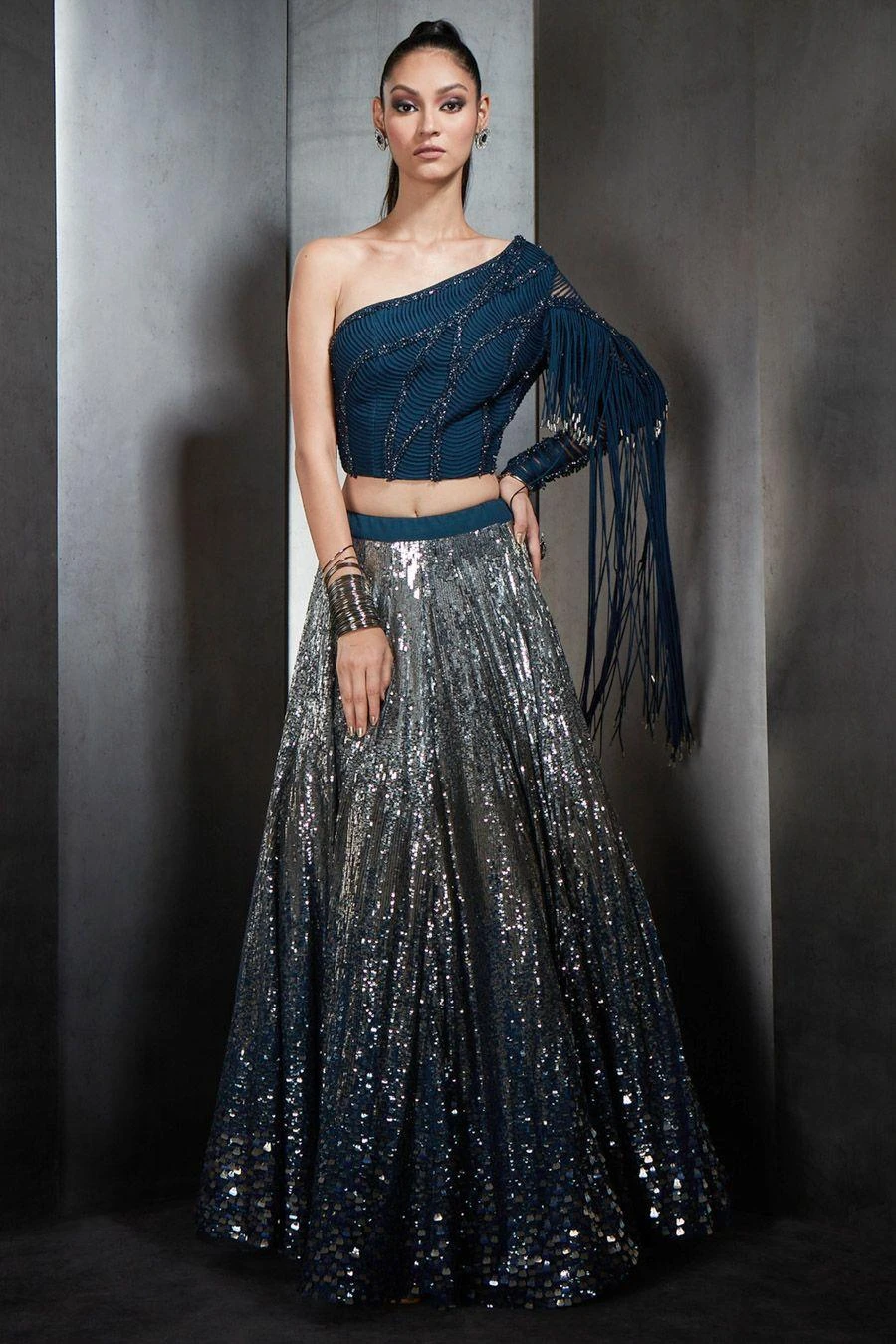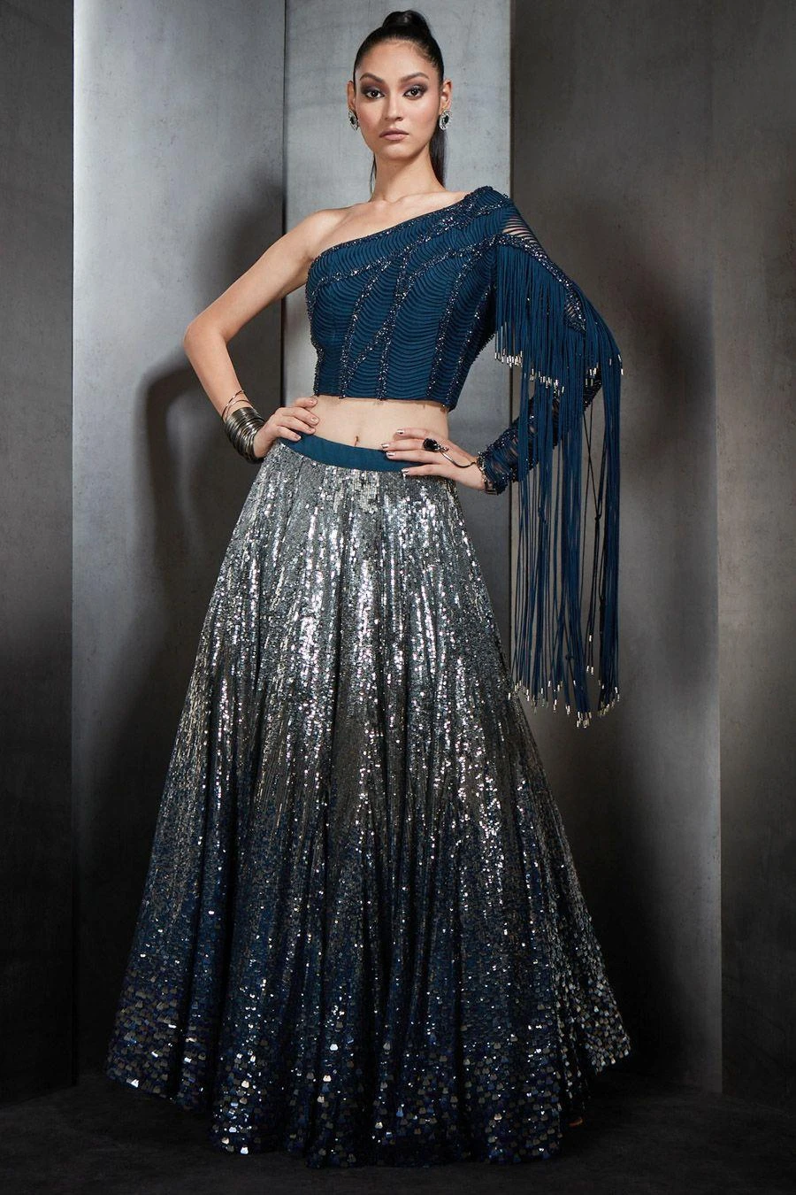 If you’re looking for a head-turning statement-making top this is the outfit for you. Crafted in tulle and net, this handcrafted fringe one shoulder crop top has metallic and tonal embellishments.