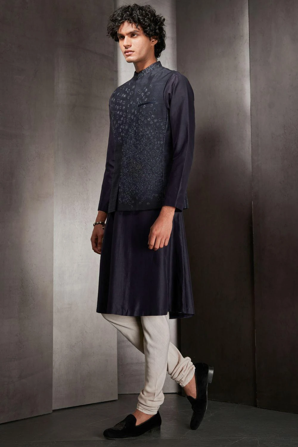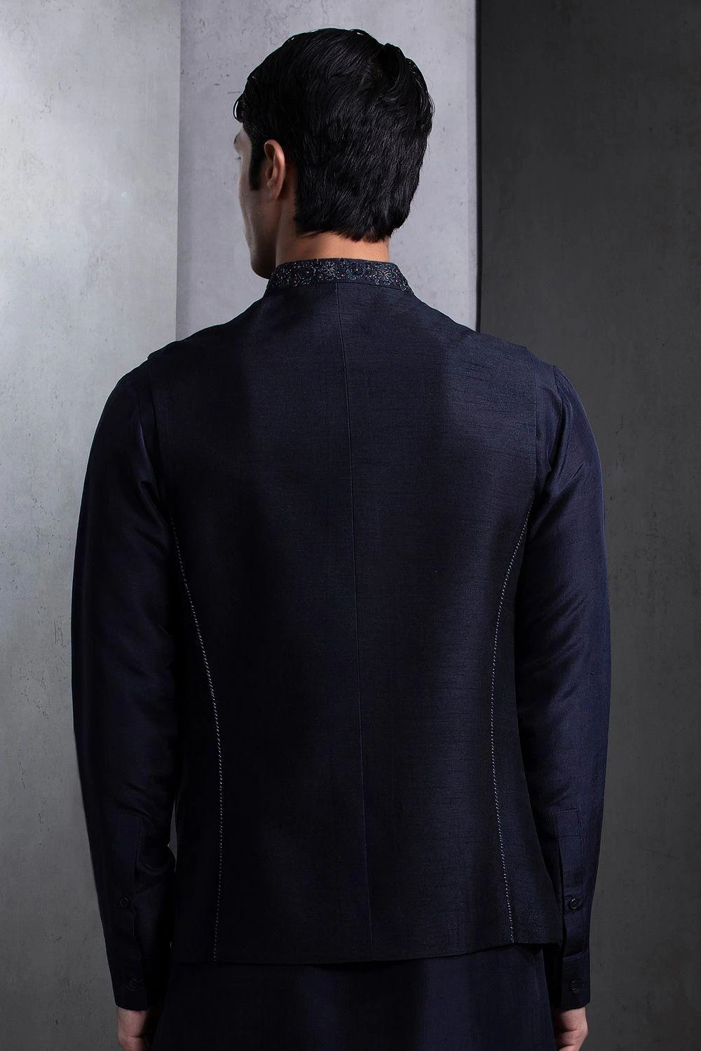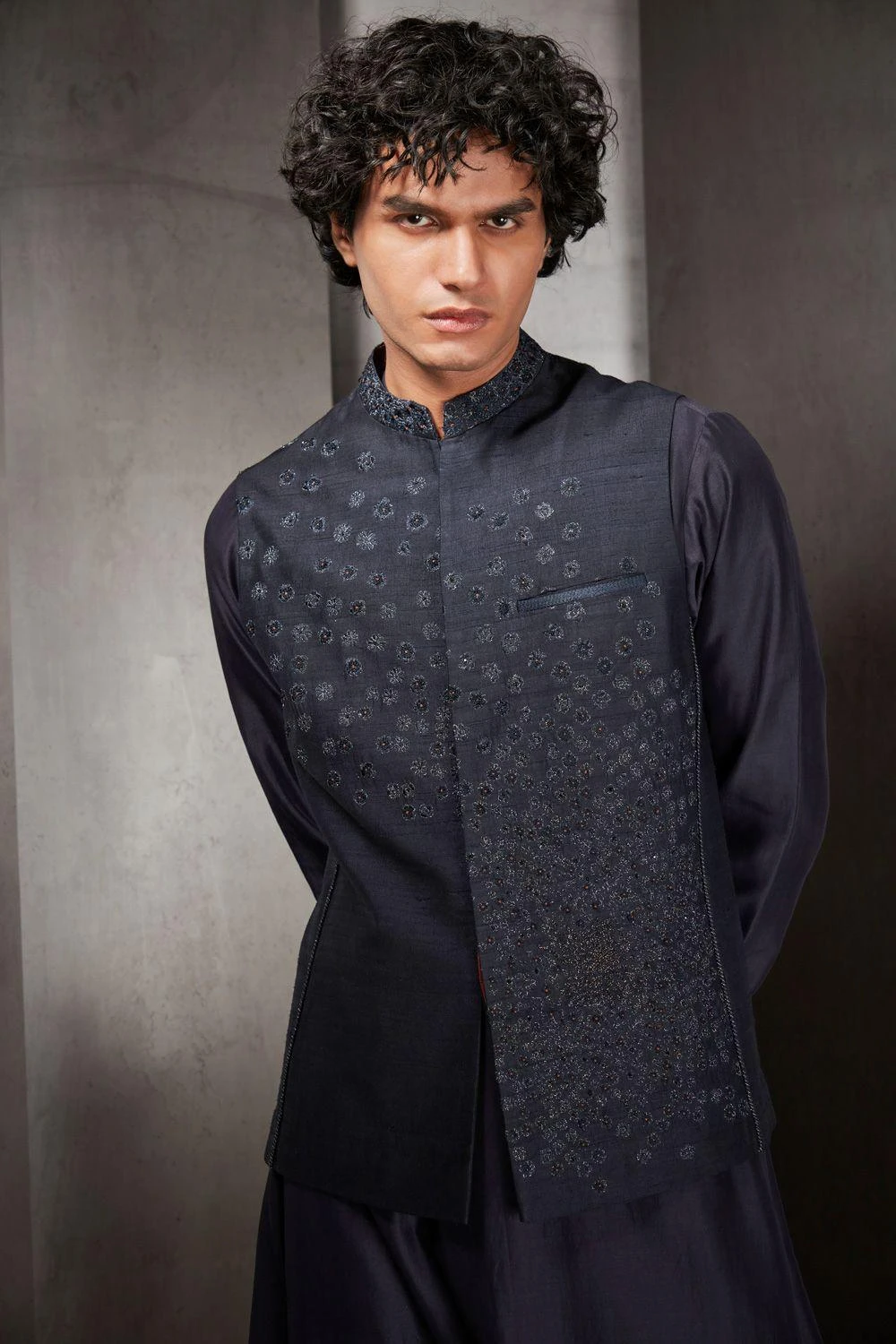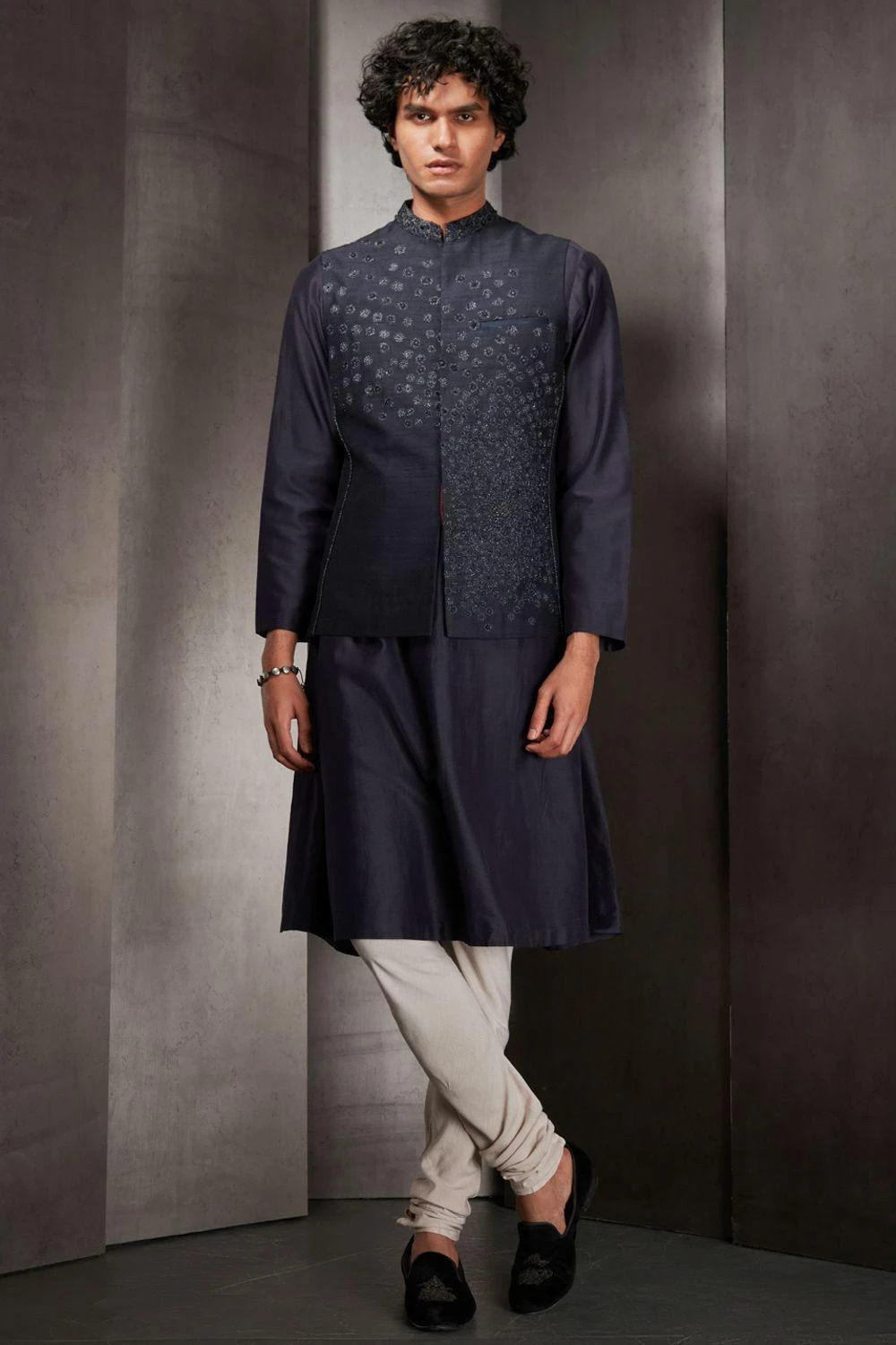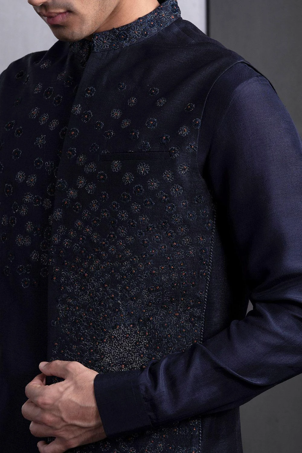 Drape in Navy Raw Silk Opulence, a hand-crafted masterpiece adorned with vibrant resham swirl daisy embroidery. Discreet fastening adds allure. Perfect for the sangeet, elevate your celebration in structured elegance.