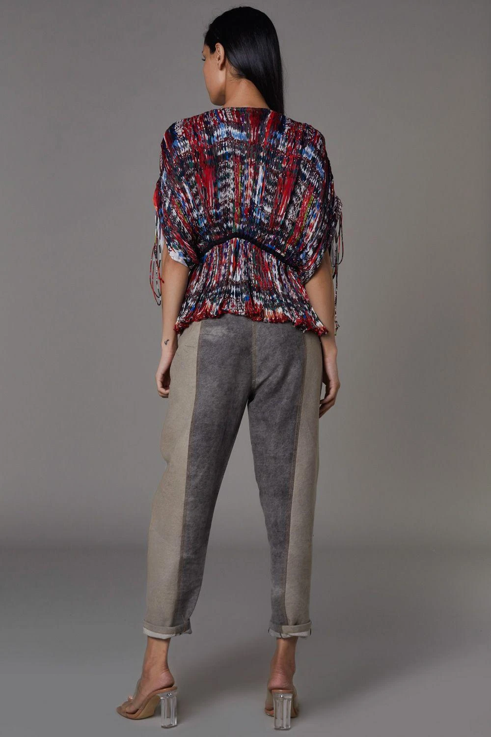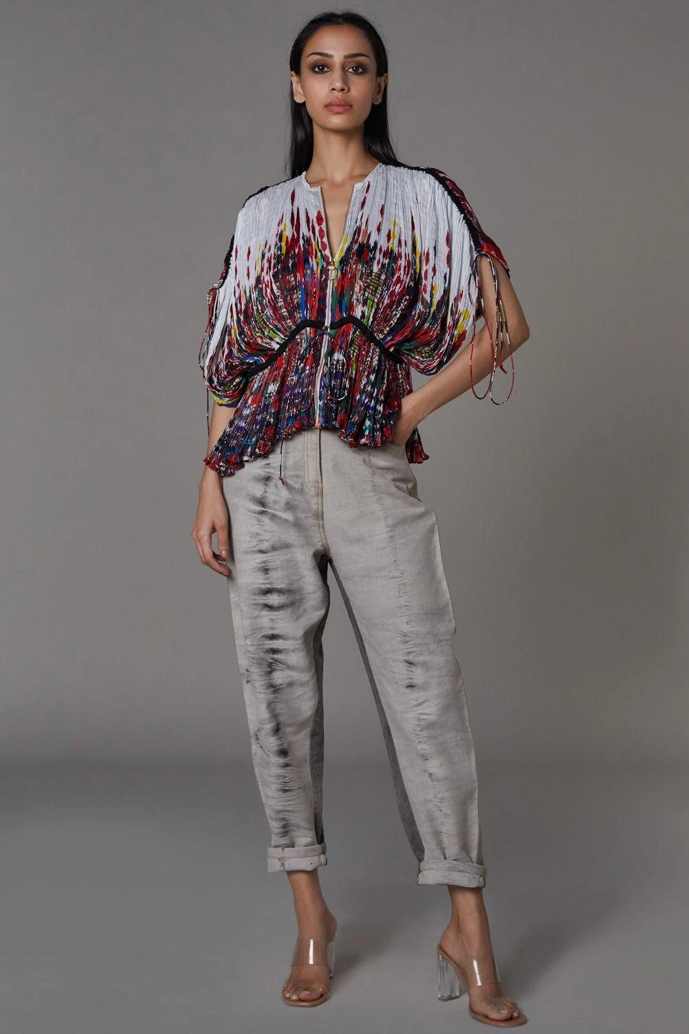 This one of a kind kaftan top is set in Saaksha Kinni’s signature hand micro pleated fabric. The intricate pleats and unique print lends for a one of a kind look.
