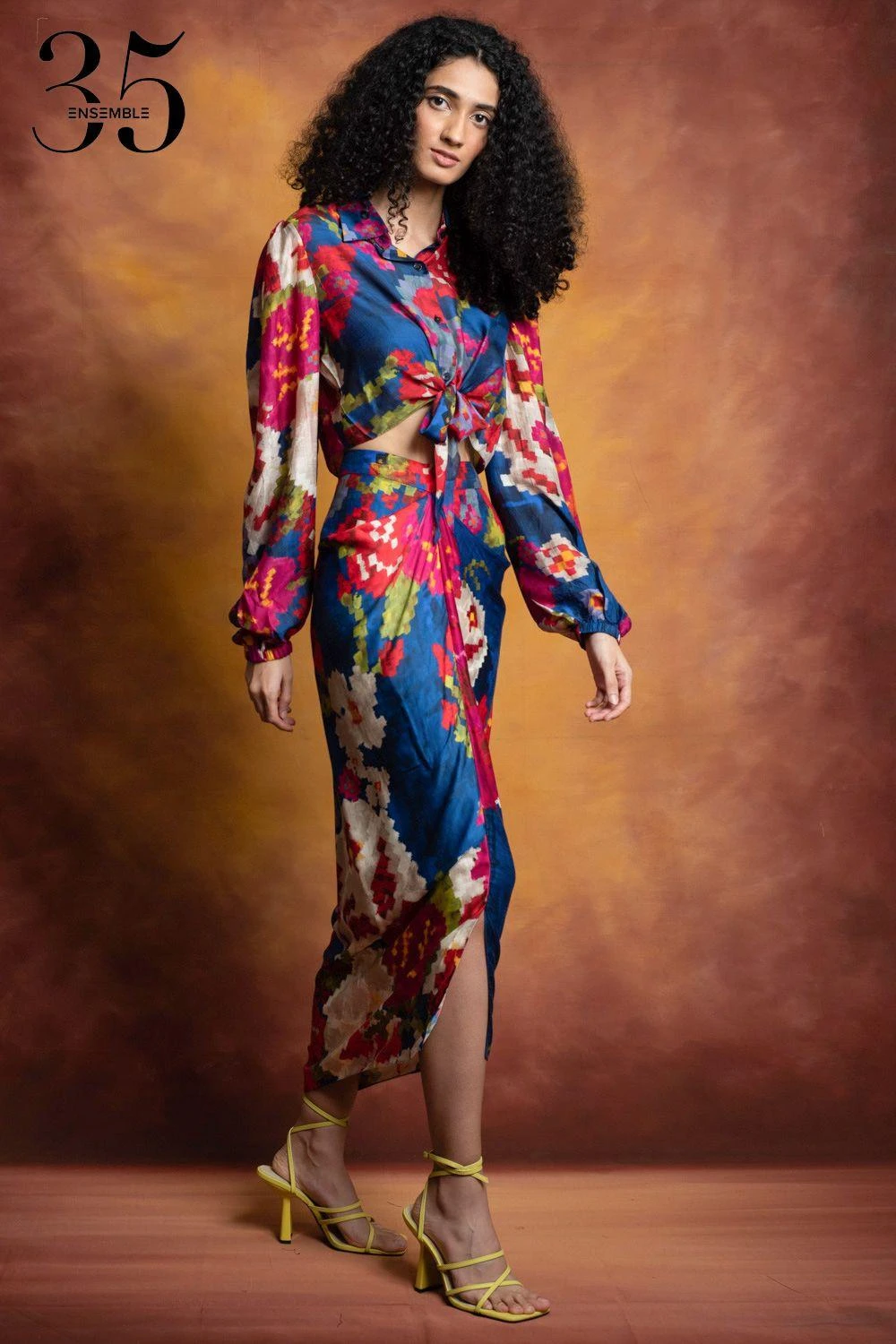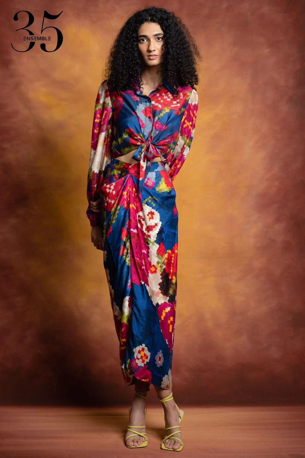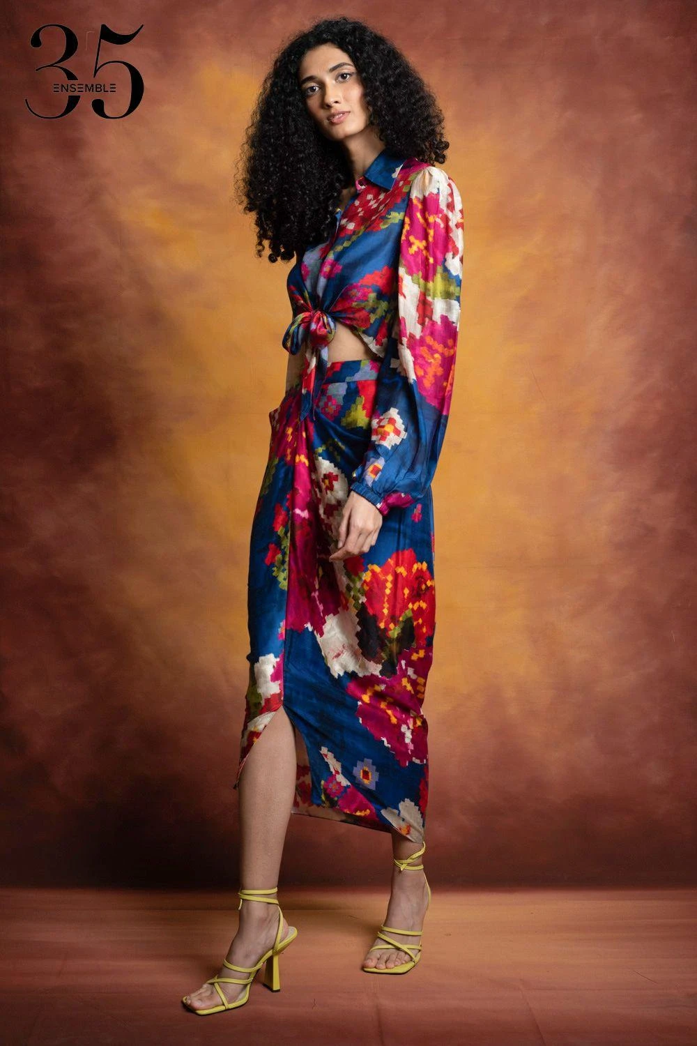 A yearlong celebration of its 35th anniversary telling the story of modern Indian fashion. Crafted in cotton silk, this collared shirt features a floral print with tie-up detail at the front. Pair this top with a skirt from the collection.