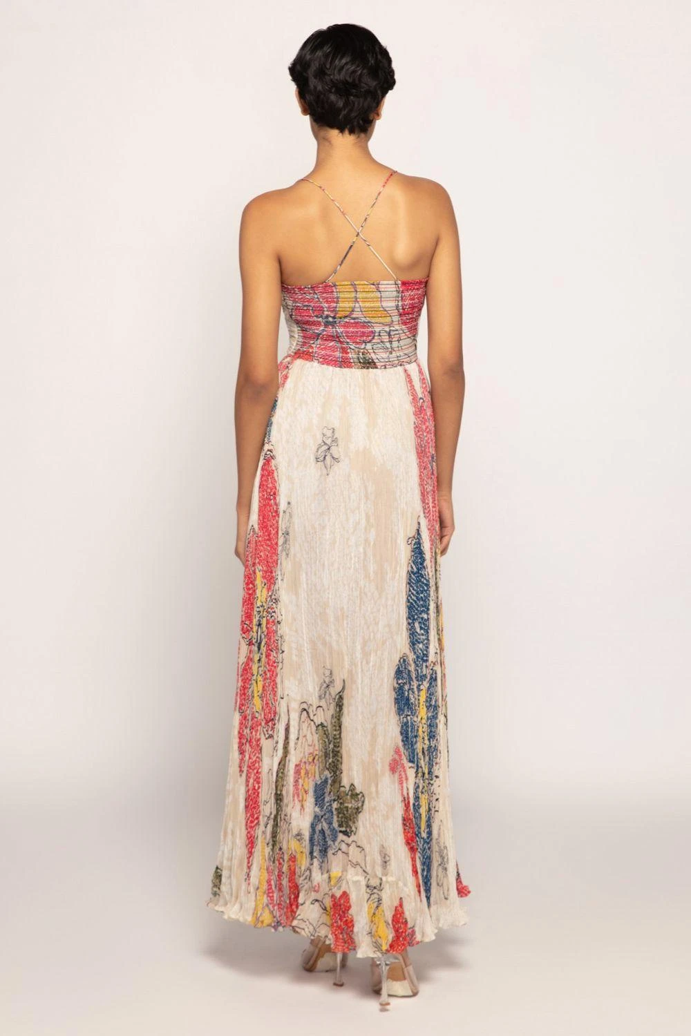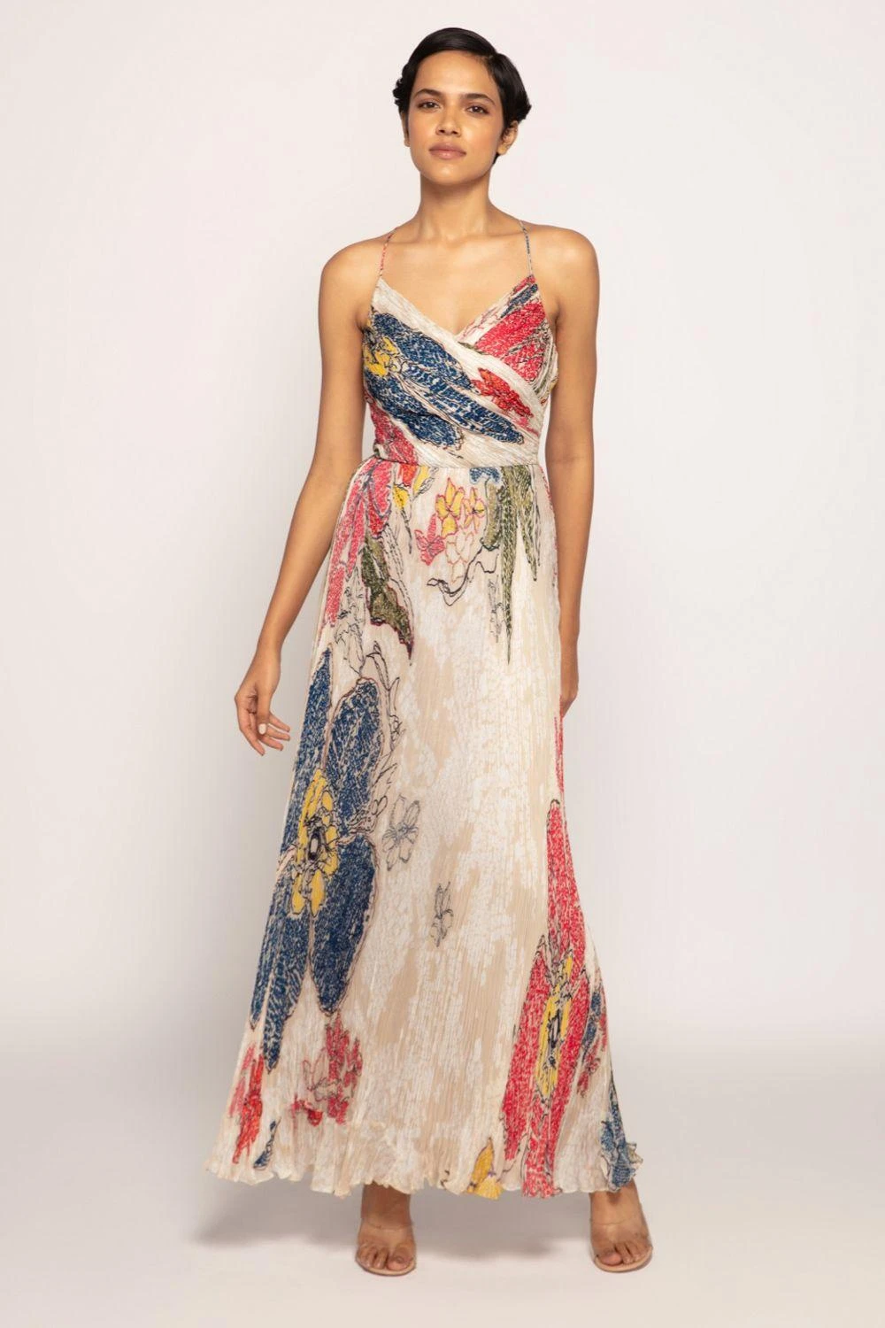 Elevate your style with this Periwinkle Bandhani Print Hand Micro Pleated Cross Over Bustier Maxi Dress, featuring adjustable straps for a chic and comfortable look.
