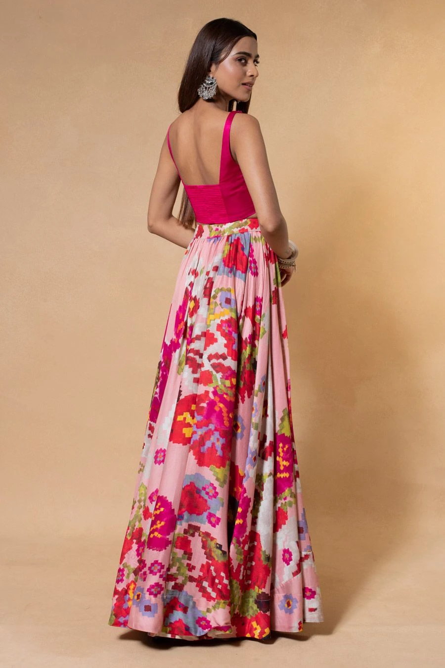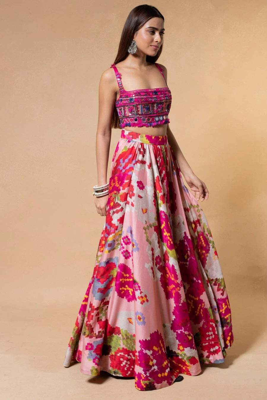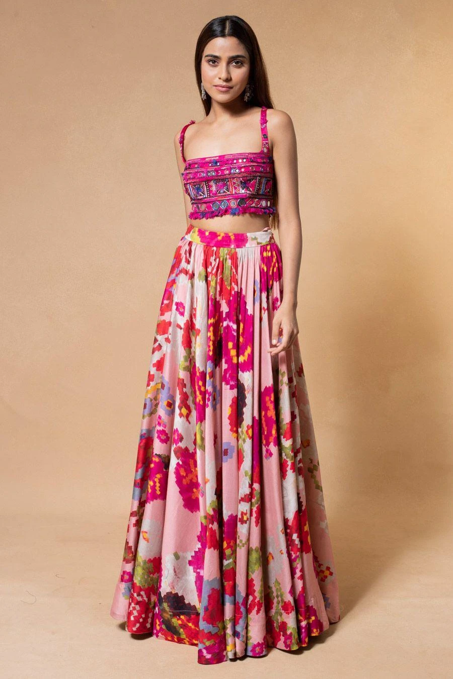 The perfect amalgamationh of style & comfort, this lehenga set is perfect for daytime festivities. Crafted in chiffon & cotton silk, this set features a mirror embellished bustier paired with an abstract printed lehenga.