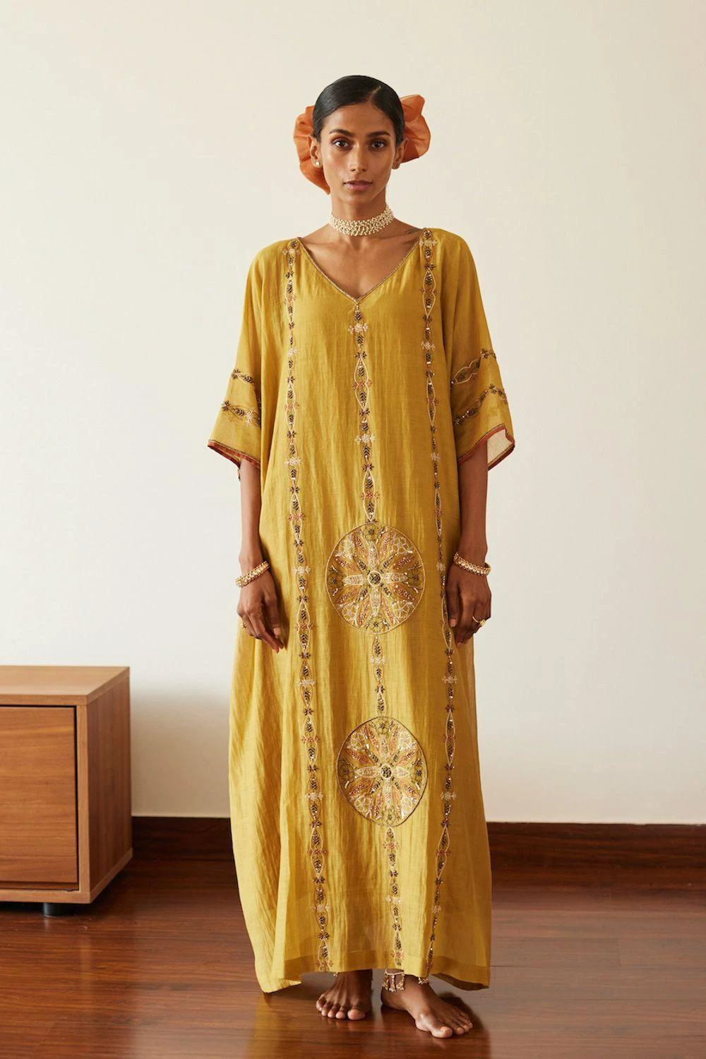 Elevate your festive wardrobe with this Yellow Uday Kaftan, a masterpiece of sartorial craftsmanship that exudes timeless allure. Add a pair of statement earrings to complete the look.