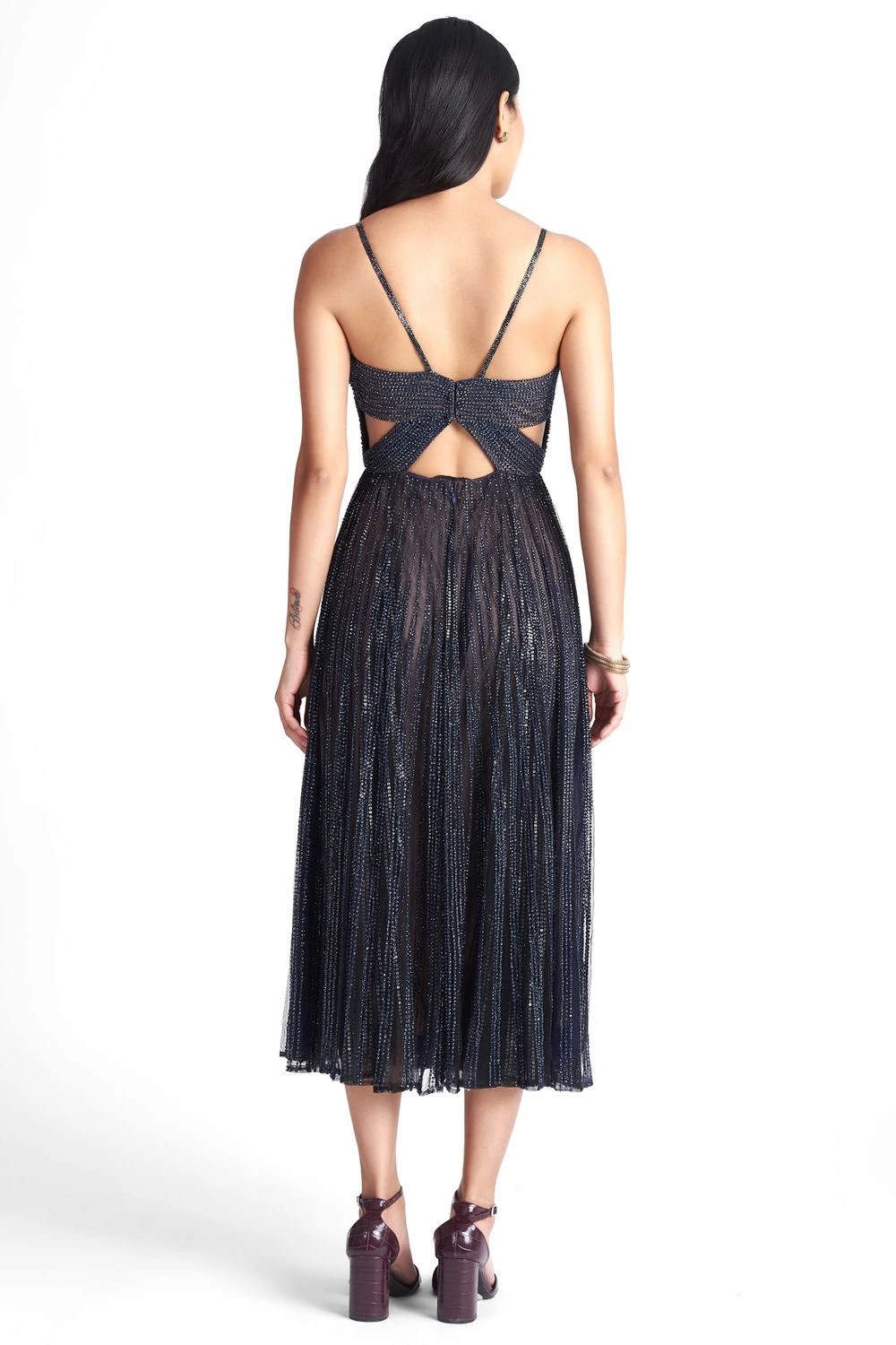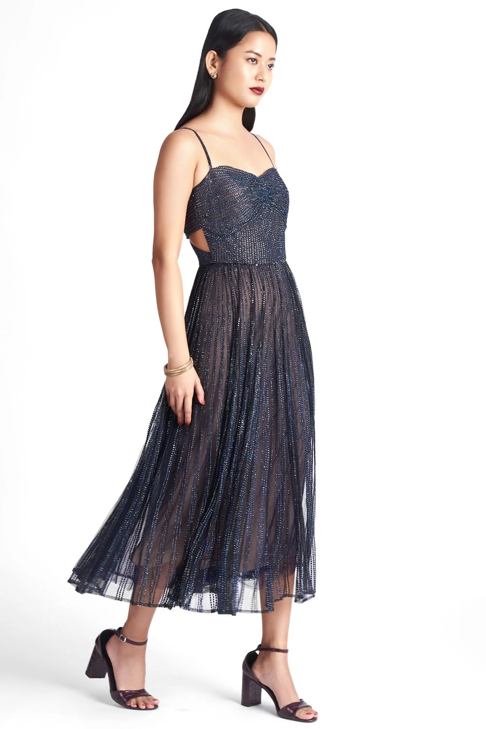 This hand embellished strappy midi dress features a pleated skirt, navy blue crystal embroidery & a corseted bodice. The back has cut out details.Style this feminine piece with a clutch & heels to complete the look.