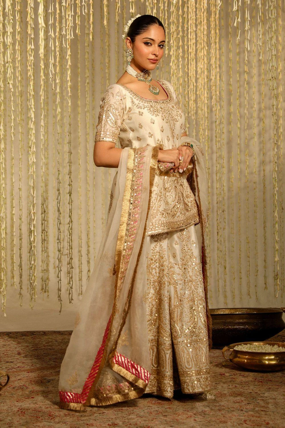 Elegance echoes in Mazneen’s pure silk chanderi kurta set, adorned with kirandori & sitaara, boasting a round scoop neck & graceful elbow sleeves. Paired flawlessly with a sharara & silk organza dupatta, it’s a delicate symphony of luxury.
