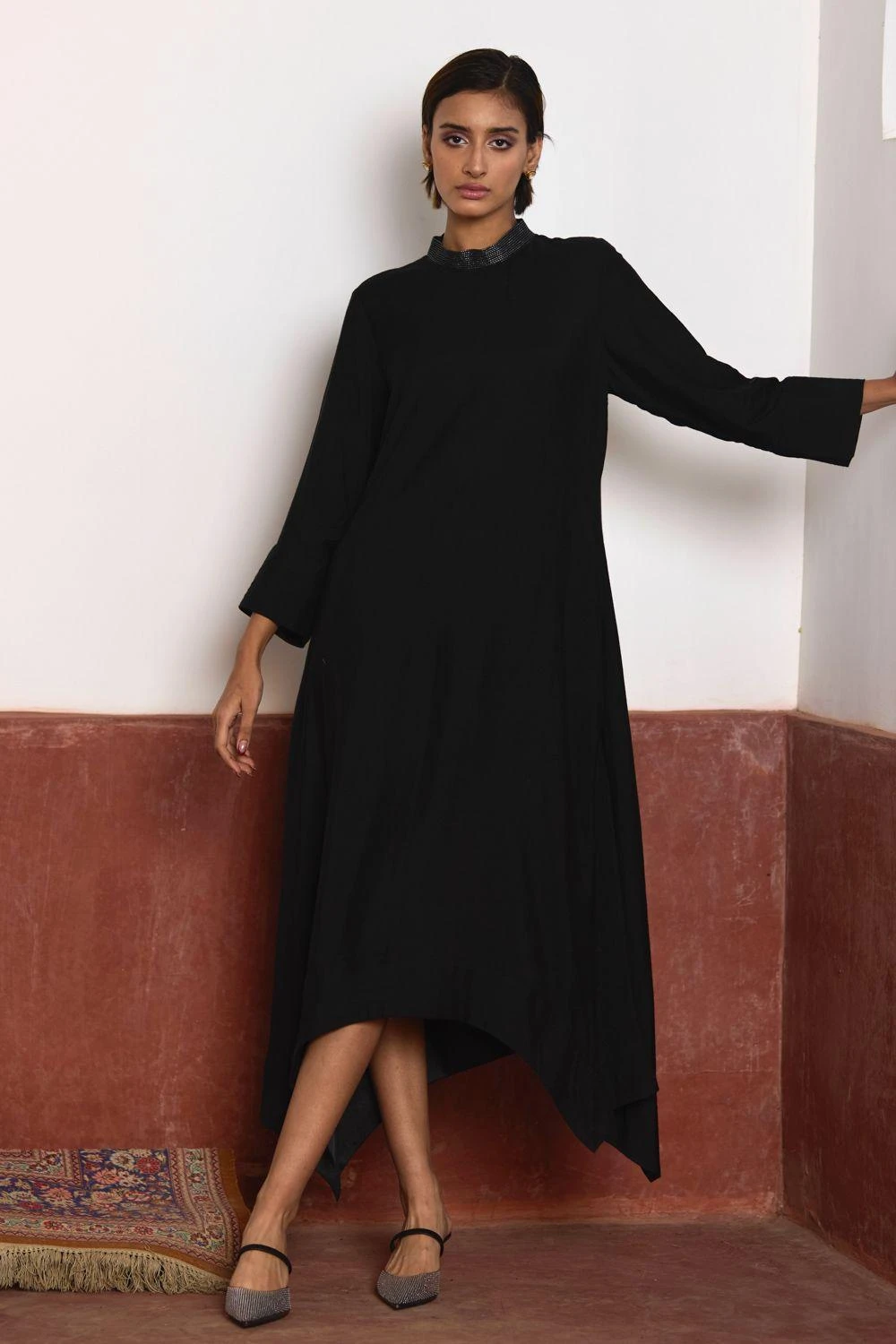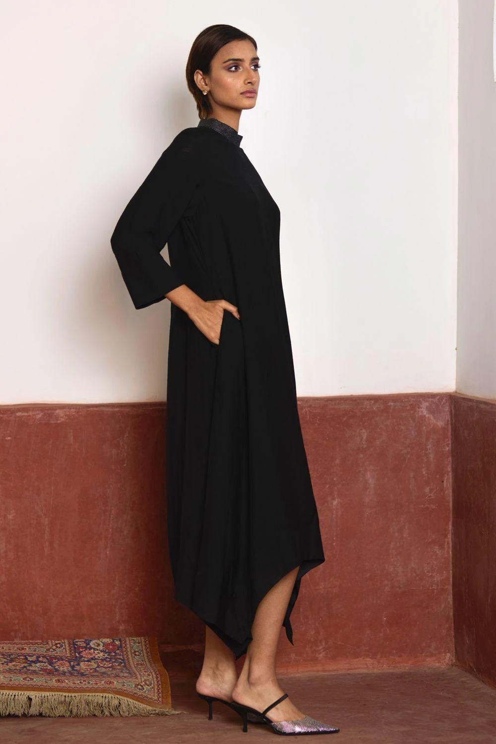 Introducing Shorshe’s black silk asymmetric dress from Rumaani. Pair it effortlessly with the bestseller, blue banarasi brocade sally jacket, creating a chic ensemble ideal for a sophisticated party statement.