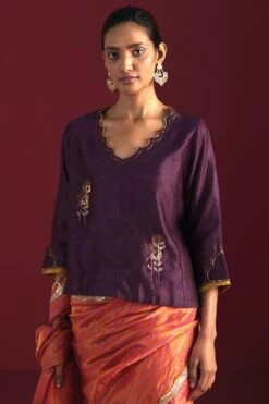 Crafted in brocade, this blouse features a santoon lining. Pair it with a coordinating sari from the collection to complete the set.