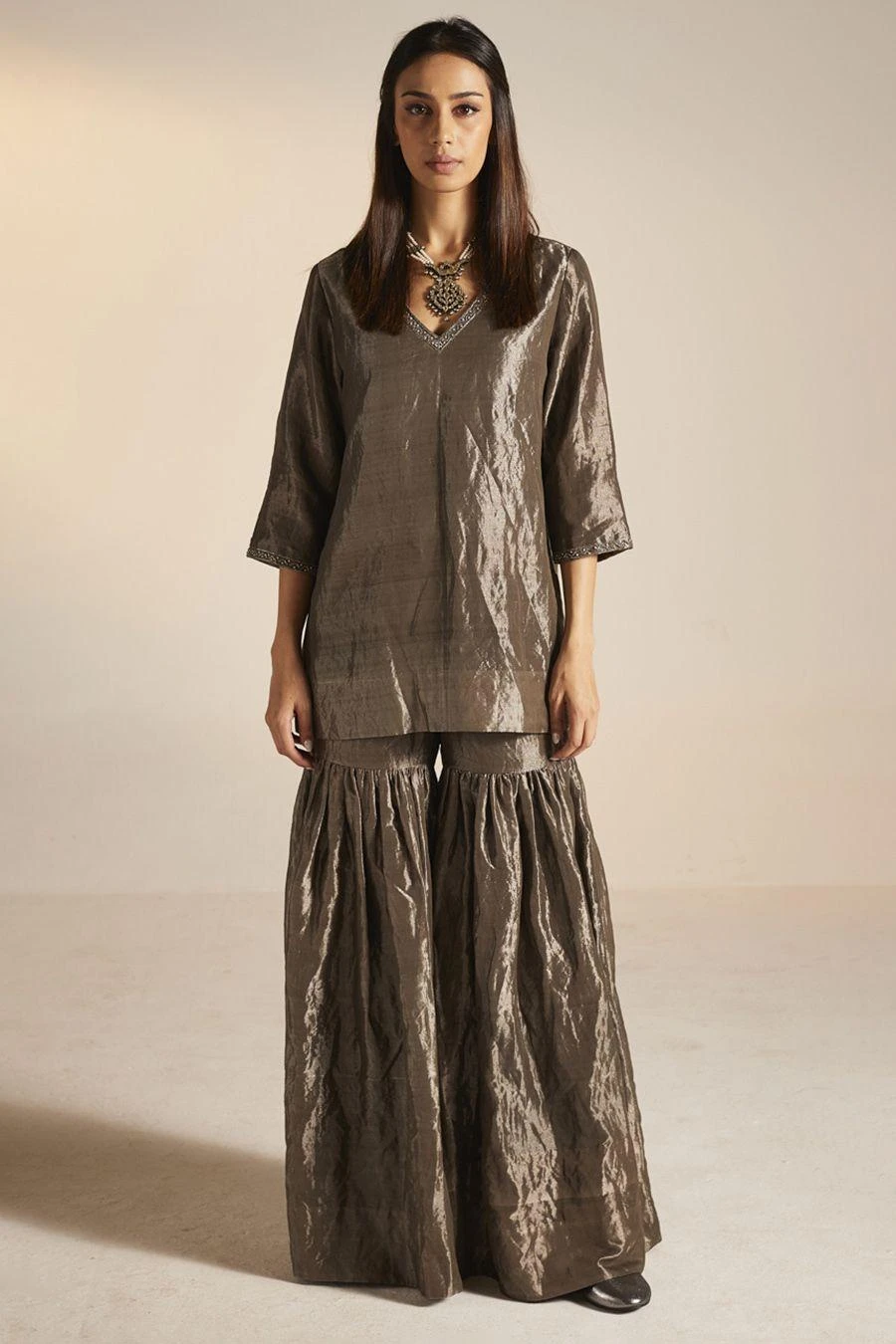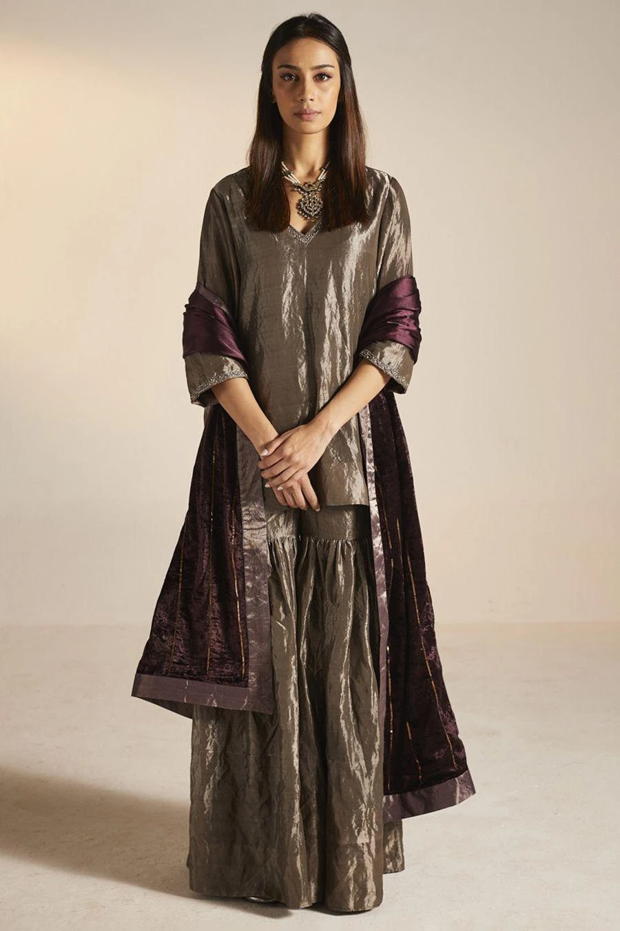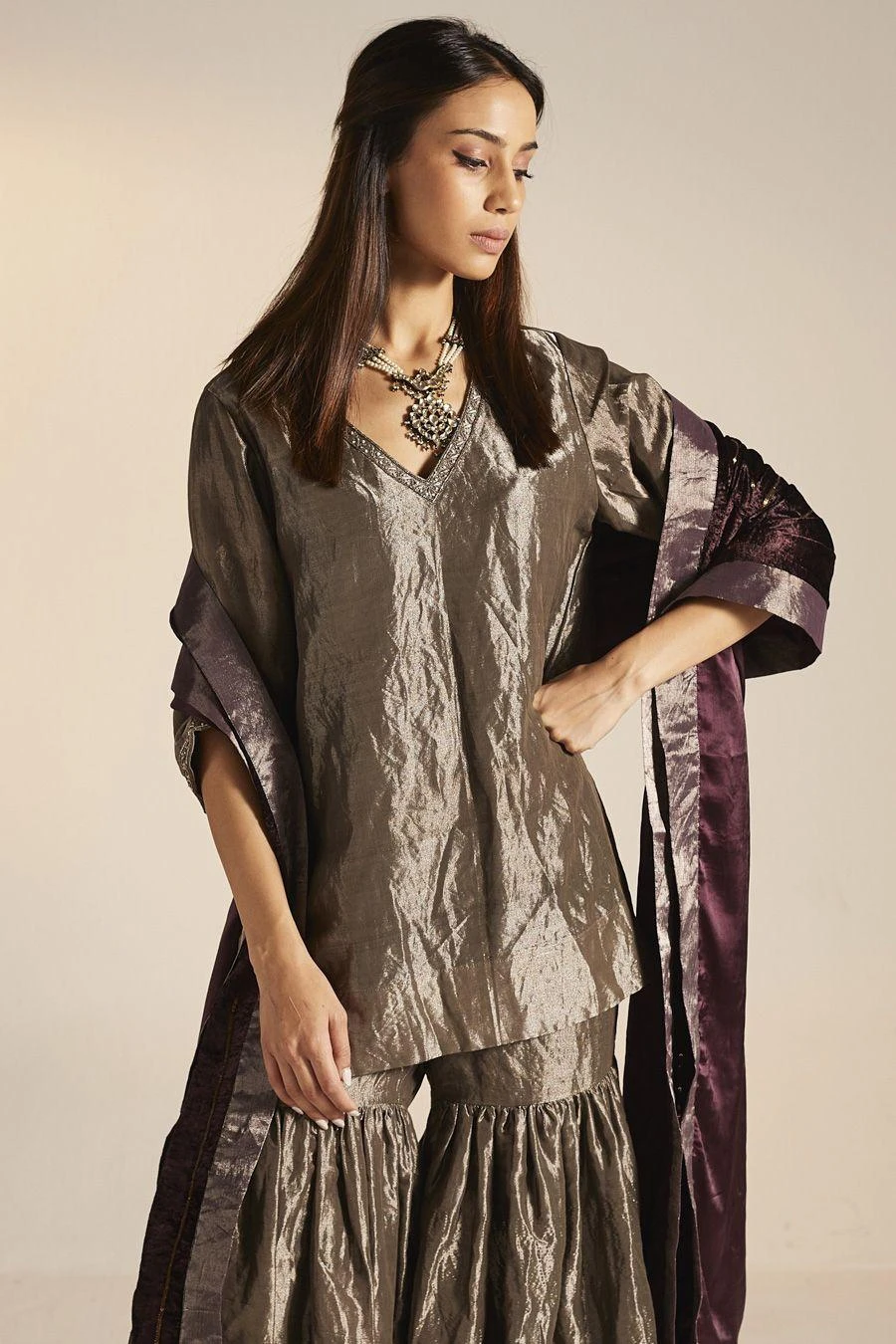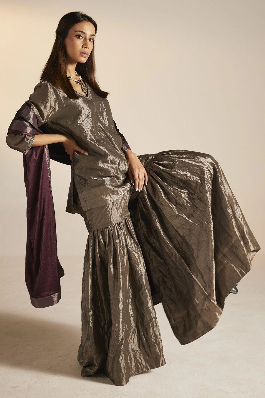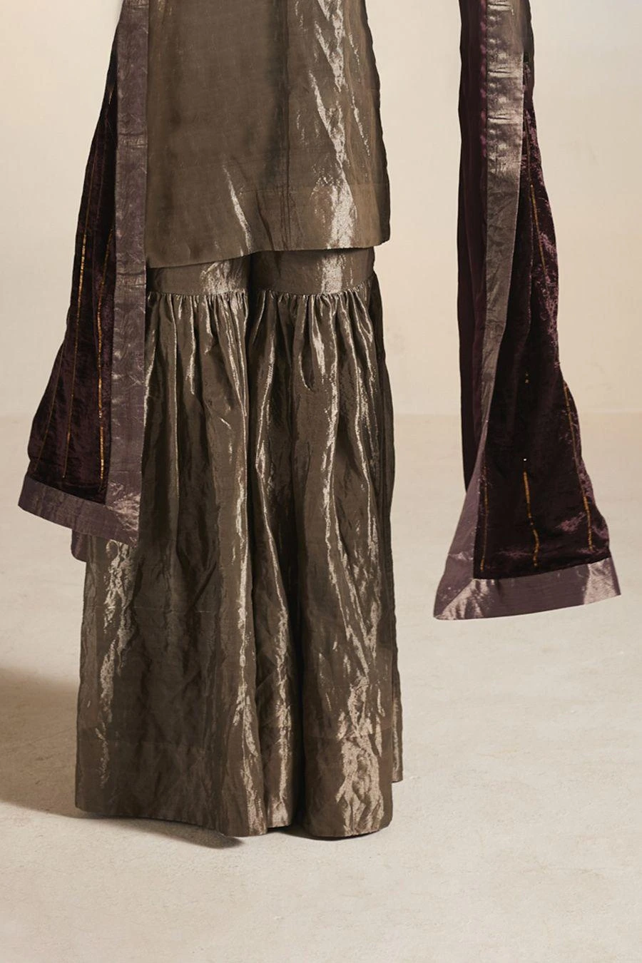 The perfect amalgamation of style and comfort, this gharara set is perfect for pre wedding festivities. Crafted in handloom tissue, this set features a short kurta paired with gharara. Add a pair of statement earrings to complete the look.