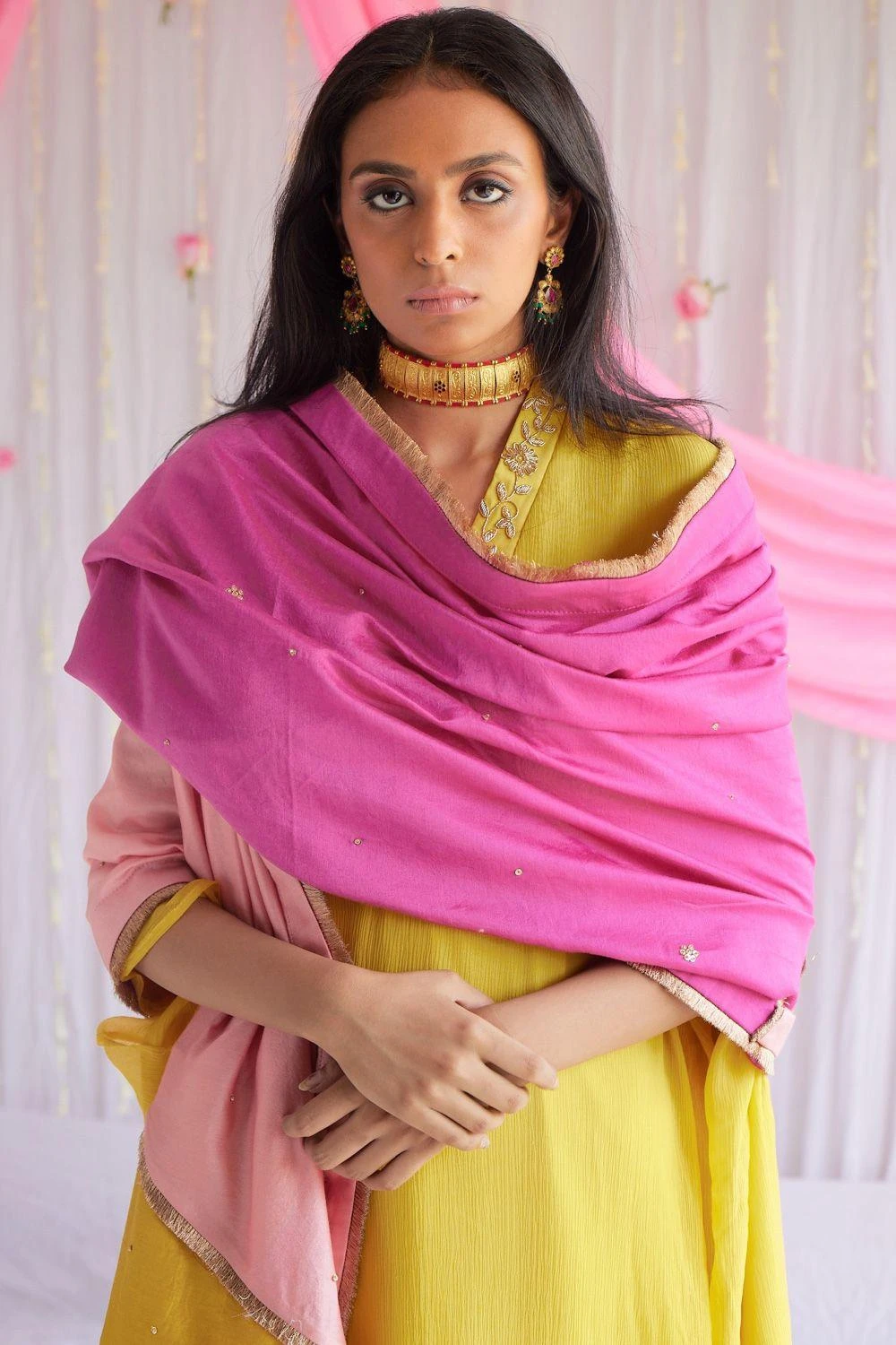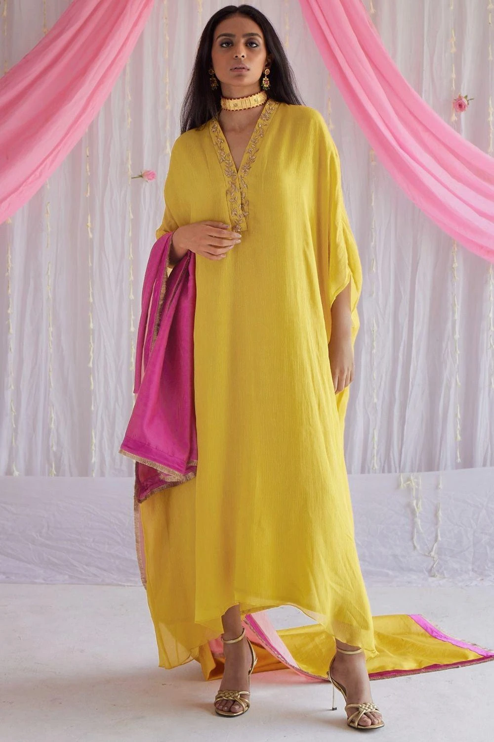 Fuss-free & elegant, this marigold yellow kaftan is a festive staple outfit. Cut in chiffon, this kaftan features hand embroidered details. Style it with a pair of flared pants and polki earrings to complete the look.