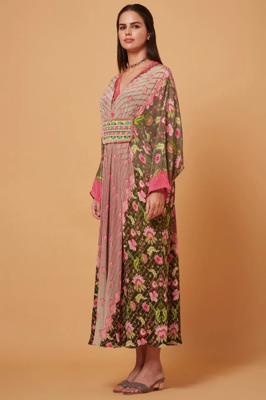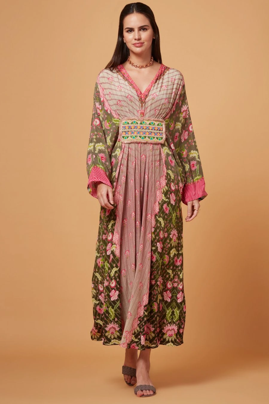 The perfect amalgamation of style and comfort, this kaftan is perfect for a day out. Crafted in pure crepe, this striped kaftan features a floral printed with an embroidered panel with pleated details.