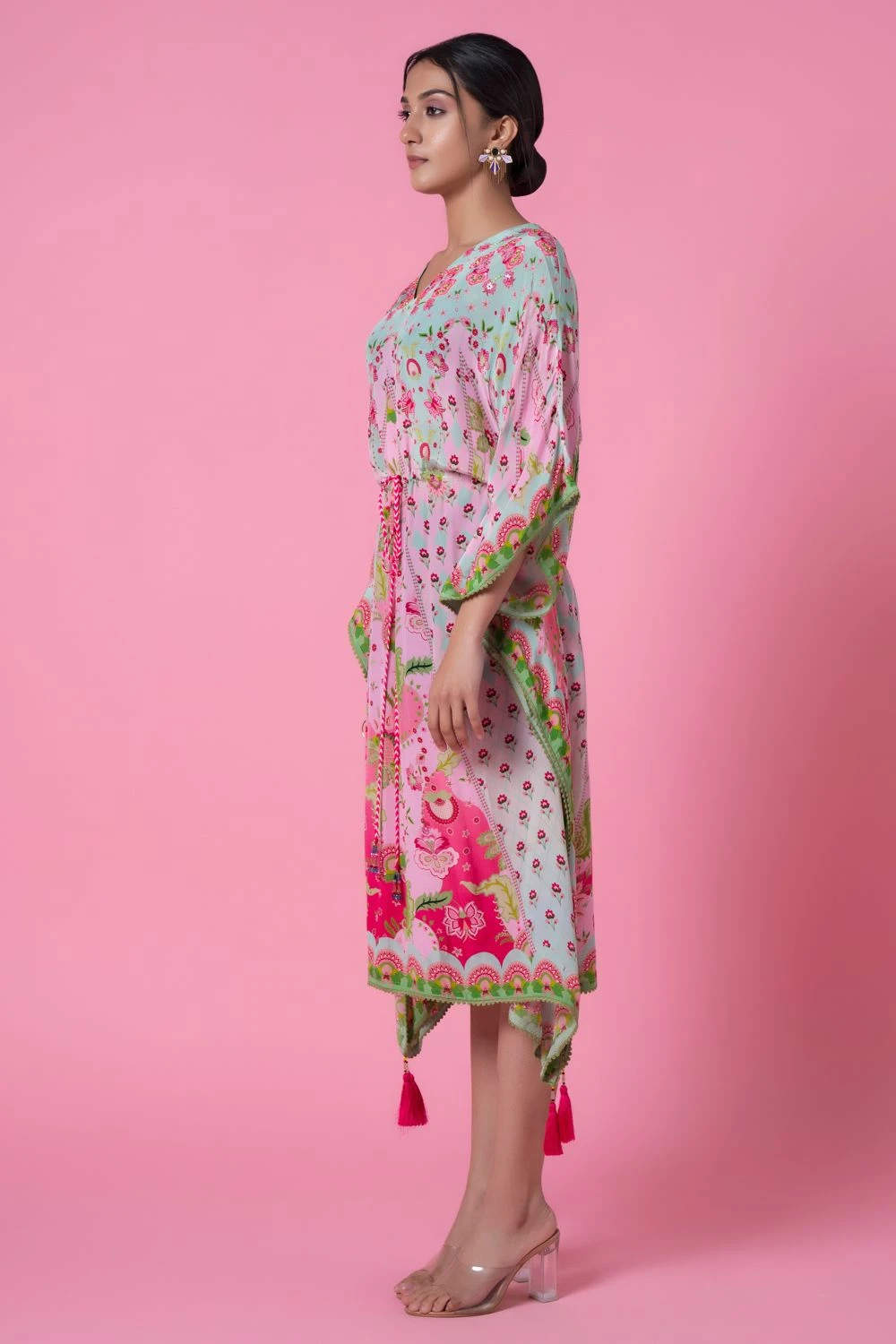 Elevate allure with this opulent floral printed kaftan, adorned with embroidery, playful pom-poms & a tie-up lace detail. Perfect for elite soirÃ’es, style with jewelry for a chic & luxurious statement. Redefine elegance, make every moment exquisite.