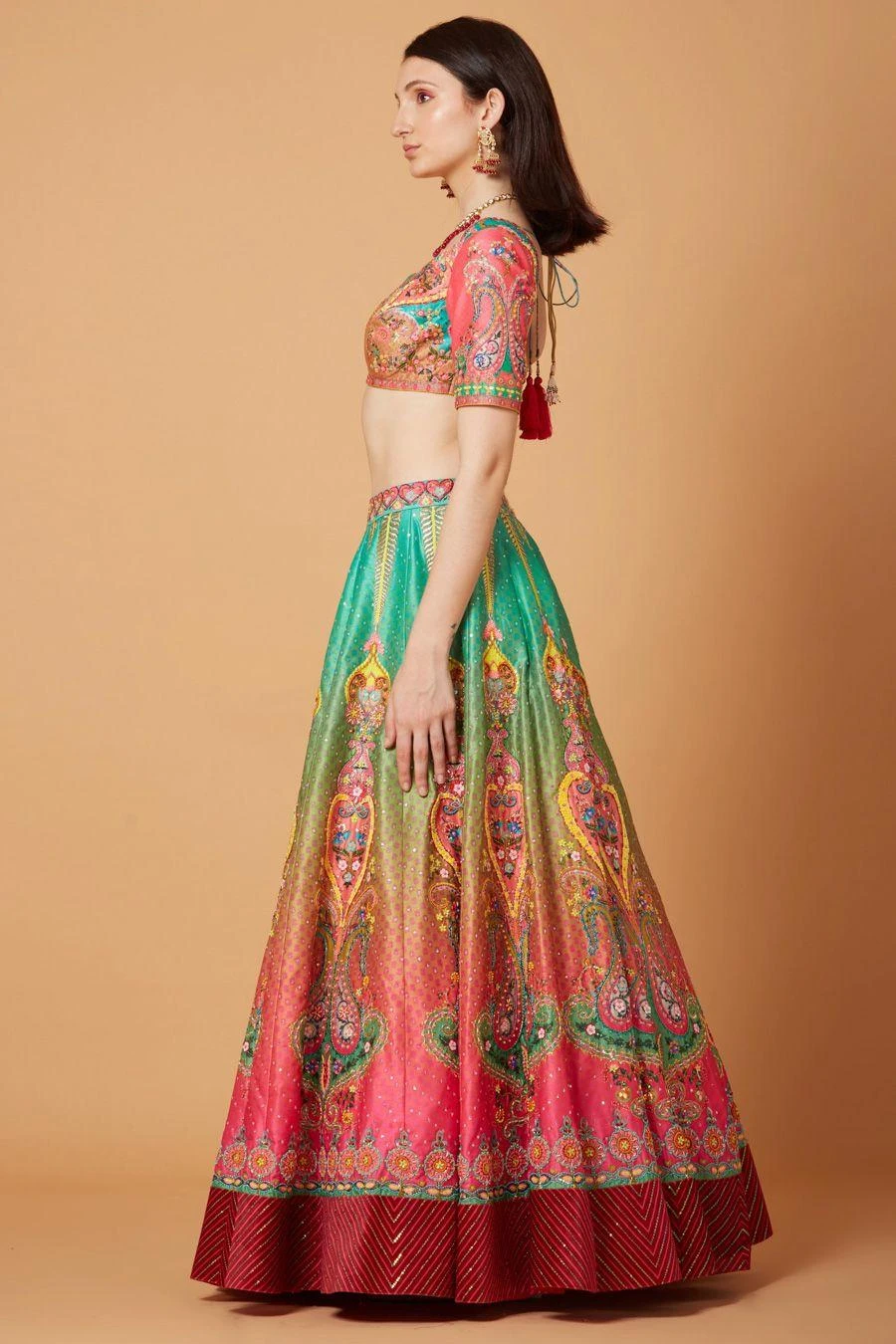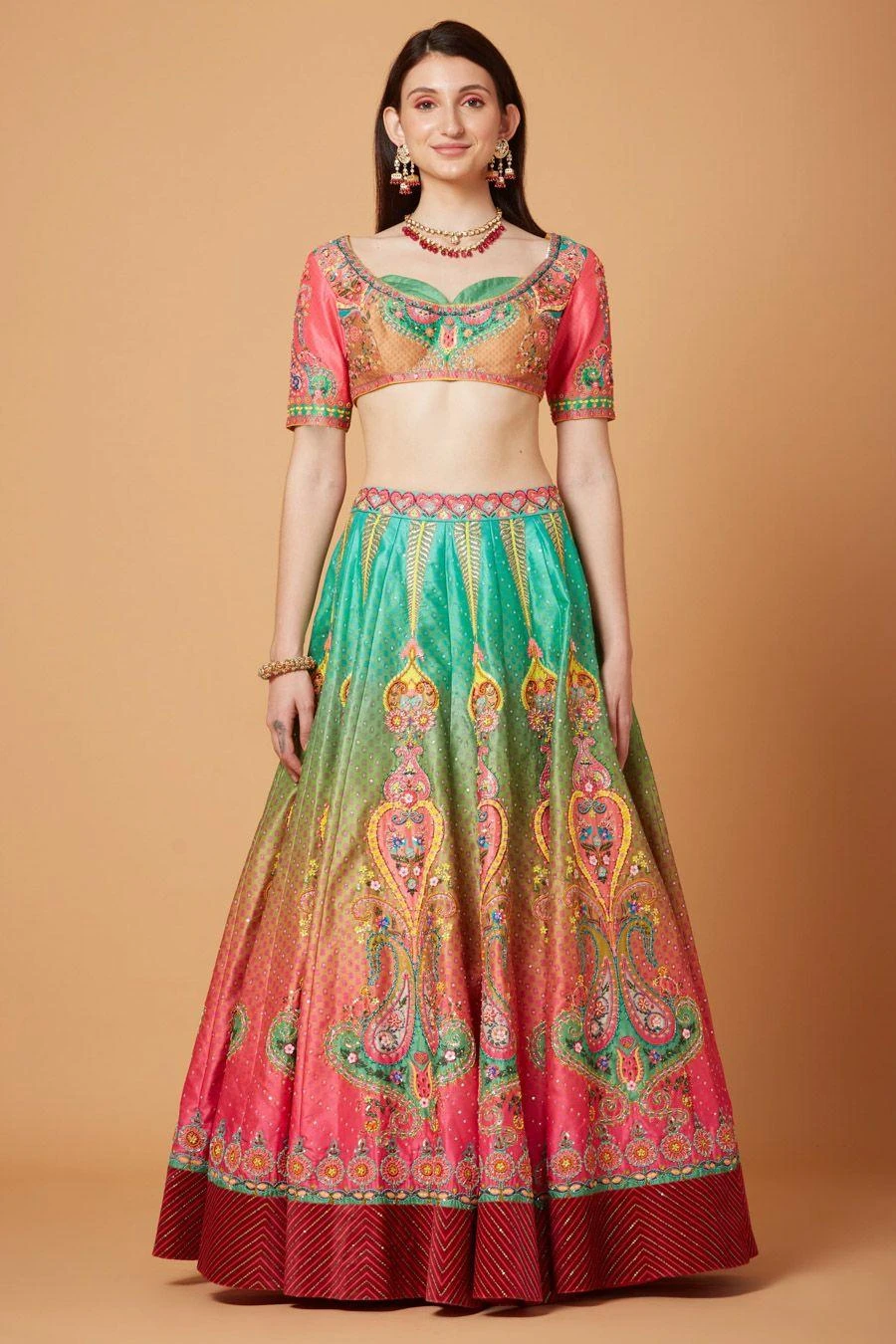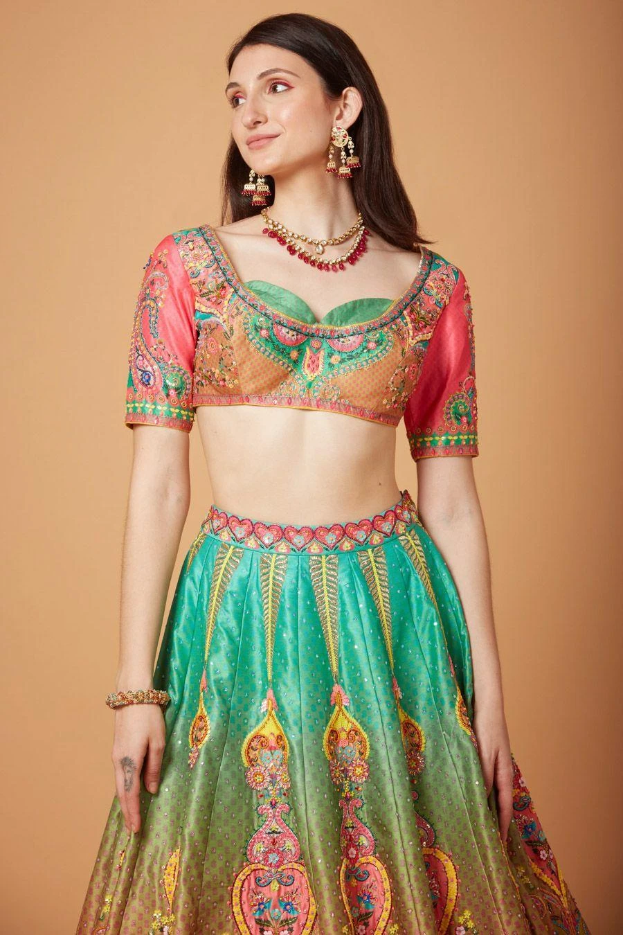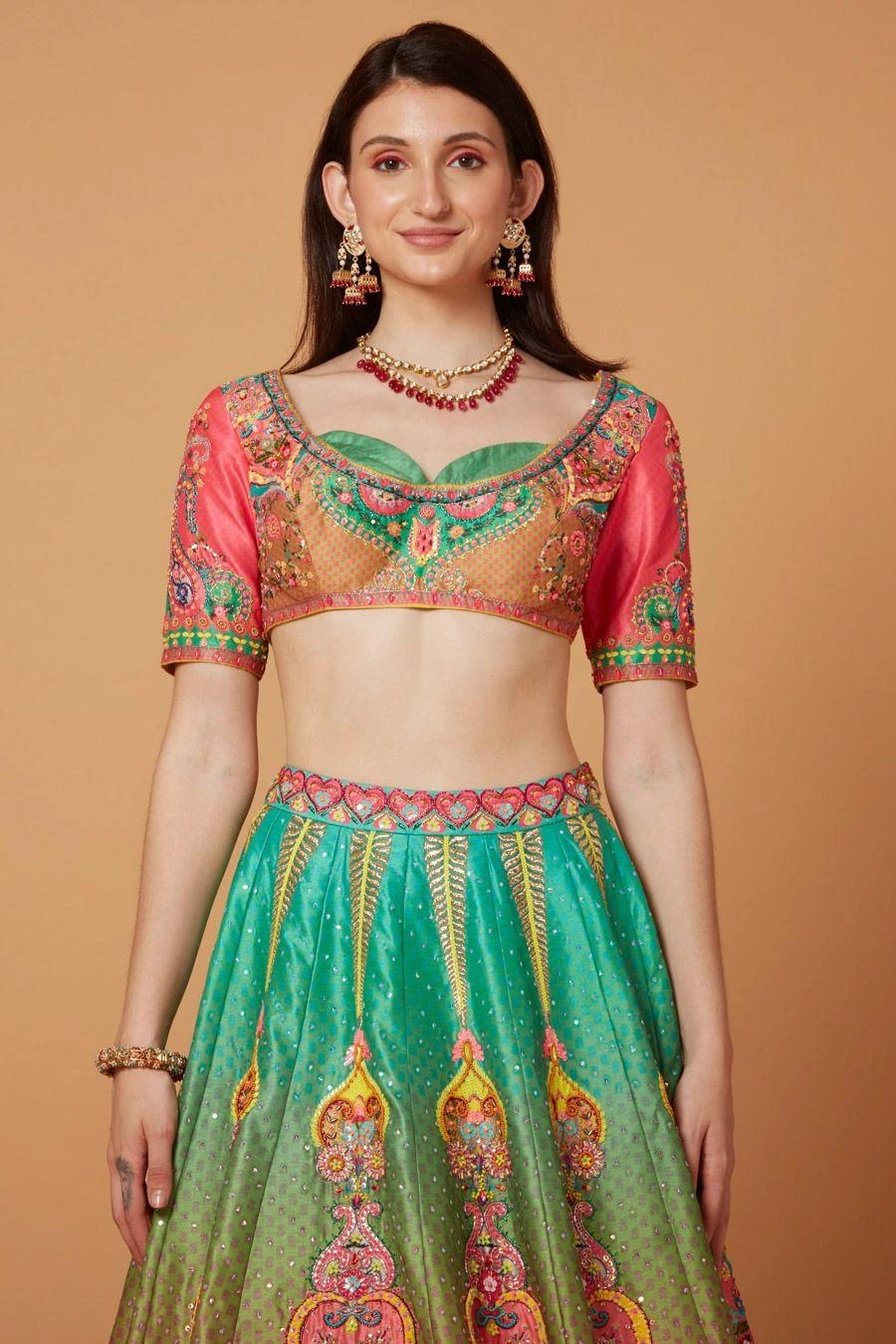 This lehenga set will see you through all kinds of celebrations this festive season. Crafted in dupion and net, this set features a hand embellished blouse paired with a lehenga and dupatta. Add a pair of statement earrings to complete the look.